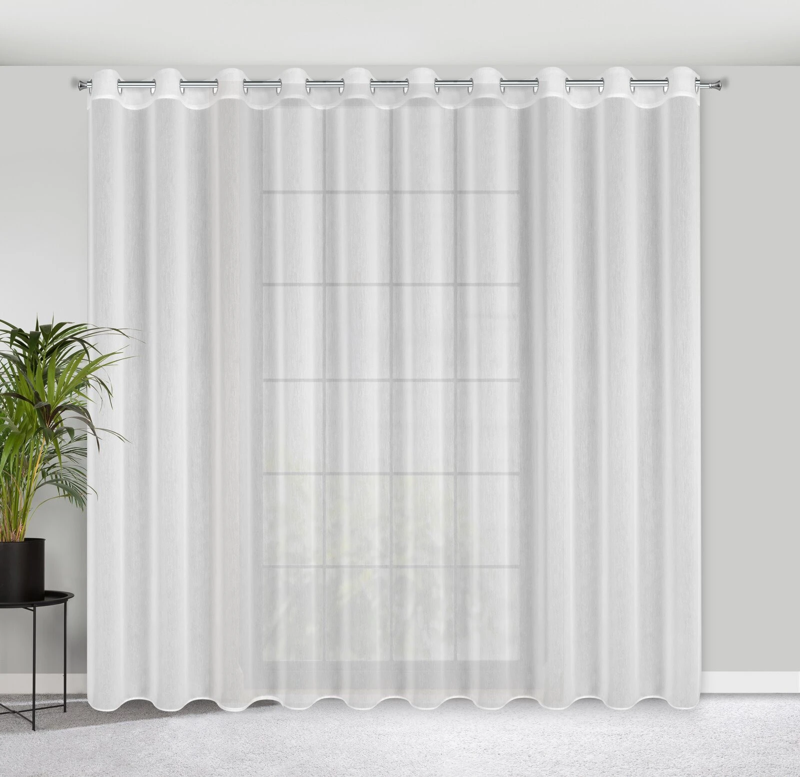 - Firana jednokolorowa o strukturze drobnego deszczyku ze złotą nicią szerokość: 300 cm, długość: 250 cm, kolor: biały, Gramatura: 55 GSM, Skład: 100% poliester
