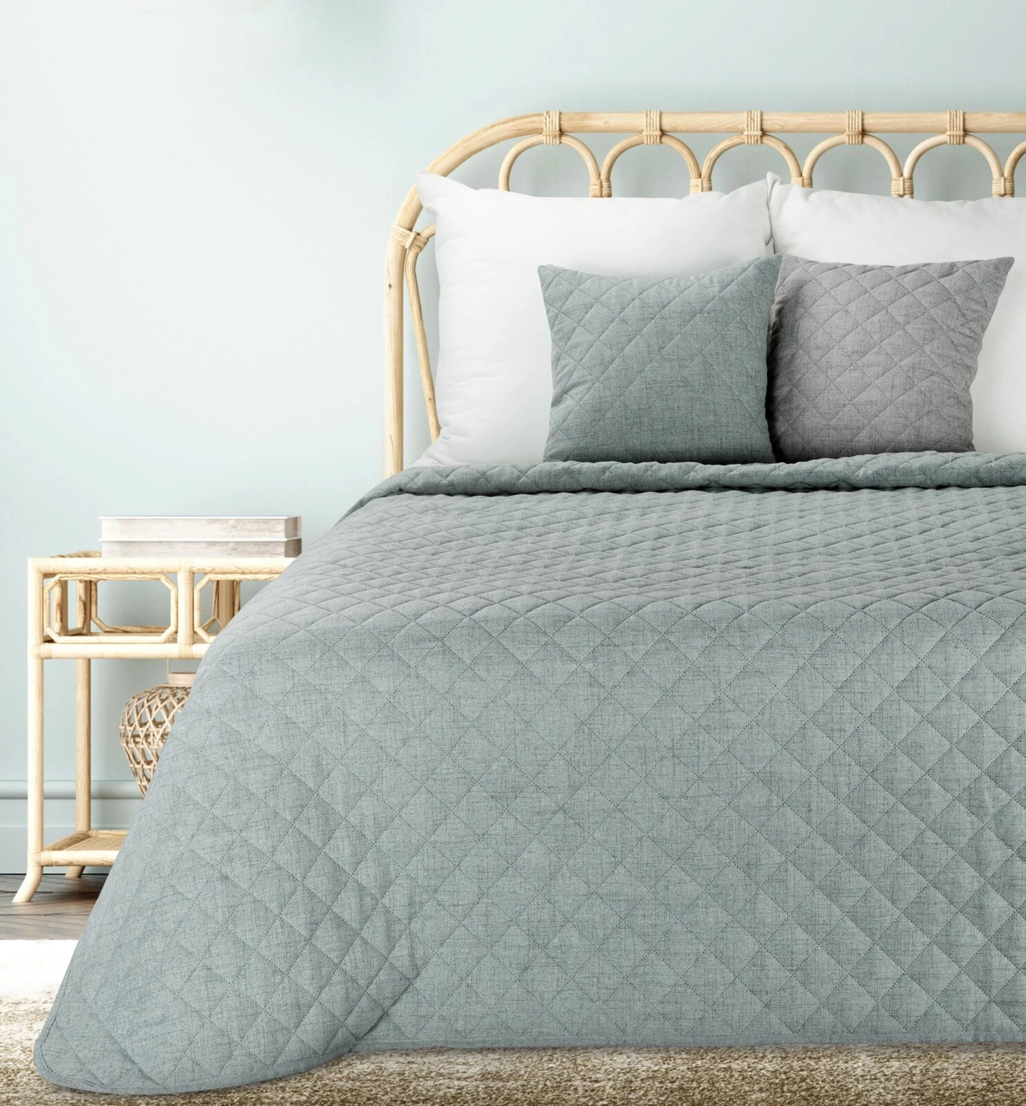 - Narzuta hot press imitująca len szerokość: 170 cm, długość: 210 cm, kolor: miętowy, Gramatura: 140+120+70 GSM GSM, Skład: 100% poliester