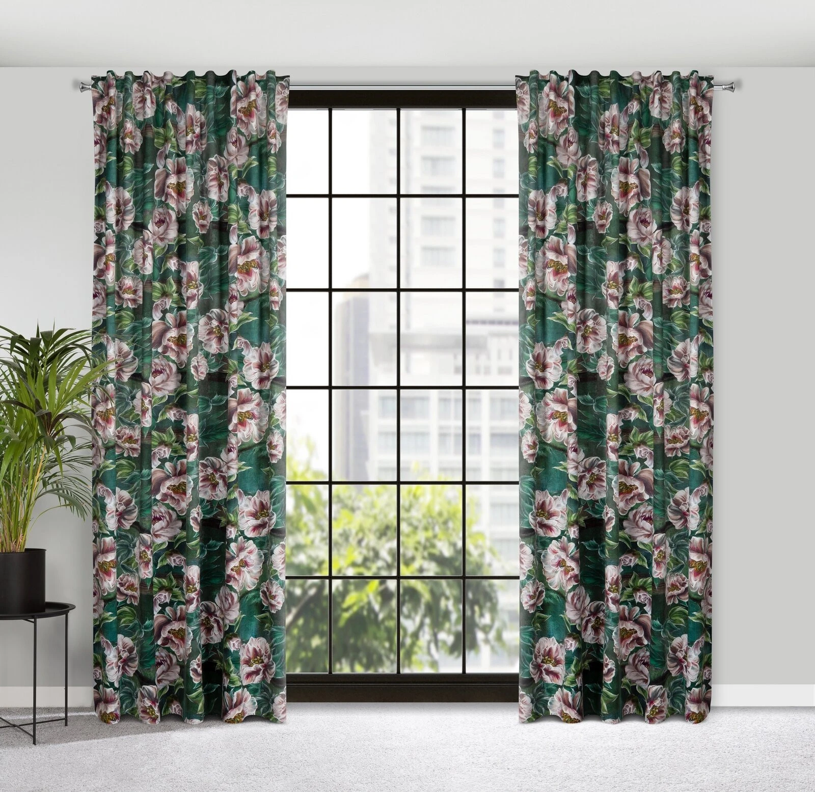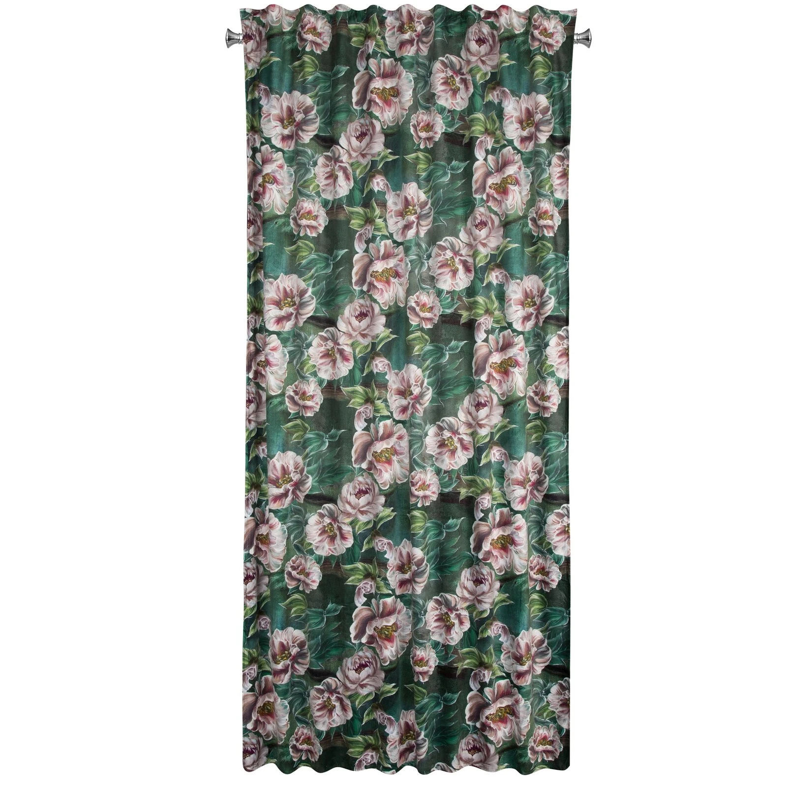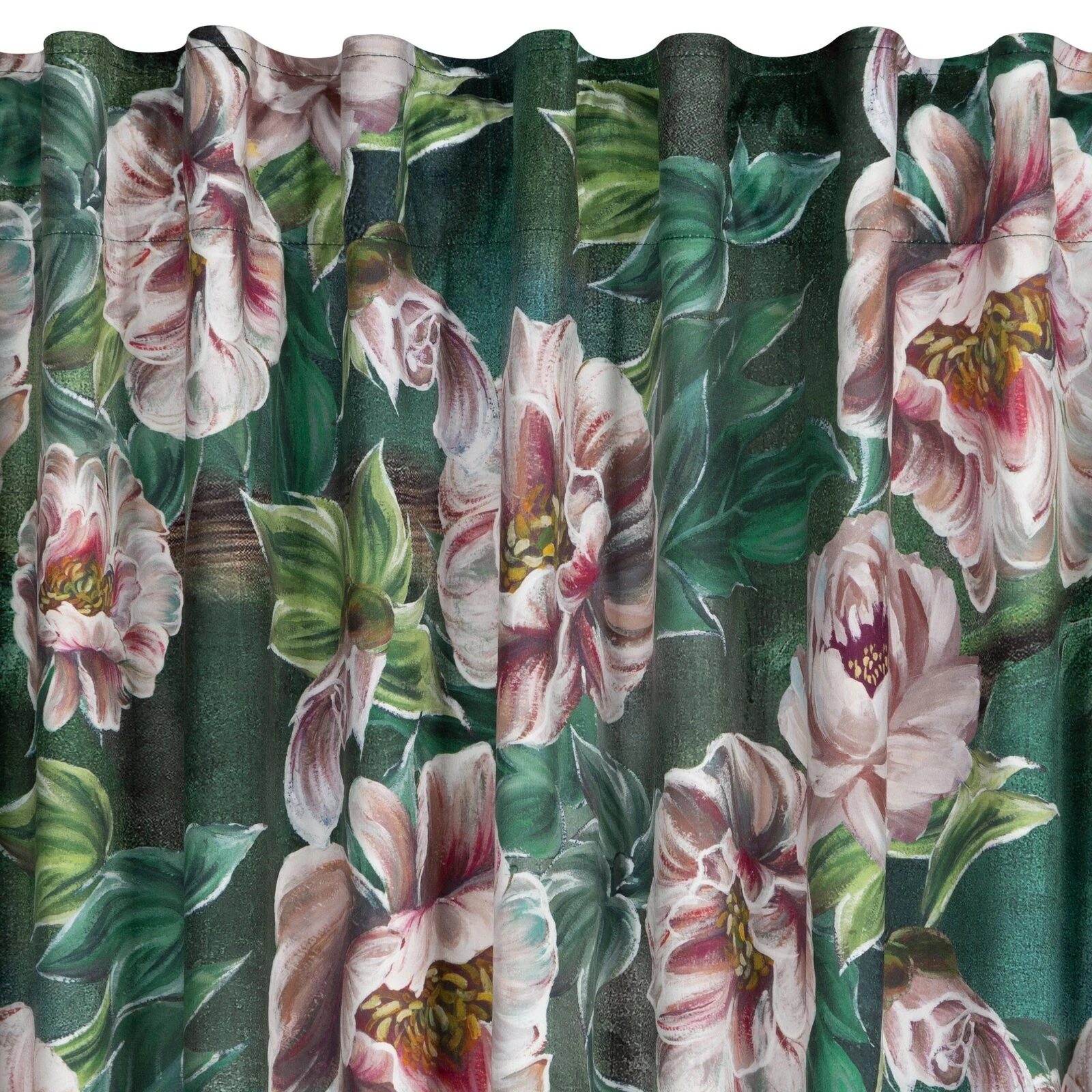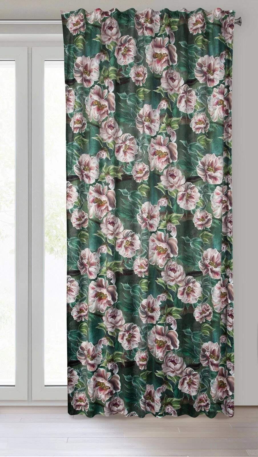 - Zasłona welwetowa na taśmie z ukrytymi szelkami z kwiatowym nadrukiem szerokość: 140 cm, długość: 270 cm, kolor: zielony, Gramatura: 200 GSM, Skład: 100% poliester