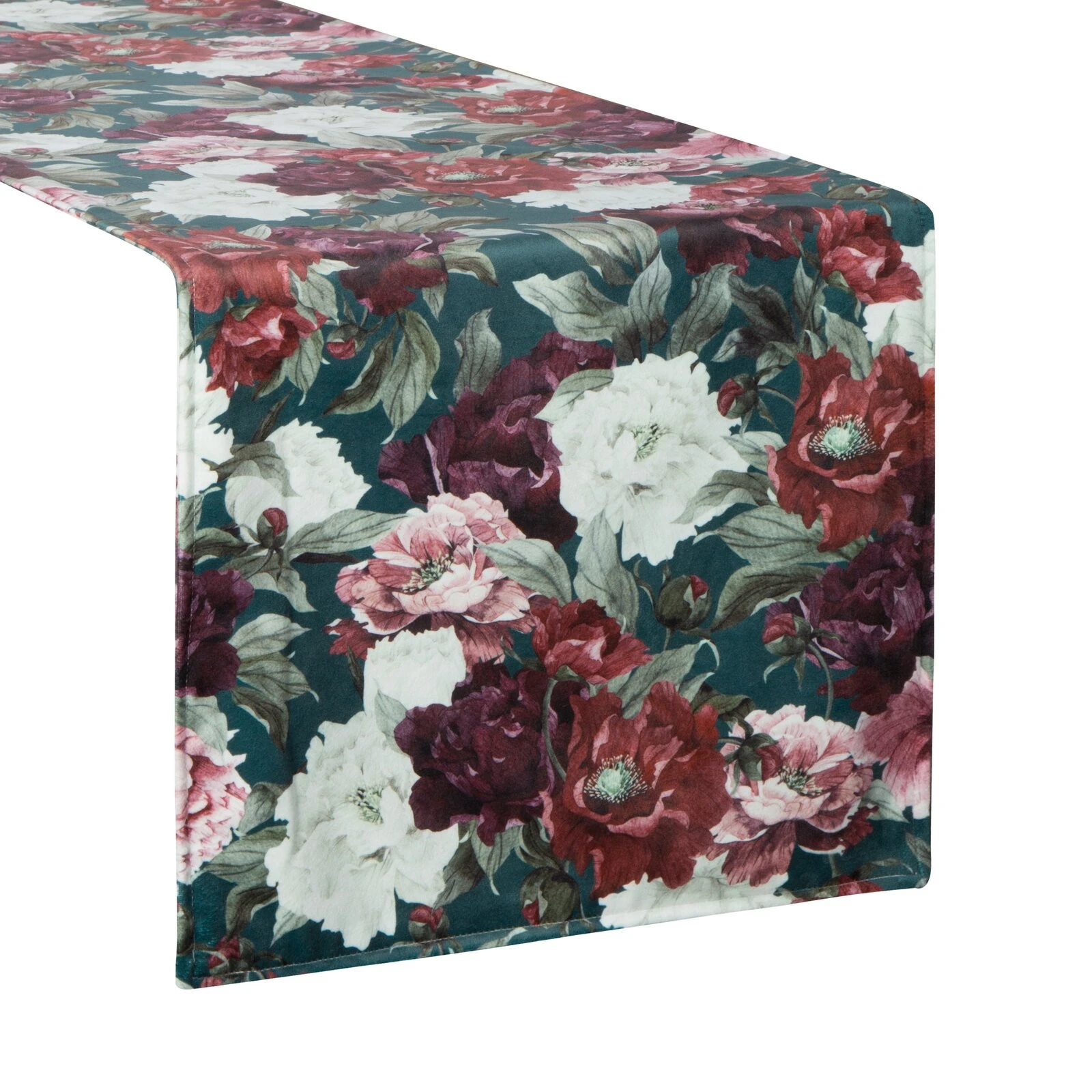Obrus dekoracyjny welvetowy dwustronny ze wzorem kwiatowym szerokość: 35 cm, długość: 180 cm, kolor: zielony, Gramatura: 280 GSM GSM, Skład: 100% poliester