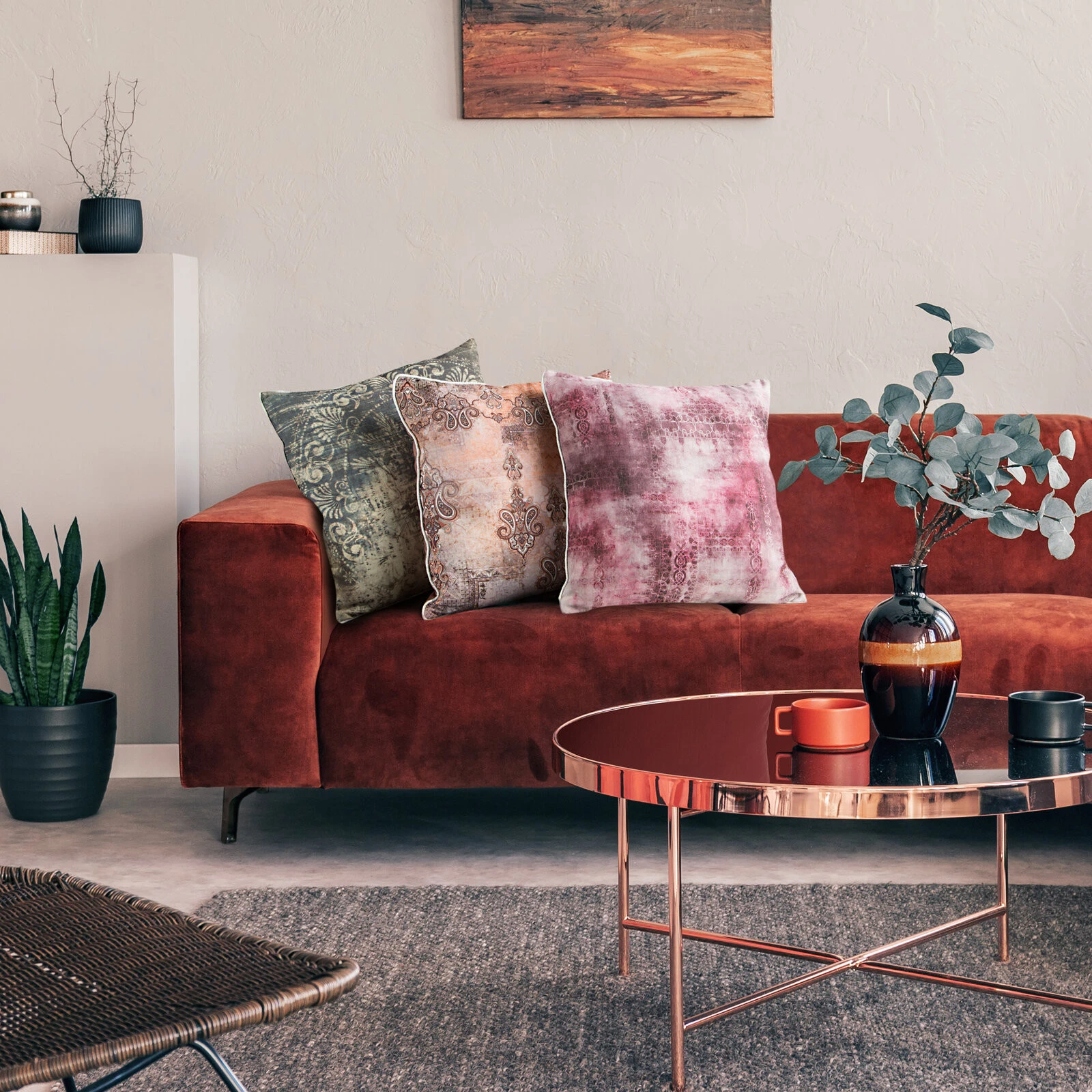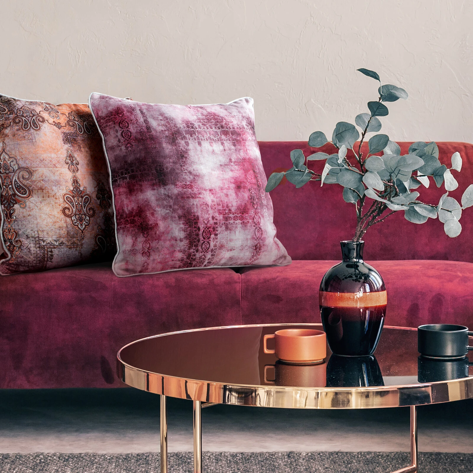 Poszewka dekoracyjna dwustronna welwet i len szerokość: 45 cm, długość: 45 cm, kolor: bordowy, Gramatura: 250 GSM, Skład: 50% poliester, 15% len, 35% bawełna