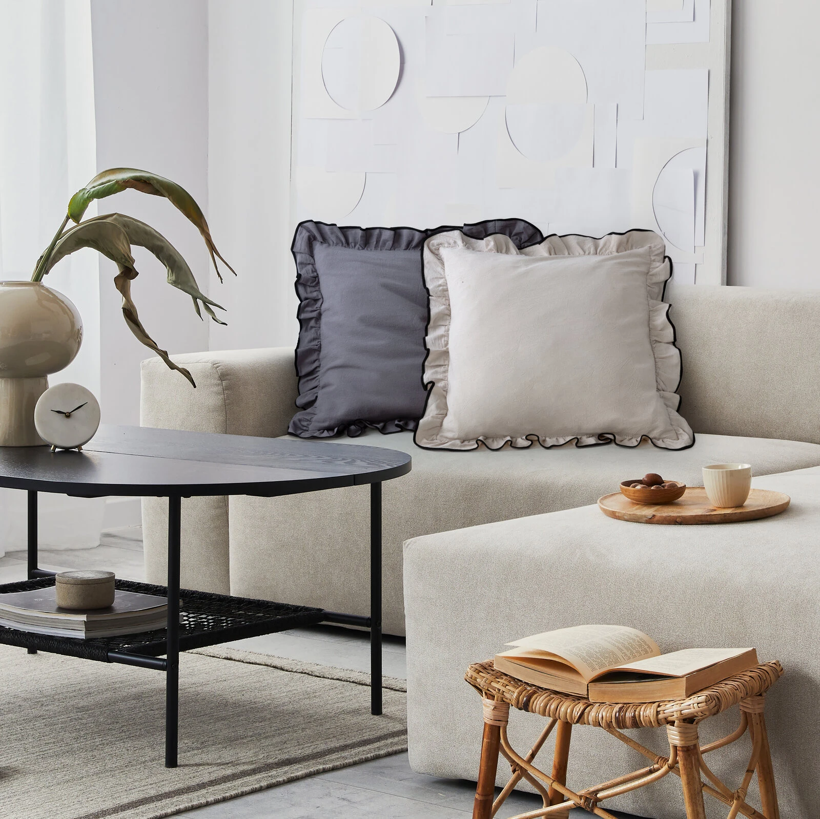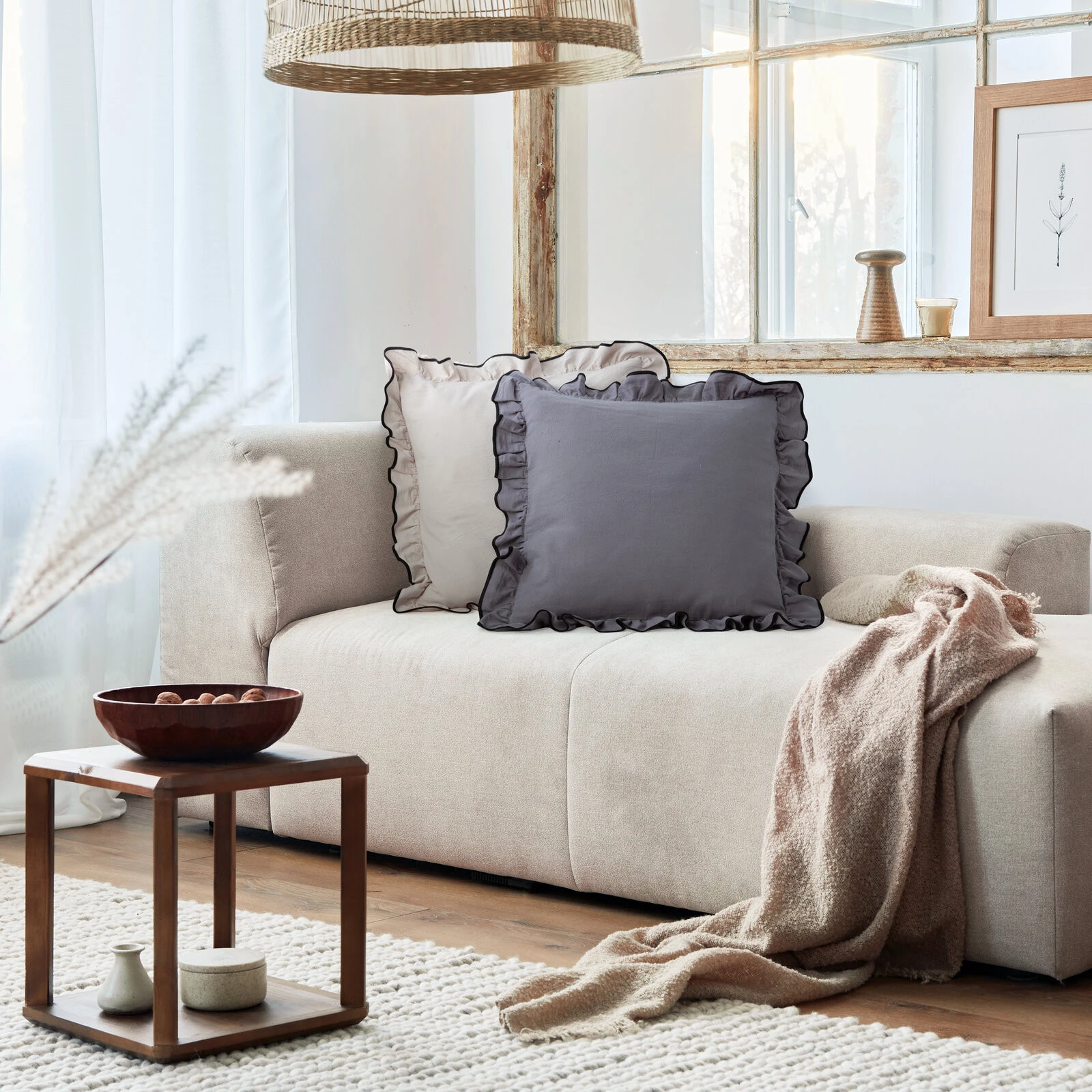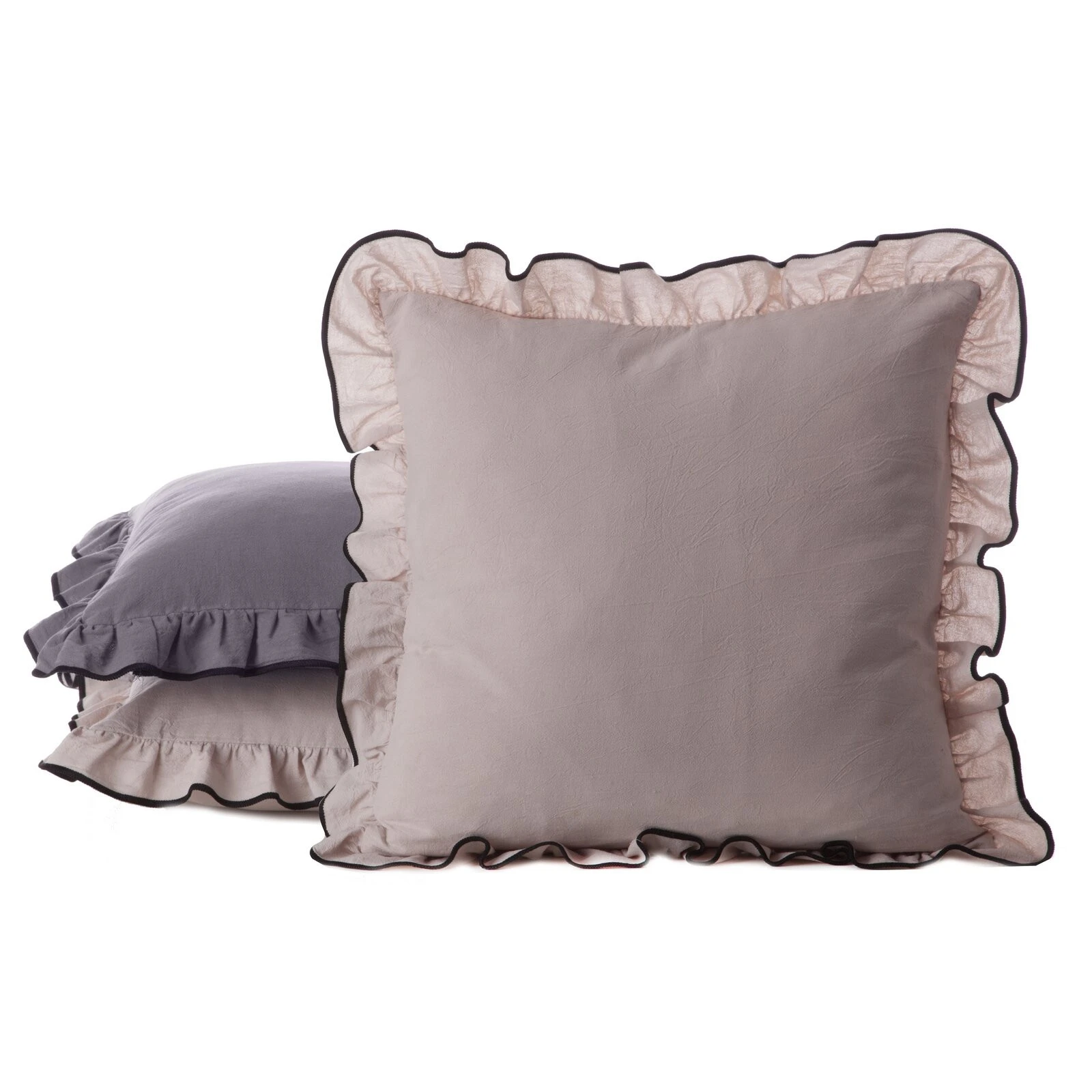 Poszewka dekoracyjna w stylu boho zdobiona falbankami szerokość: 45 cm, długość: 45 cm, kolor: stalowy, Skład: 100% bawełna