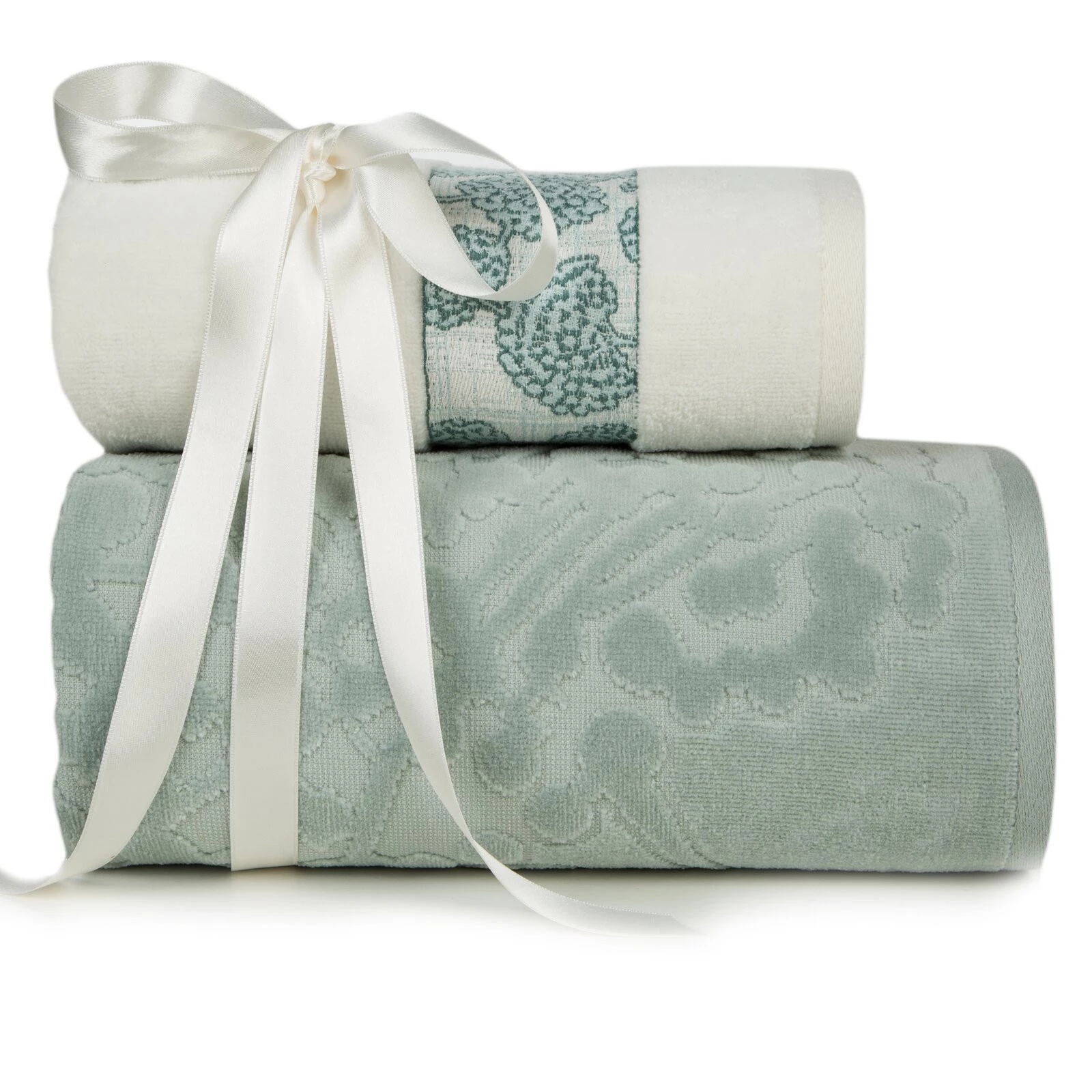 Komplet ręczników z roślinnym wzorem szerokość: 37 cm, długość: 25 cm, kolor: miętowy, Gramatura: 485+500 GSM, Skład: 100% bawełna; część ozdobna: 98% bawełna, 2% poliester; 100% bawełna
