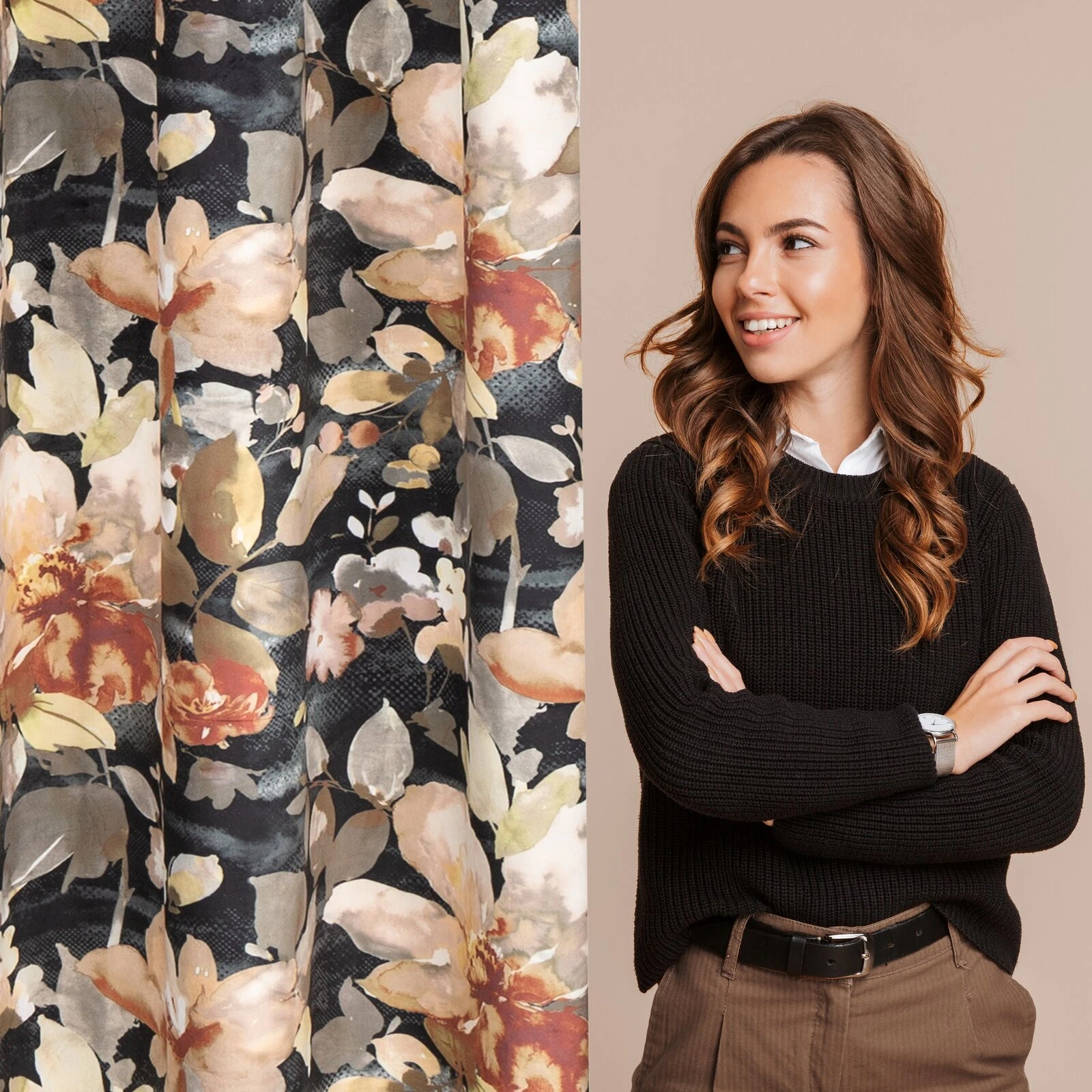 Zasłona welwetowa z nadrukiem kwiatowym szerokość: 140 cm, długość: 250 cm, kolor: grafitowy, Gramatura: 200 GSM, Skład: 100% poliester