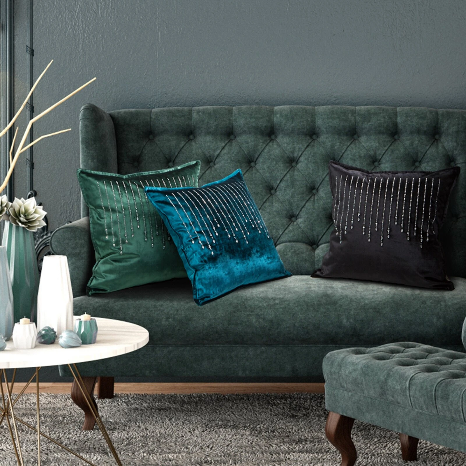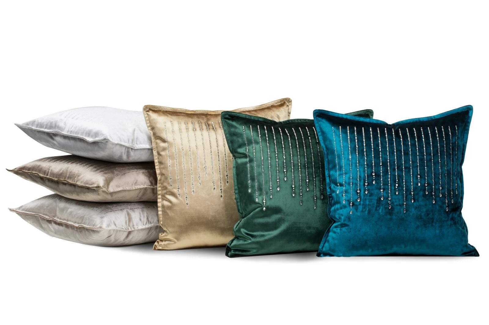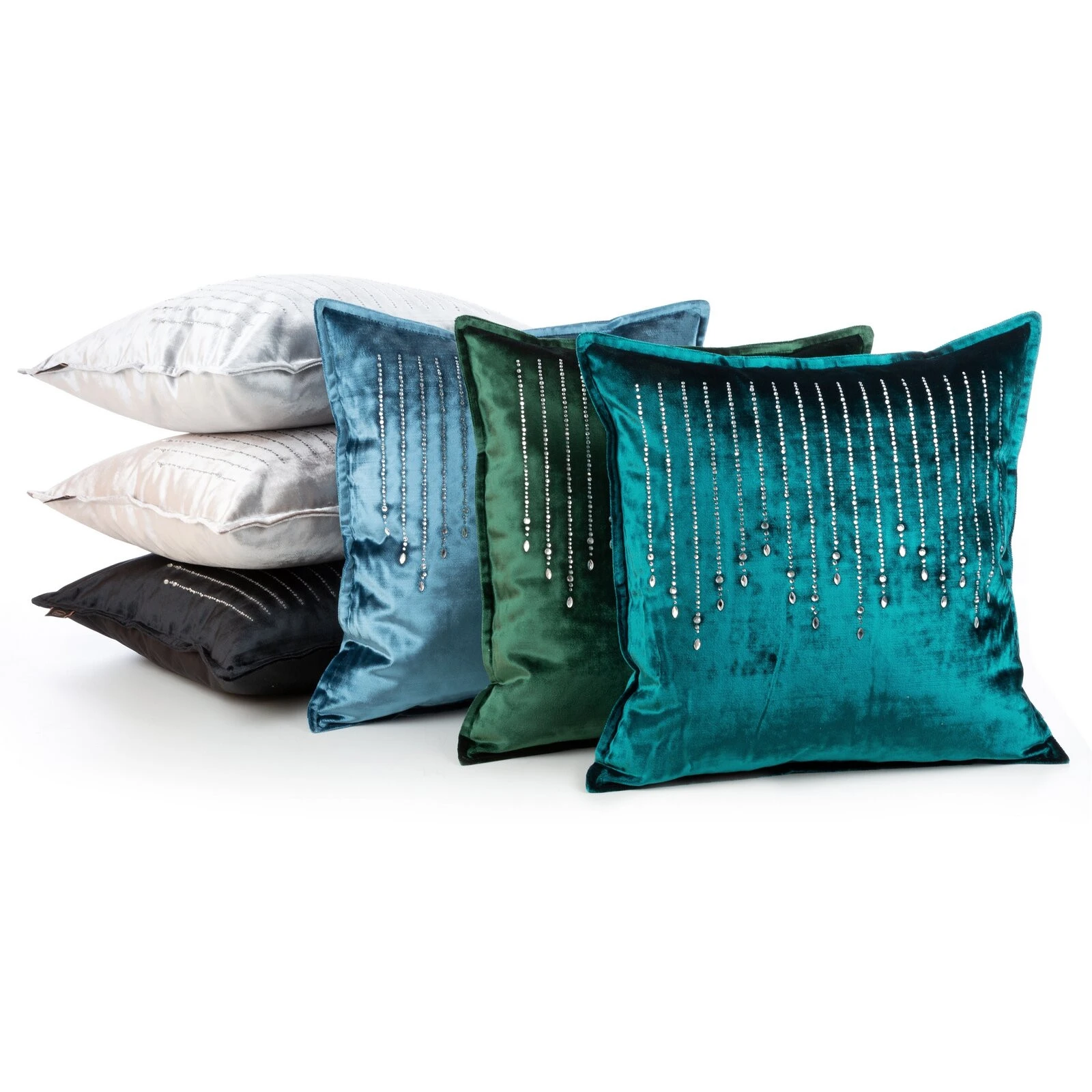 Poszewka velvetowa z kryształkami szerokość: 45 cm, długość: 45 cm, kolor: niebieski, Gramatura: 340 GSM GSM, Skład: 100% poliester