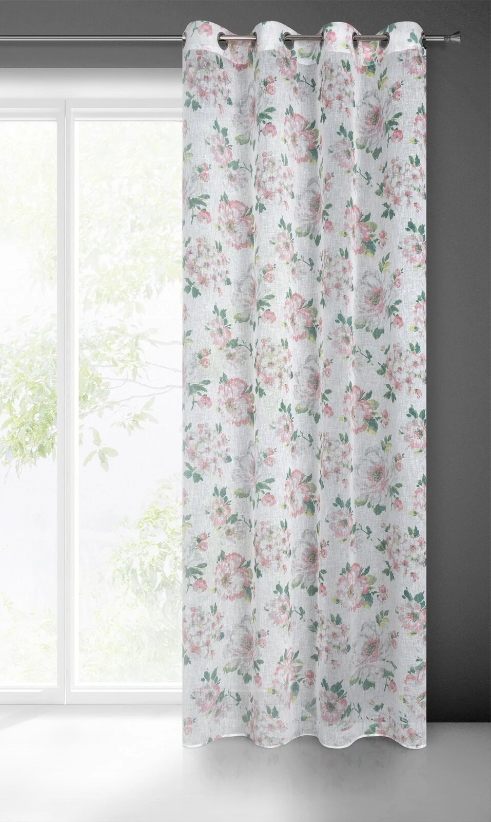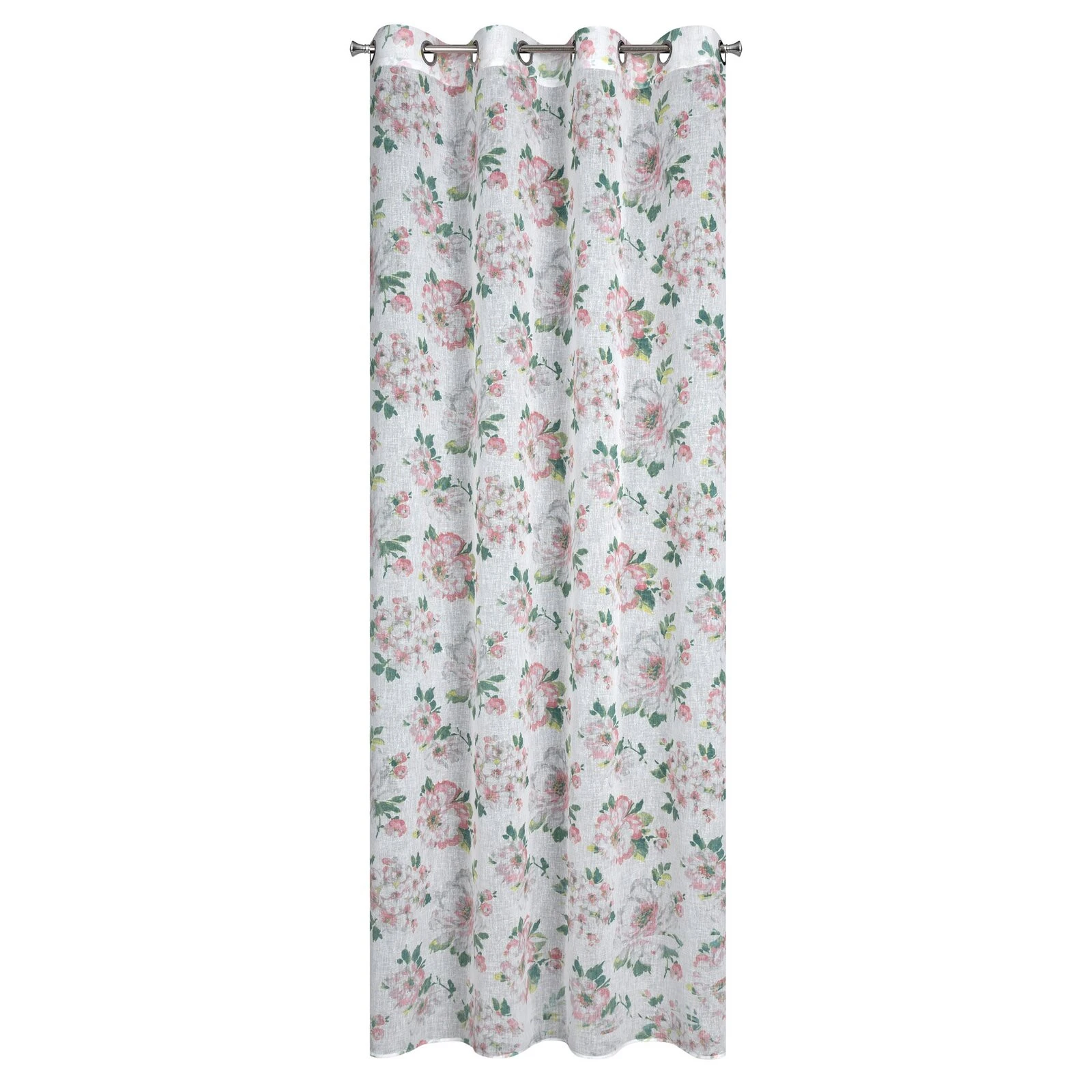 Klasyczna zasłona z tkaniny o strukturze płótna zdobiona pastelowym nadrukiem kwiatów ogrodowych. Średni stopień zaciemnienia. Tkanina łatwa w prasowaniu. szerokość: 140 cm, długość: 250 cm, kolor: biały, Gramatura: 110 GSM, Skład: 100% poliester