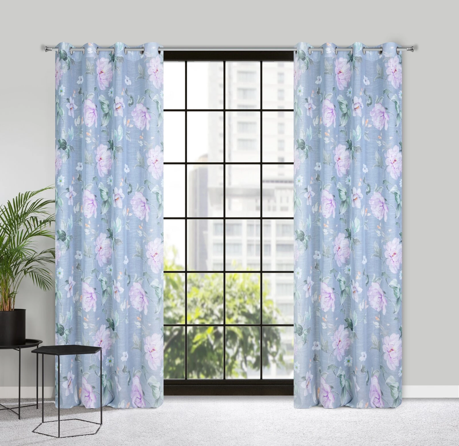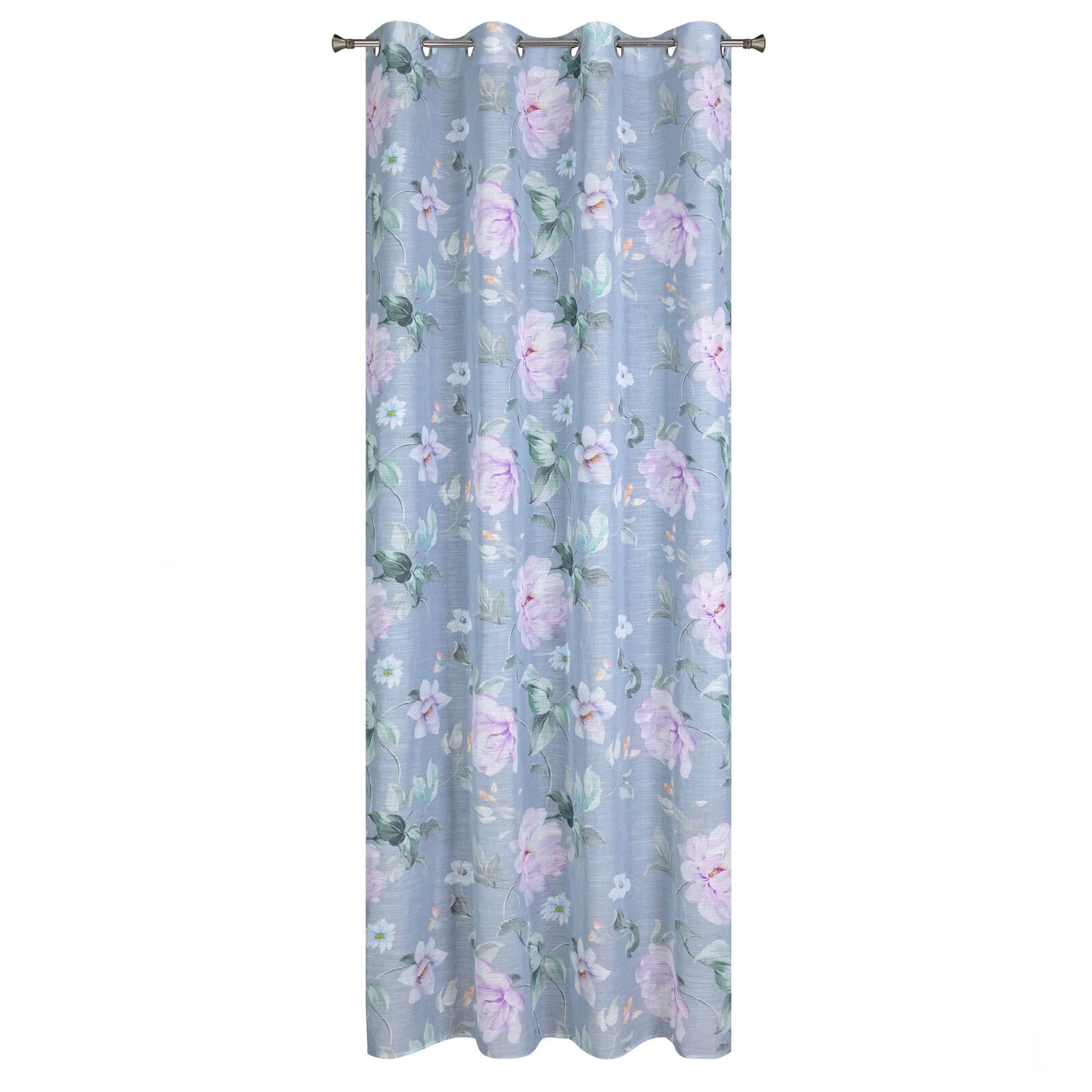 - Zasłona z etaminy z kwiatowym nadrukiem szerokość: 140 cm, długość: 250 cm, kolor: popielaty, Gramatura: 80 GSM, Skład: 100% poliester