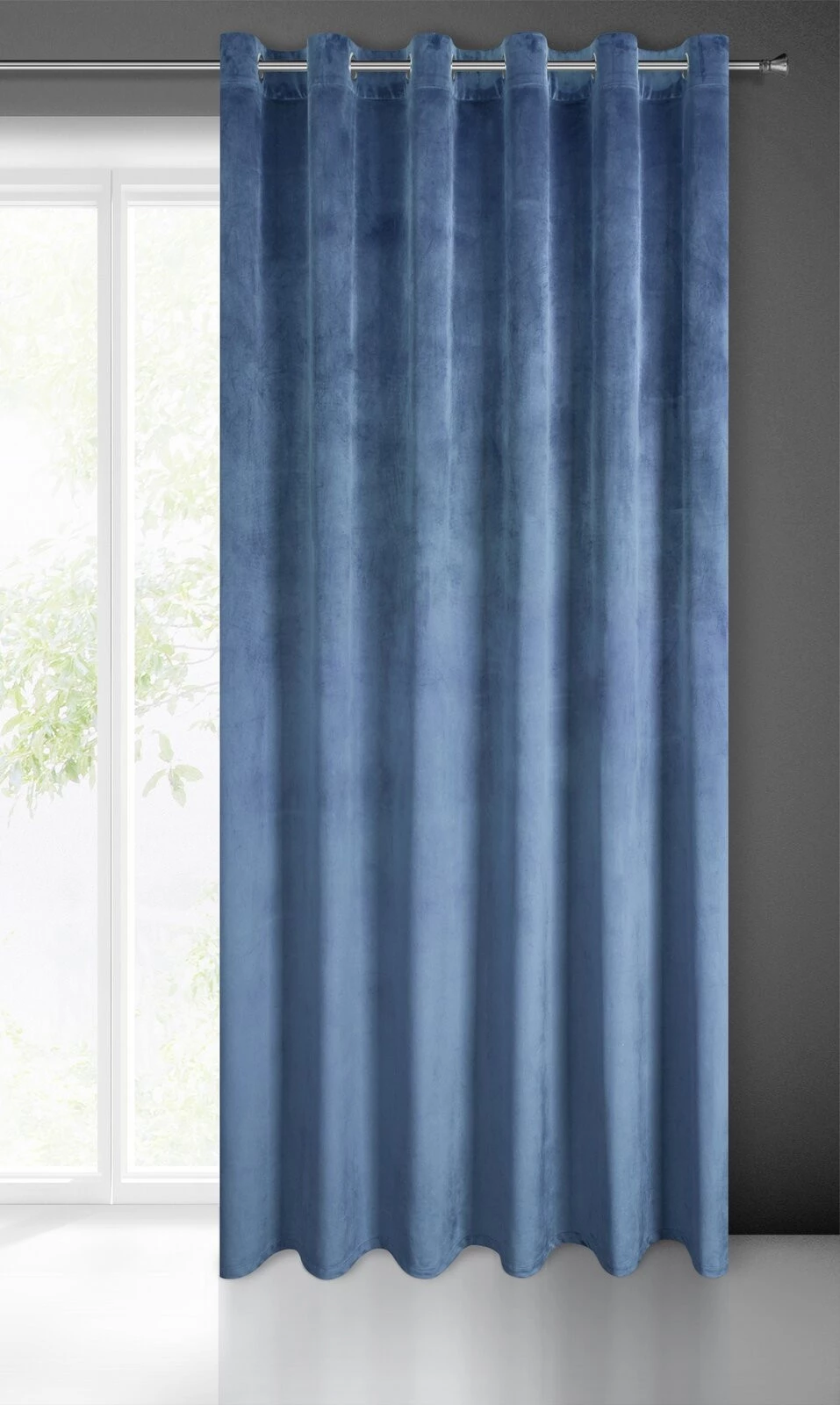 Miękka zasłona z welwetu o matowym wykończeniu. Mięsista tkanina o średnich właściwościach zaciemniających nadaje wnętrzu eleganckiego charakteru. szerokość: 215 cm, długość: 250 cm, kolor: granatowy, Gramatura: 200 GSM, Skład: 100% poliester