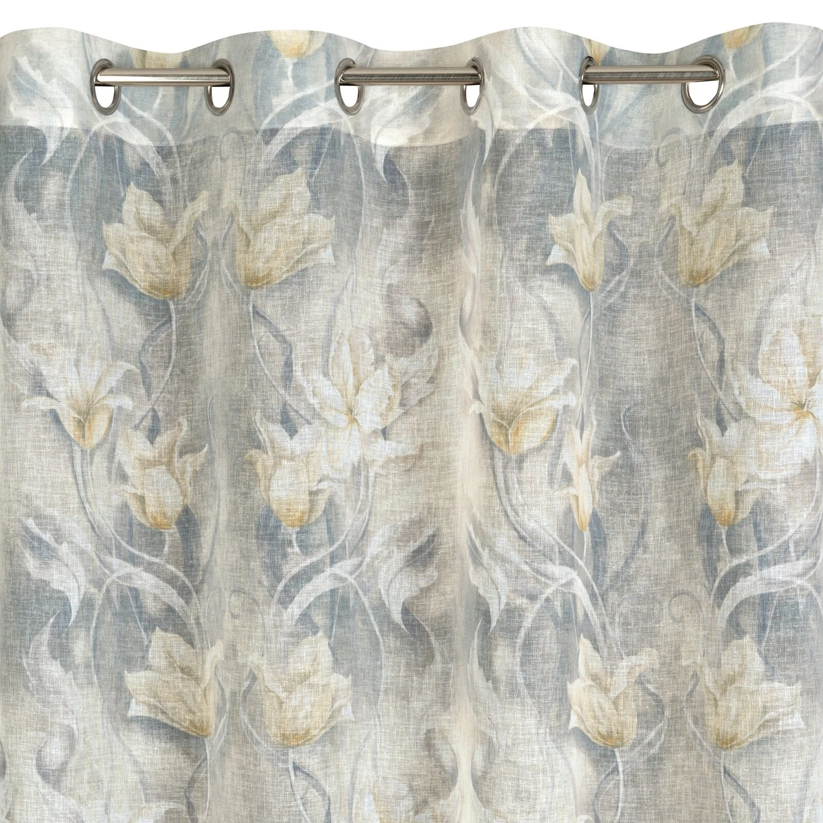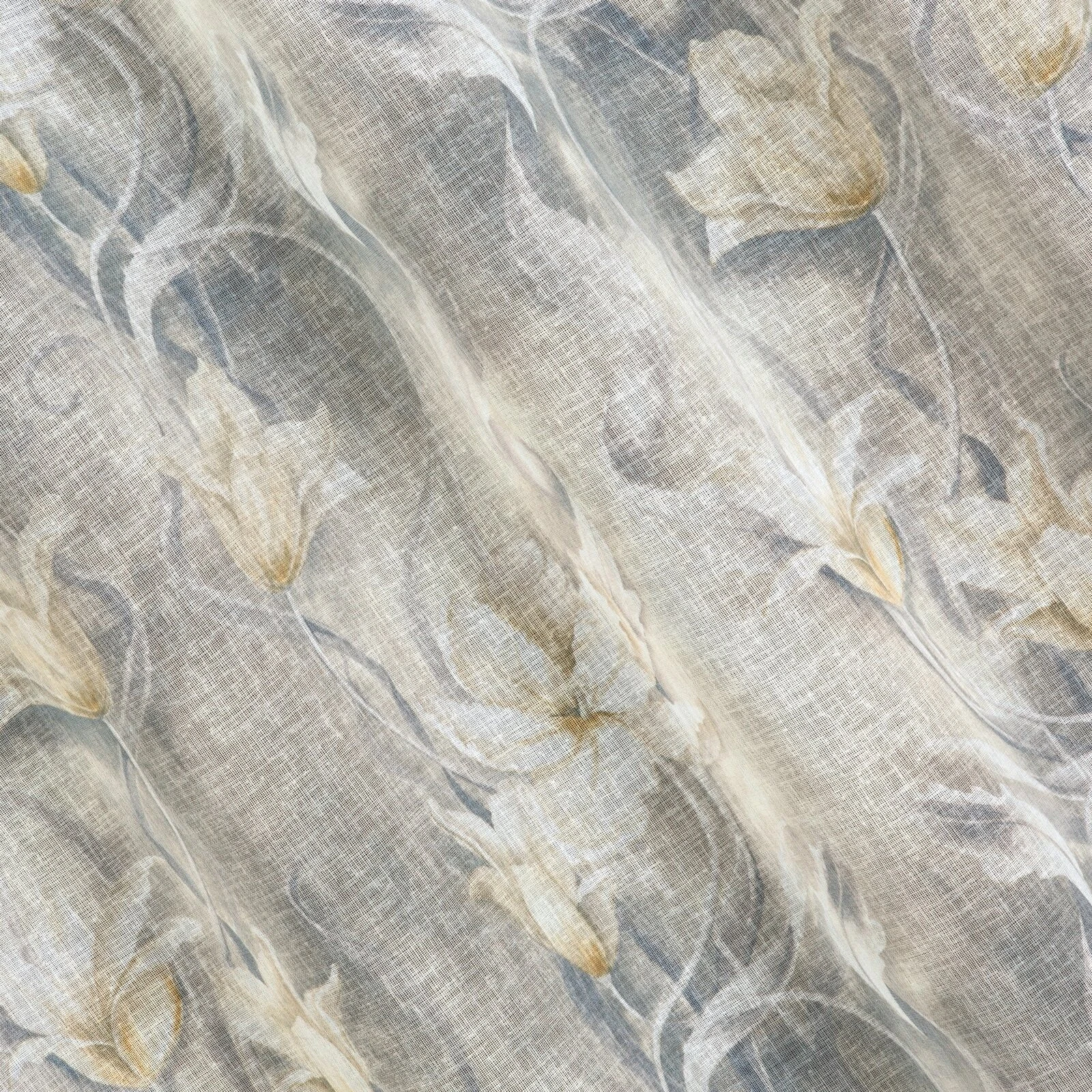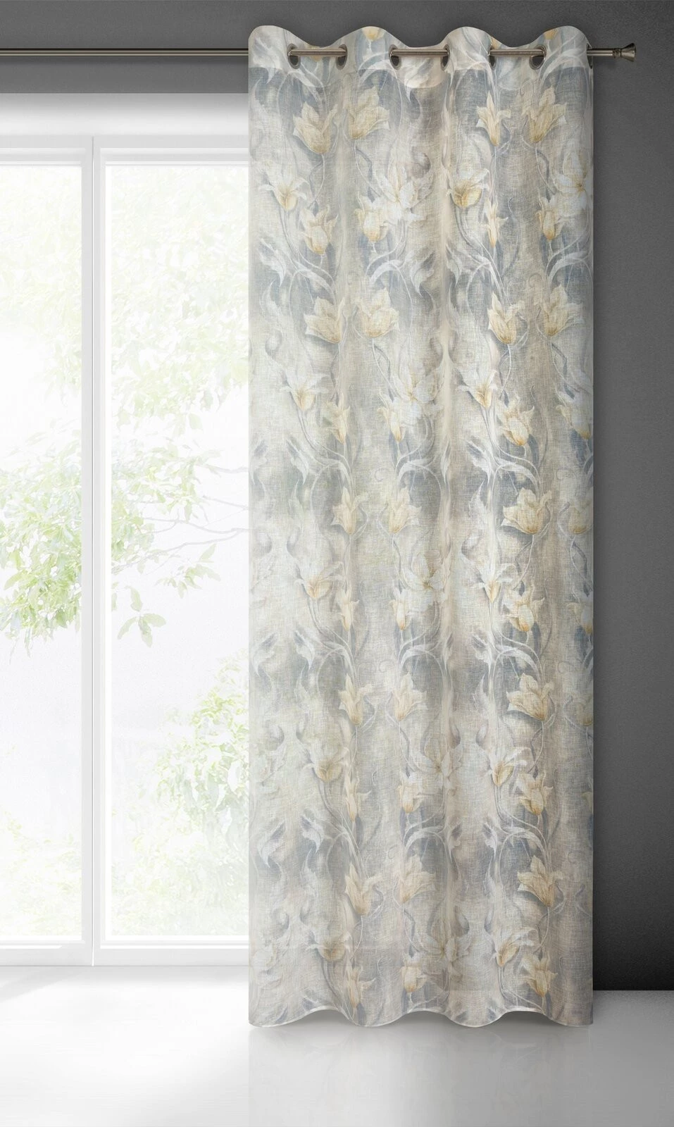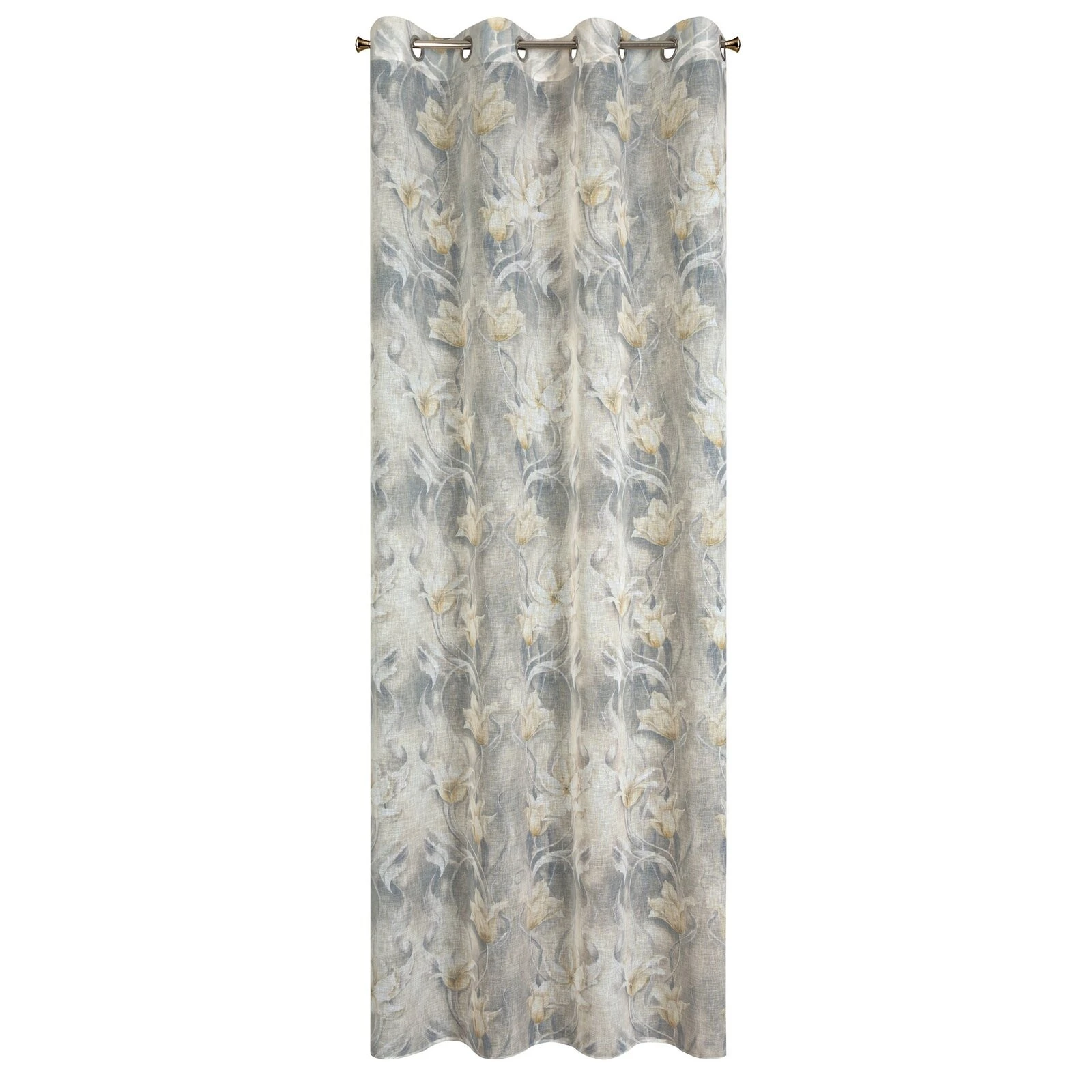 Klasyczna zasłona z tkaniny o strukturze płótna zdobiona pastelowym nadrukiem kwiatów ogrodowych. Średni stopień zaciemnienia. Tkanina łatwa w prasowaniu. szerokość: 140 cm, długość: 250 cm, kolor: popielaty, Gramatura: 130 GSM, Skład: 100% poliester