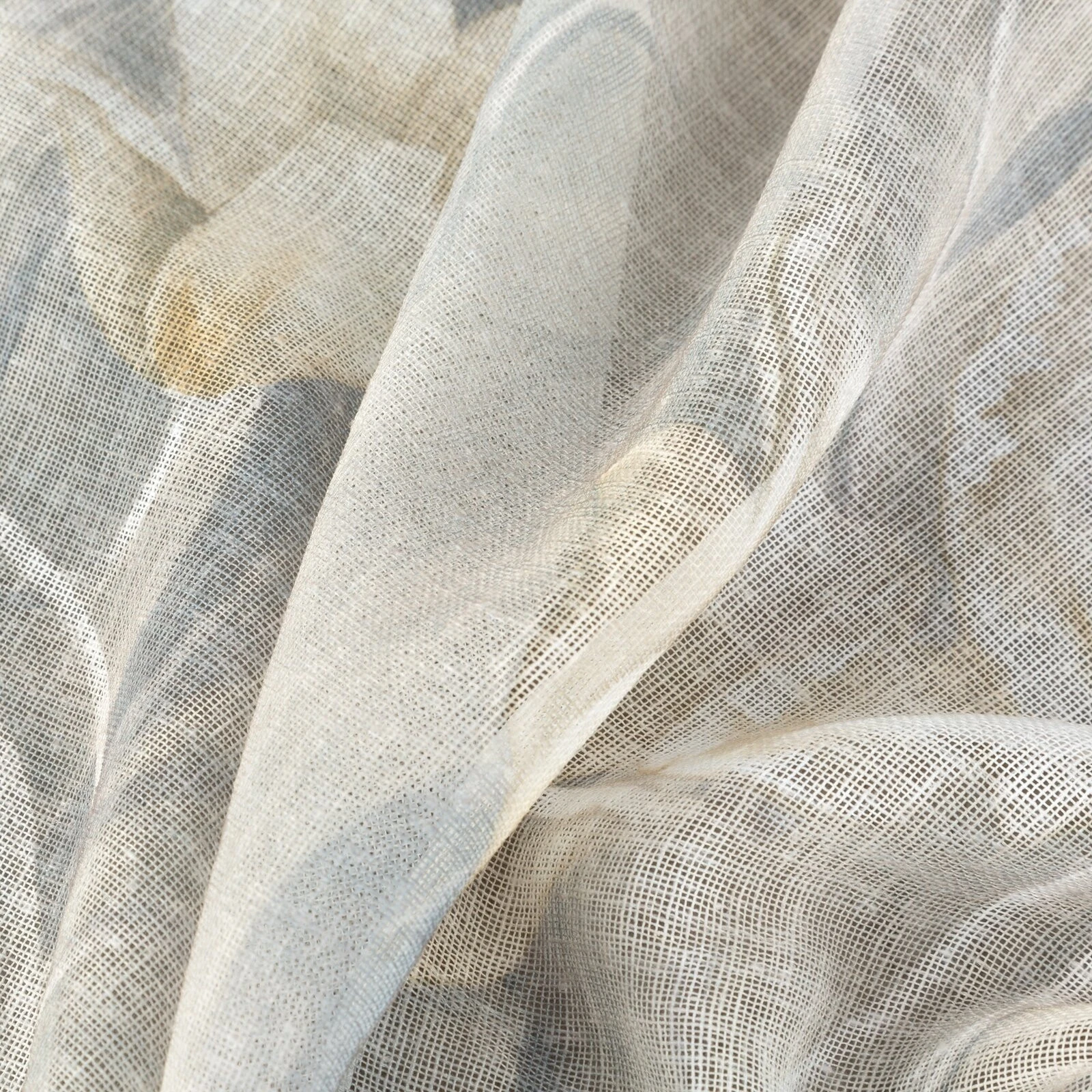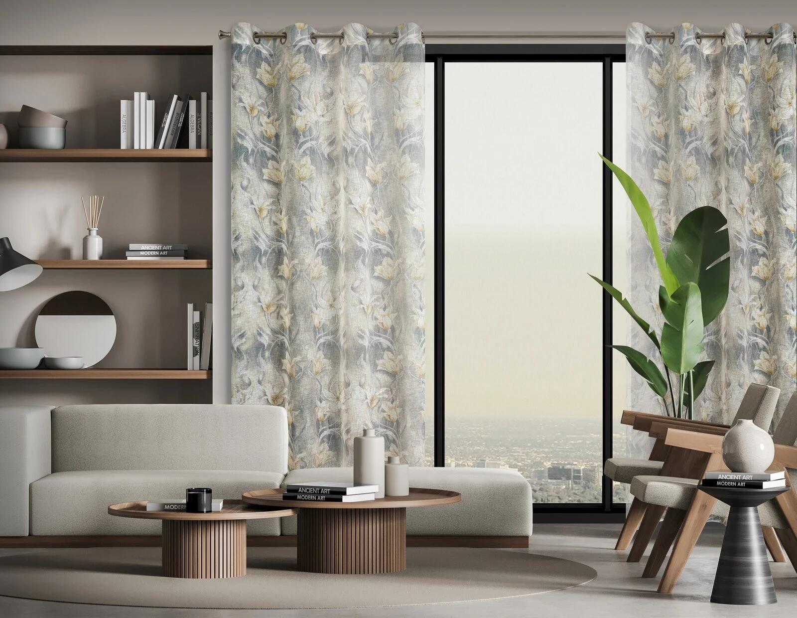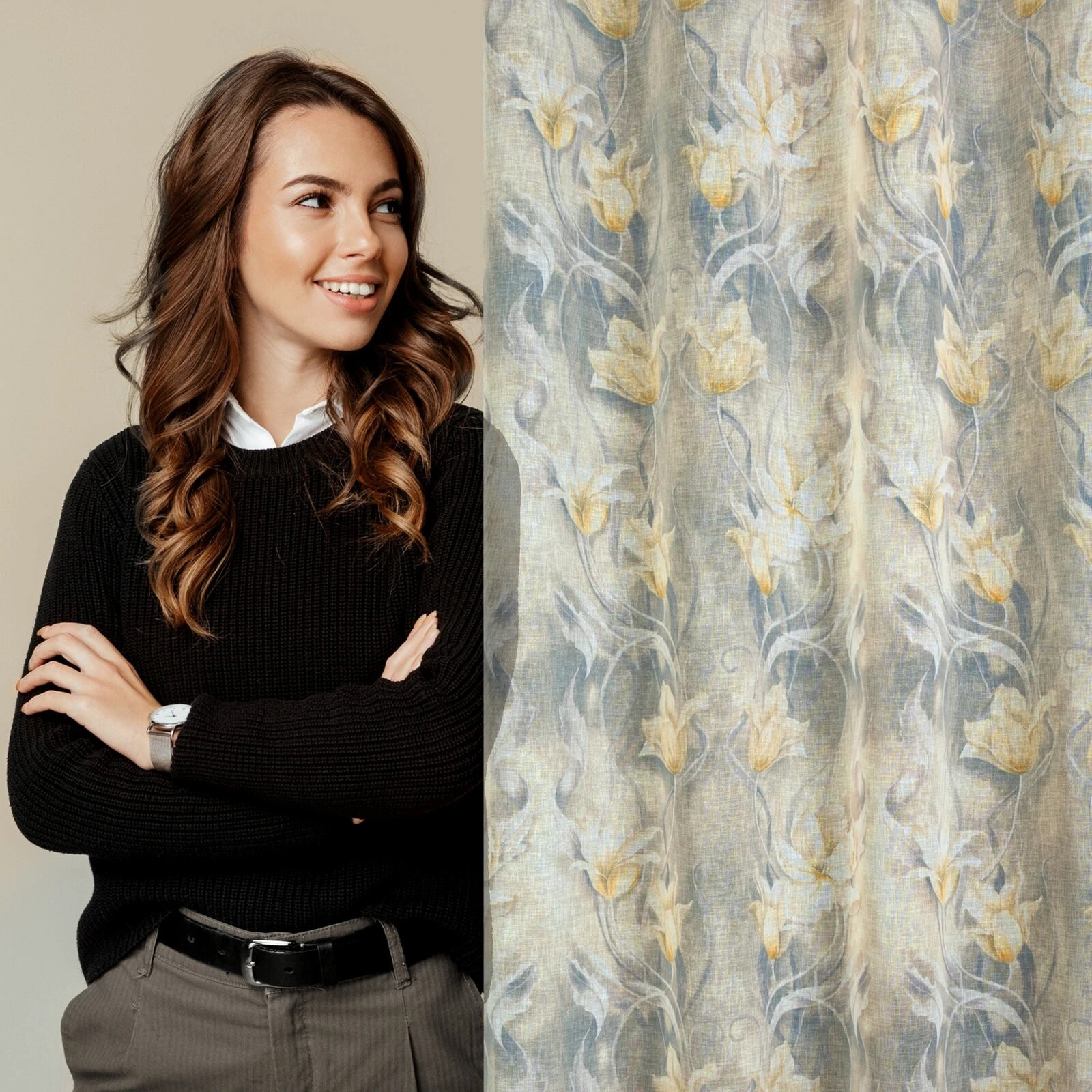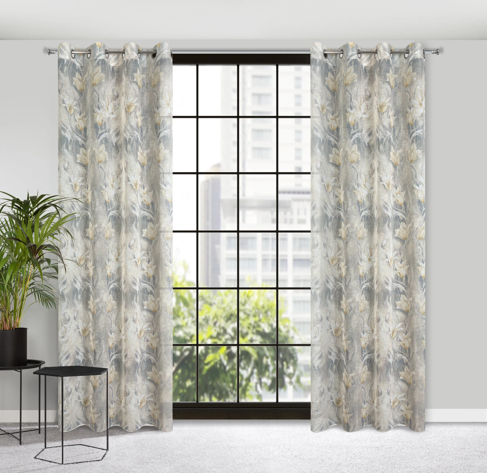 Klasyczna zasłona z tkaniny o strukturze płótna zdobiona pastelowym nadrukiem kwiatów ogrodowych. Średni stopień zaciemnienia. Tkanina łatwa w prasowaniu. szerokość: 140 cm, długość: 250 cm, kolor: popielaty, Gramatura: 130 GSM, Skład: 100% poliester
