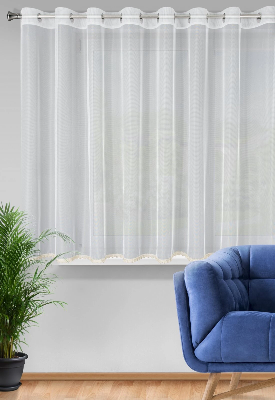 Firana gotowa z ozdobną koronką szerokość: 300 cm, długość: 150 cm, kolor: biały, Gramatura: 35 GSM, Skład: 100% poliester