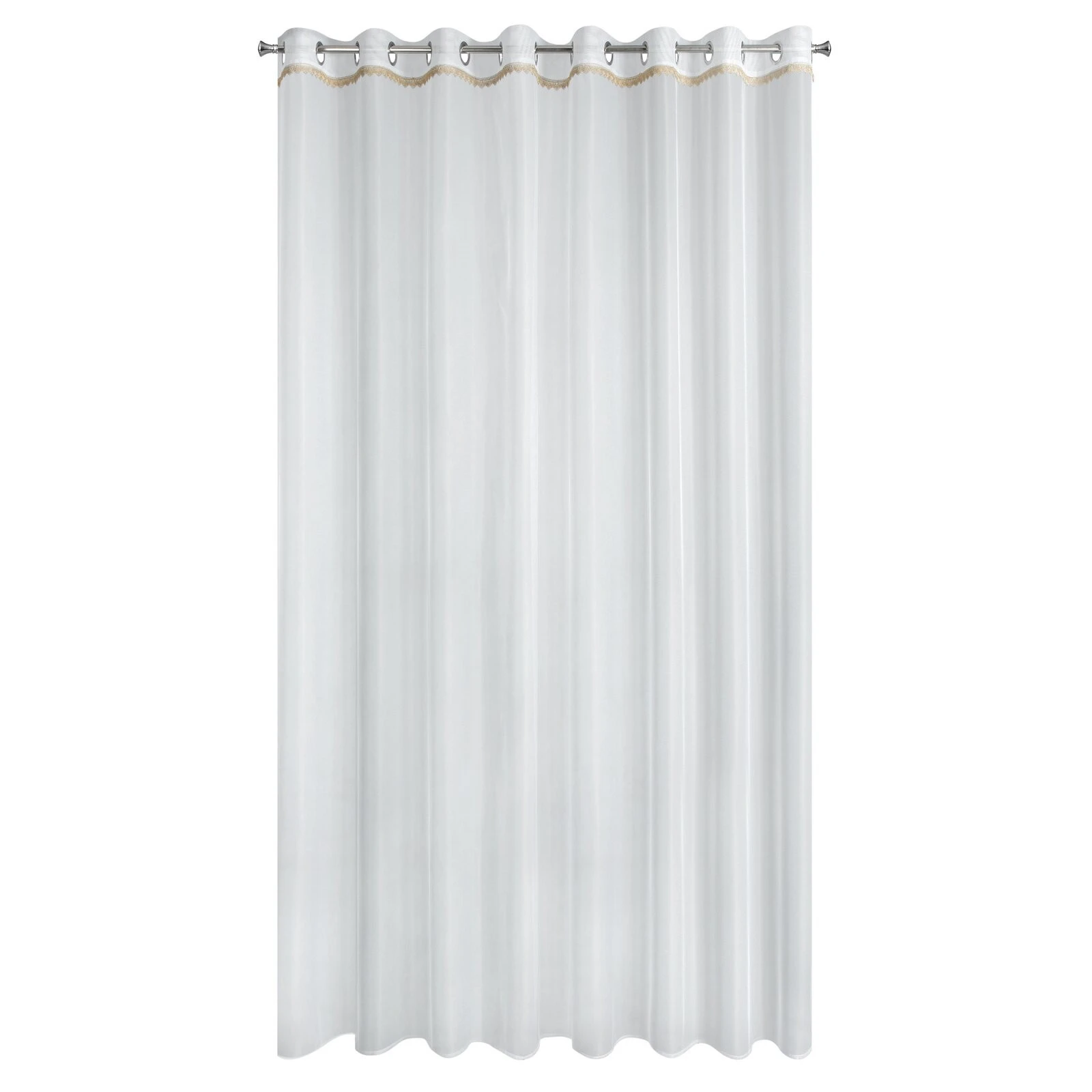 Firana gotowa z ozdobną tasiemką szerokość: 300 cm, długość: 250 cm, kolor: biały, Gramatura: 35 GSM, Skład: 100% poliester