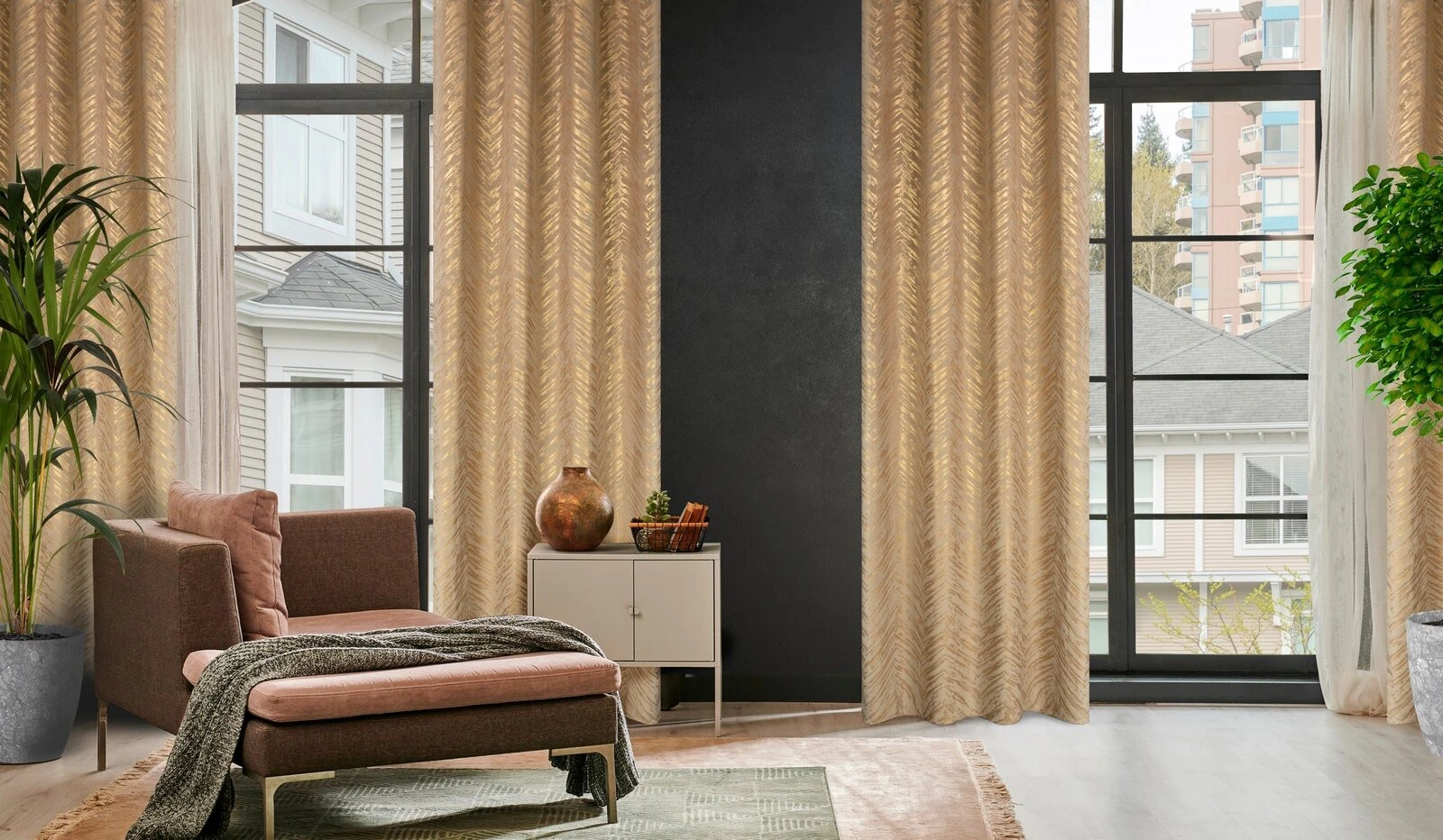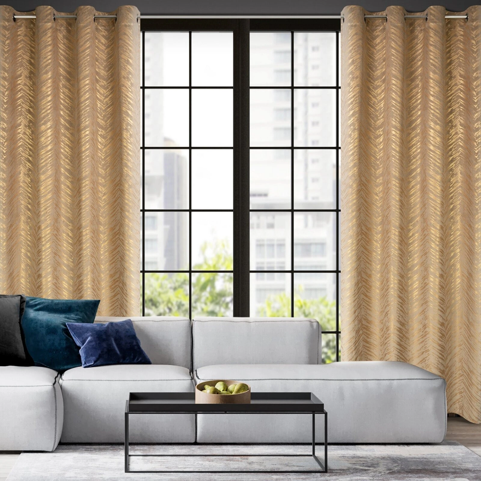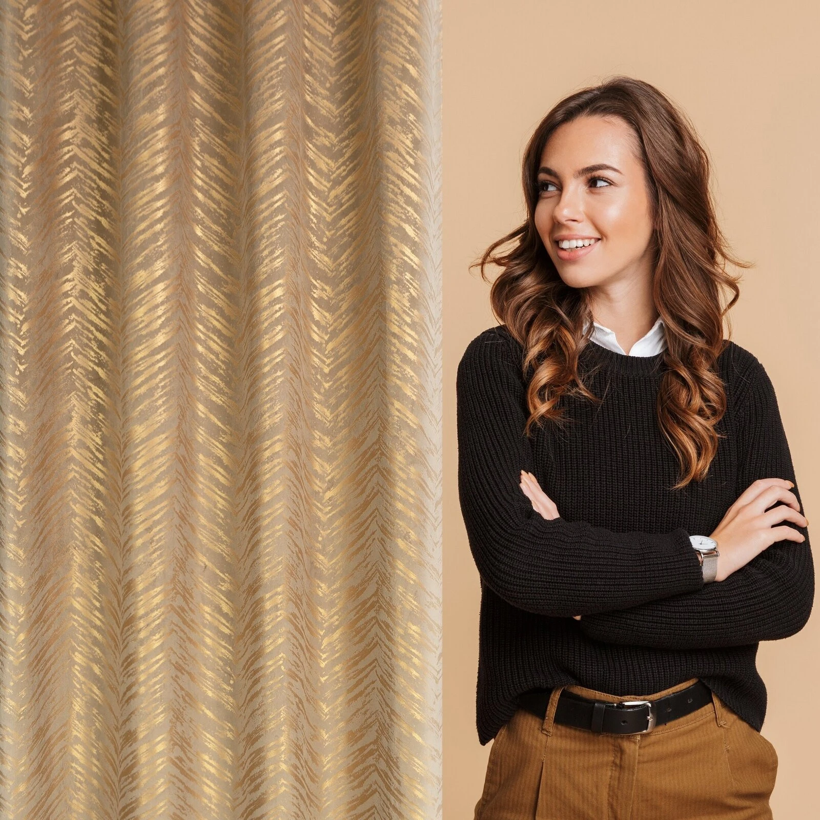 - Zasłona welwetowa ze złotym nadrukiem szerokość: 140 cm, długość: 250 cm, kolor: ciemnobeżowy, Gramatura: 200 GSM, Skład: 100% poliester