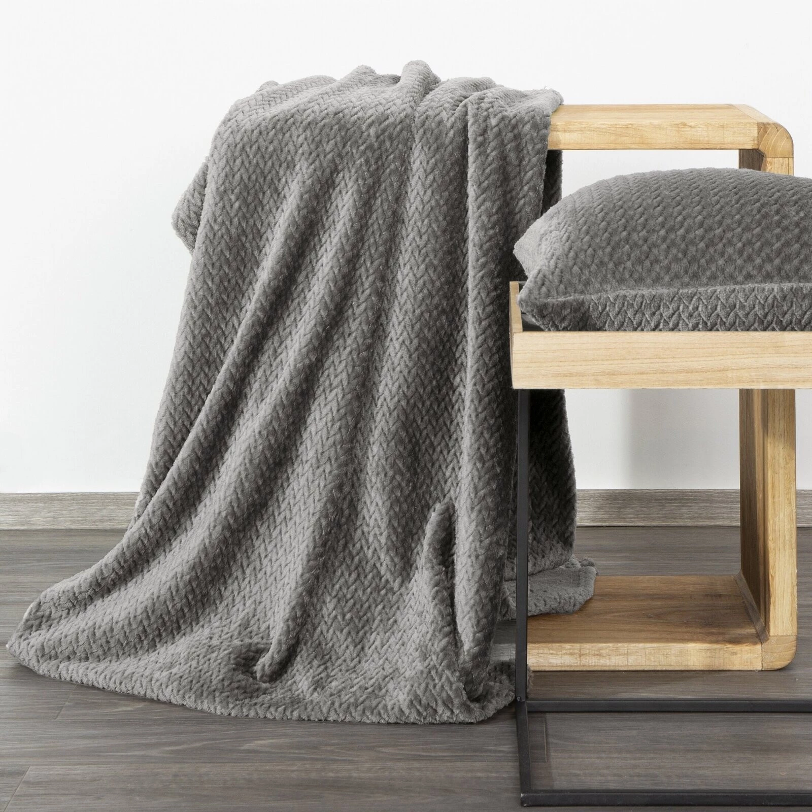 - Klasyczny koc z przyjemnego w dotyku włókna w technologii mikroflano. Jednobarwna, puszysta faktura ozdobiona jest minimalistycznym tłoczeniem w formie jodełki. szerokość: 170 cm, długość: 210 cm, kolor: grafitowy, Gramatura: 250GSM GSM, Skład: 100% polie