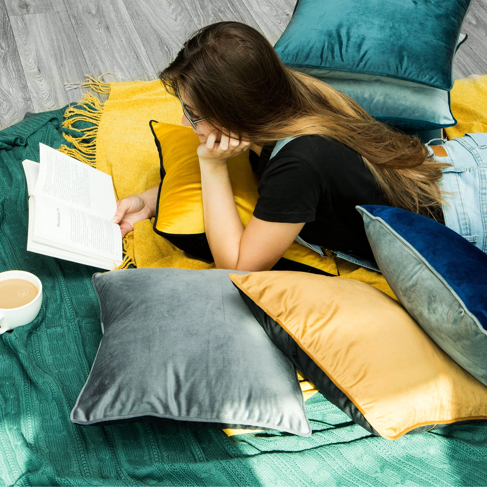 - Poszewka welwetowa zdobiona lamówką szerokość: 40 cm, długość: 40 cm, kolor: szałwiowy, Gramatura: 200 GSM, Skład: 100% poliester