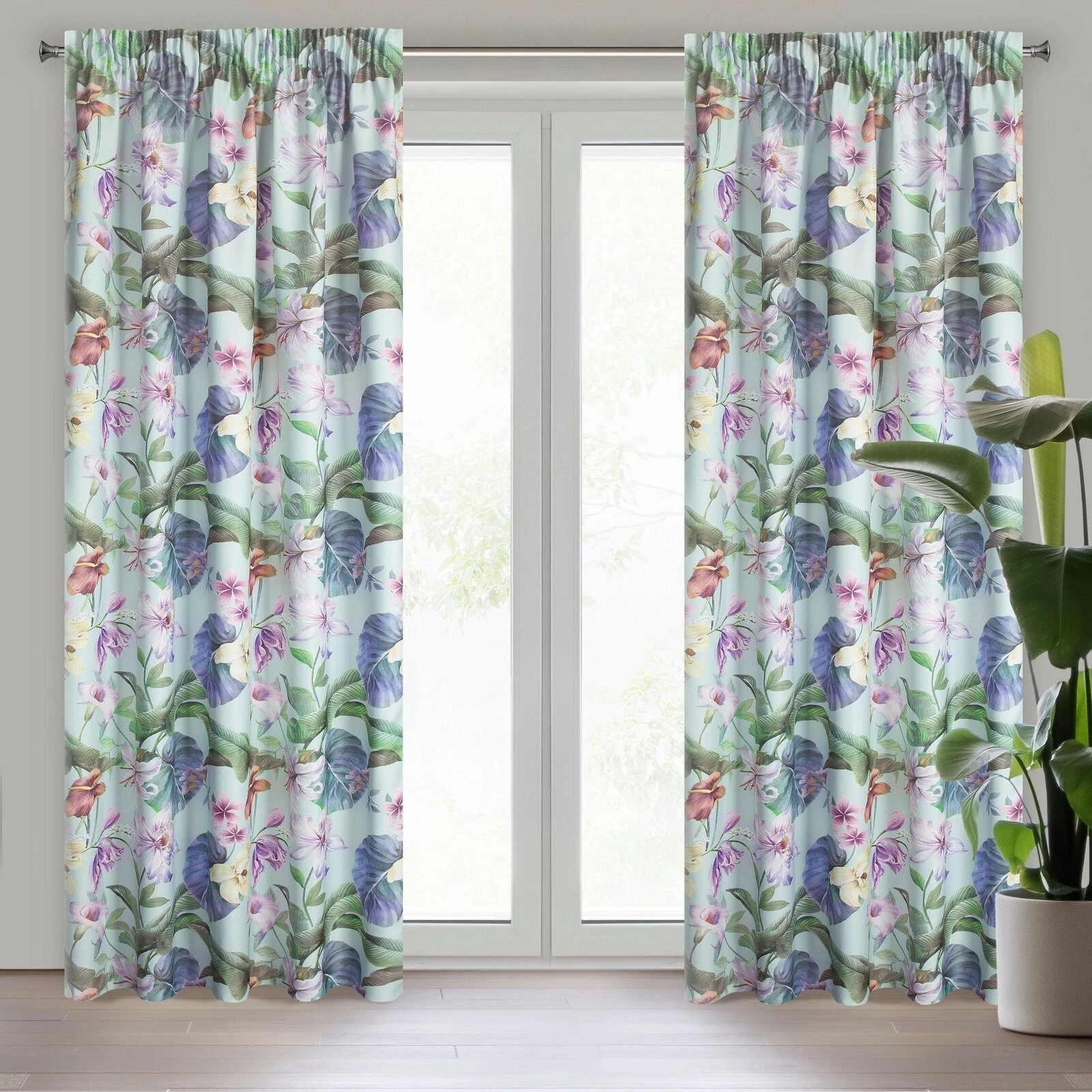 Piękna zasłona z mięsistej tkaniny dekorowana modnym nadrukiem z motywem egzotycznych liści i kwiatów. Wysoki stopień zaciemnienia. Prasować od lewej strony. szerokość: 140 cm, długość: 270 cm, kolor: fioletowy, Gramatura: 210 GSM, Skład: 100% poliester