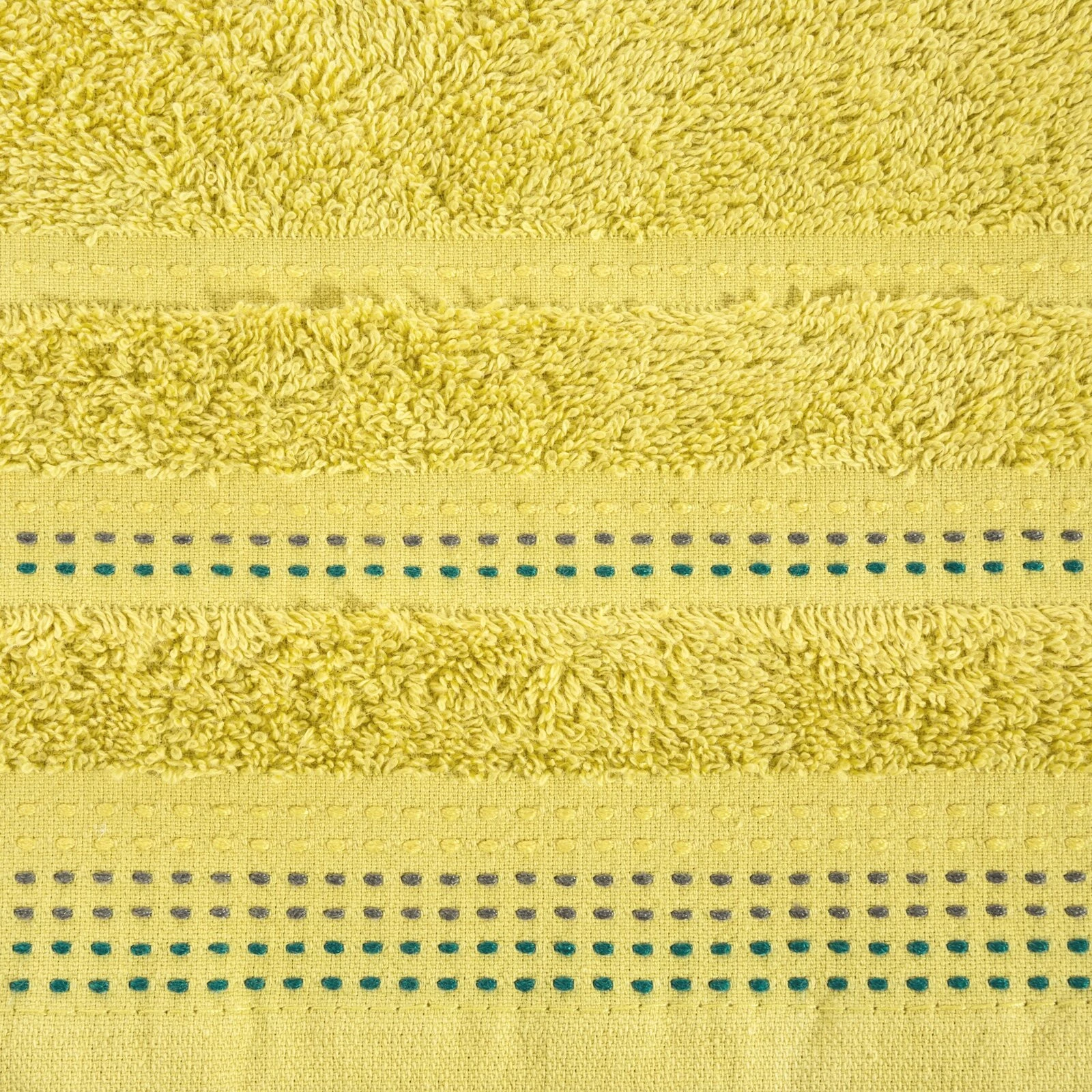 Jednobarwny ręcznik z miękkiej i chłonnej tkaniny bawełnianej o splocie frotte zdobiony kolorową bordiurą w stylu fastrygi. Łatwy w praniu, nie farbuje. szerokość: 30 cm, długość: 50 cm, kolor: musztardowy, Gramatura: 500 GSM, Skład: 100% bawełna