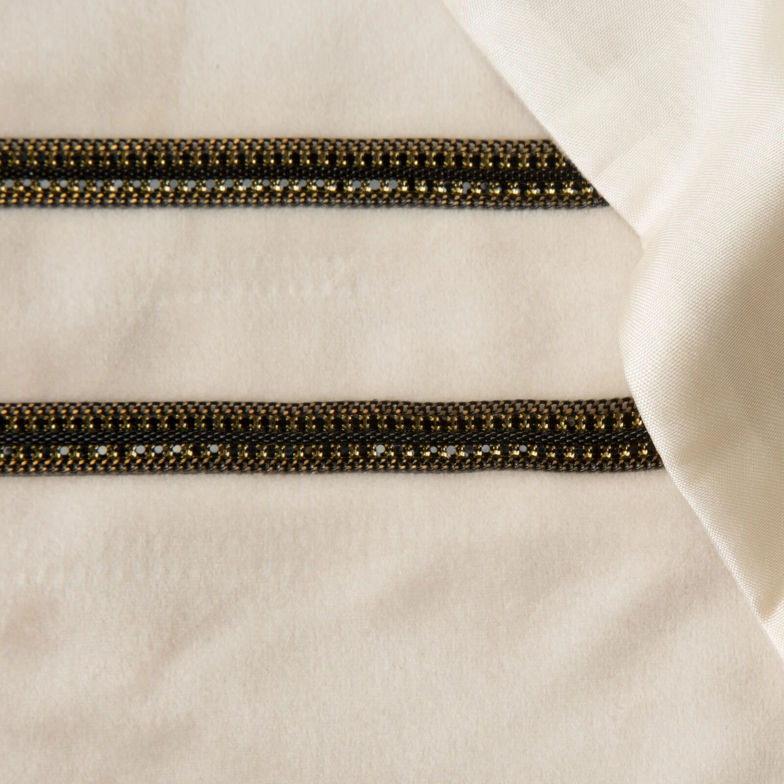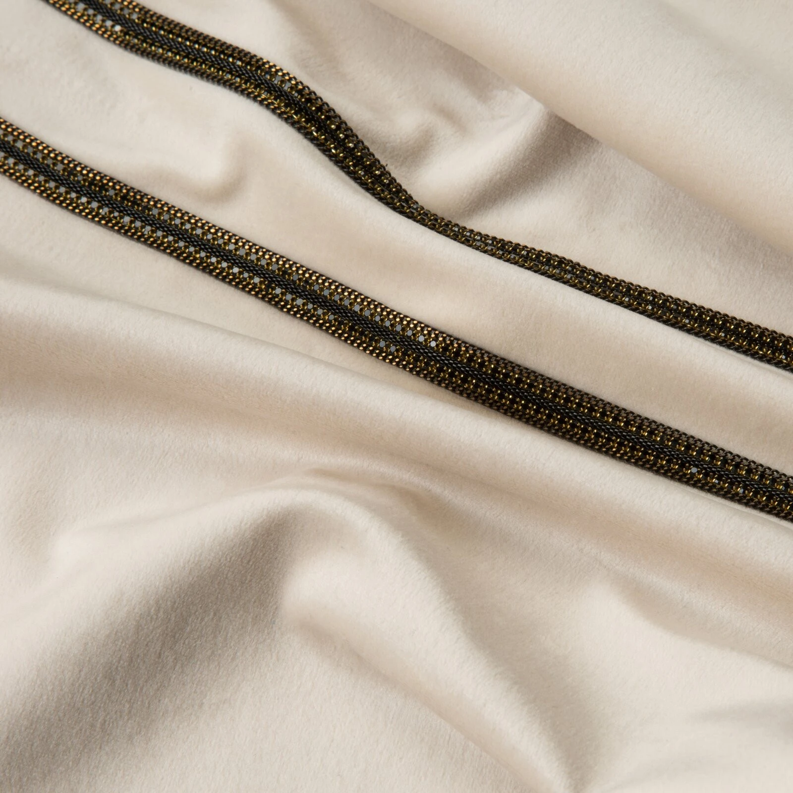 Elegancki bieżnik wykonany z miękkiej i miłej w dotyku tkaniny welwetowej, ozdobiony dwoma pasami efektownej pasmanterii z drobnymi cyrkoniami. szerokość: 35 cm, długość: 180 cm, kolor: kremowy, Gramatura: 250 GSM, Skład: 100% poliester