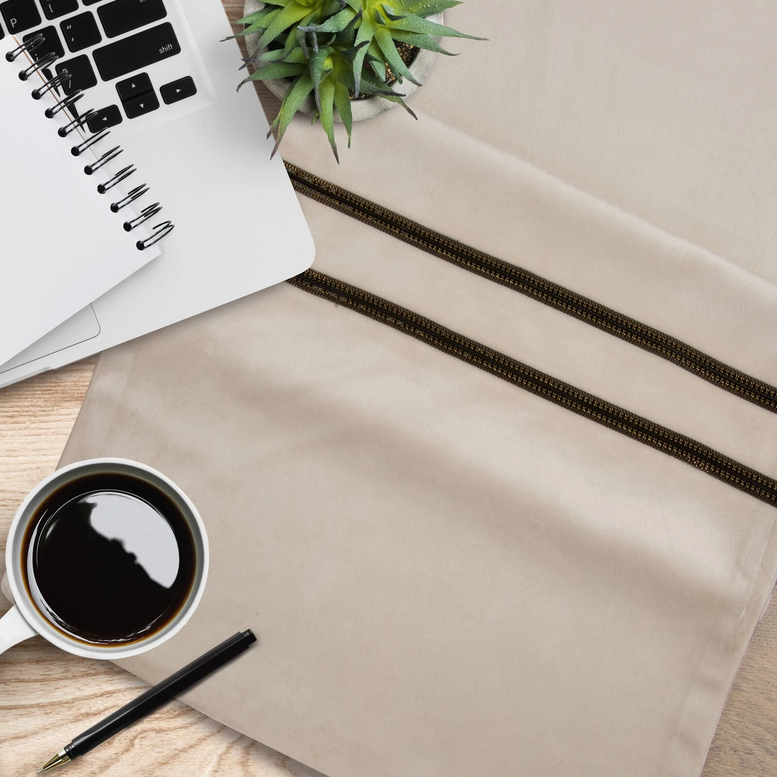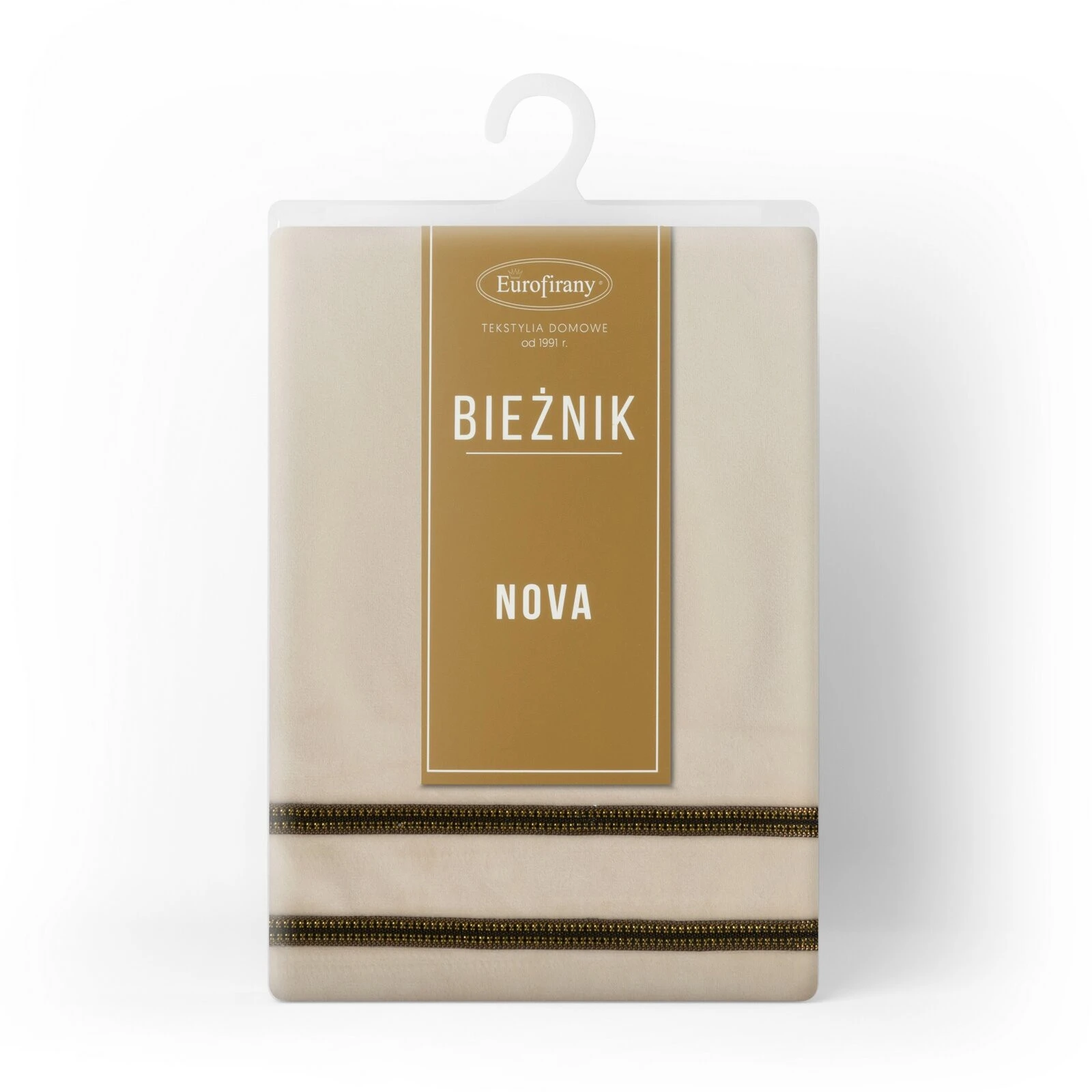 - Elegancki bieżnik wykonany z miękkiej i miłej w dotyku tkaniny welwetowej, ozdobiony dwoma pasami efektownej pasmanterii z drobnymi cyrkoniami. szerokość: 35 cm, długość: 180 cm, kolor: kremowy, Gramatura: 250 GSM, Skład: 100% poliester