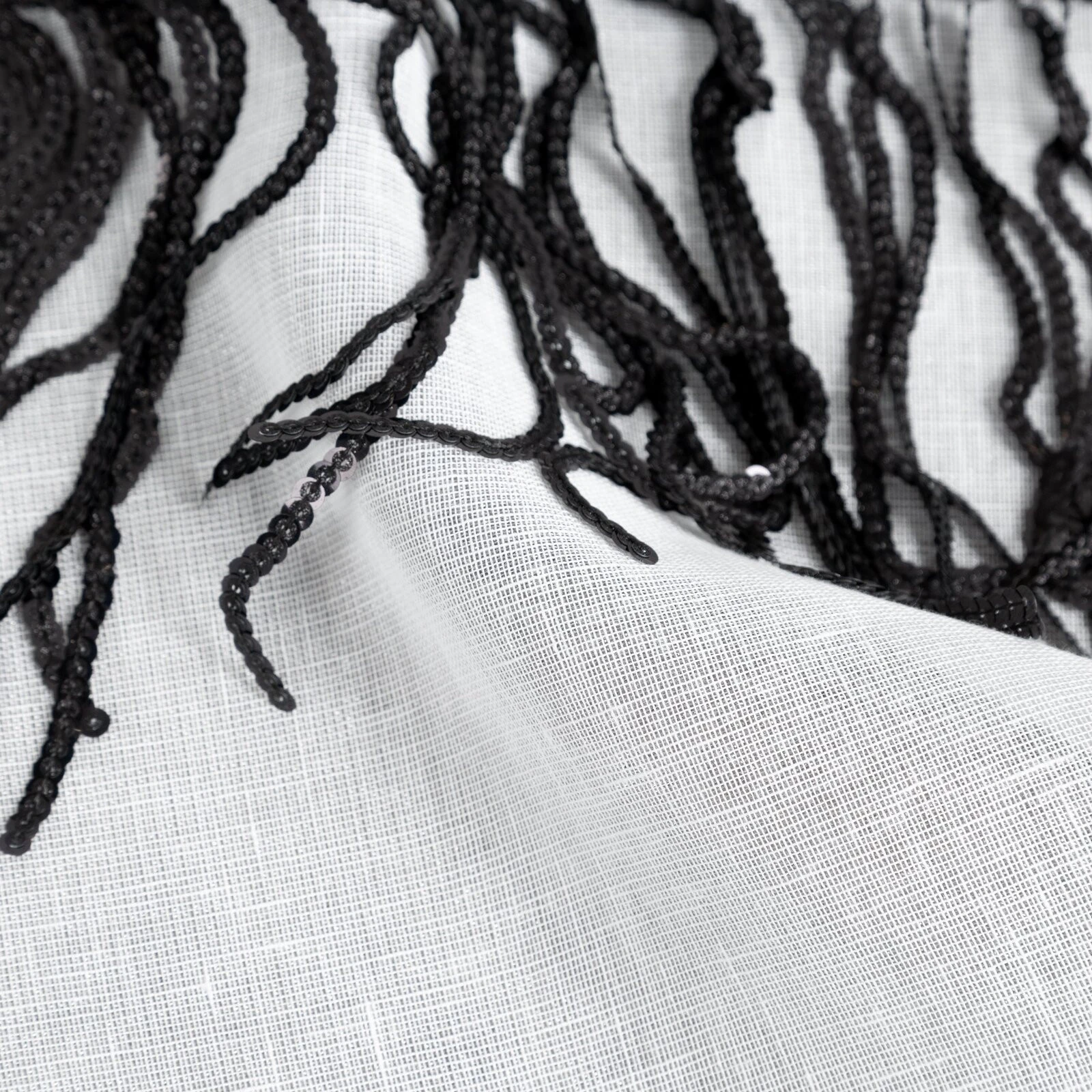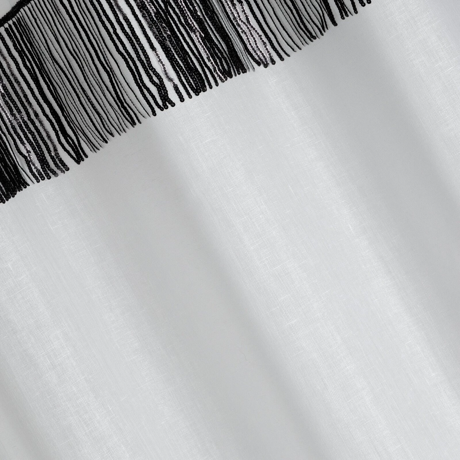 - Firana jednokolorowa o strukturze drobnego deszczyku z taśmą cekinową szerokość: 140 cm, długość: 250 cm, kolor: biały, Gramatura: 90 GSM, Skład: 100% poliester
