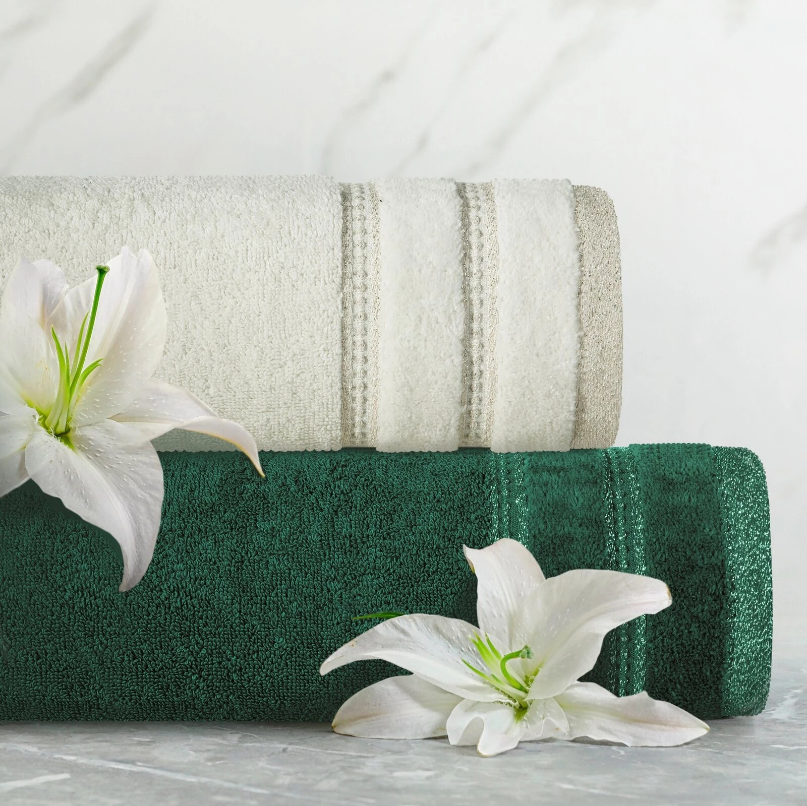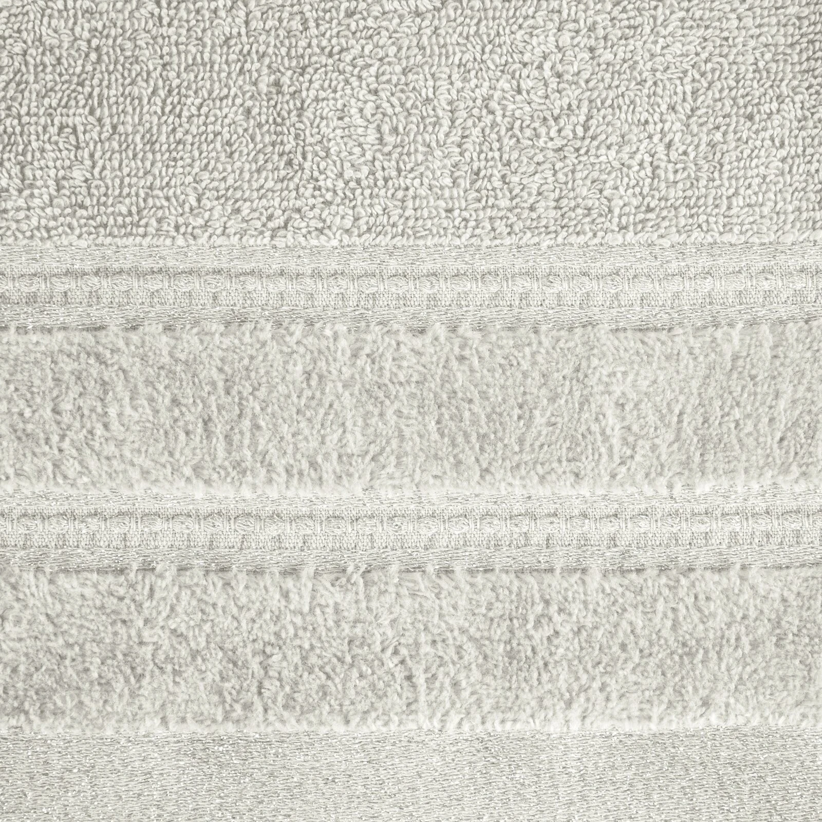 Klasyczny ręcznik kąpielowy z chłonnej tkaniny bawełnianej o splocie frotte. Minimalistyczna bordiura z weluru z dodatkiem lśniącej, metalicznej nici. szerokość: 30 cm, długość: 50 cm, kolor: beżowy, Gramatura: 500 GSM, Skład: 100% bawełna; część ozdobna: 99.2% bawełna, 0.8% nić metaliczna