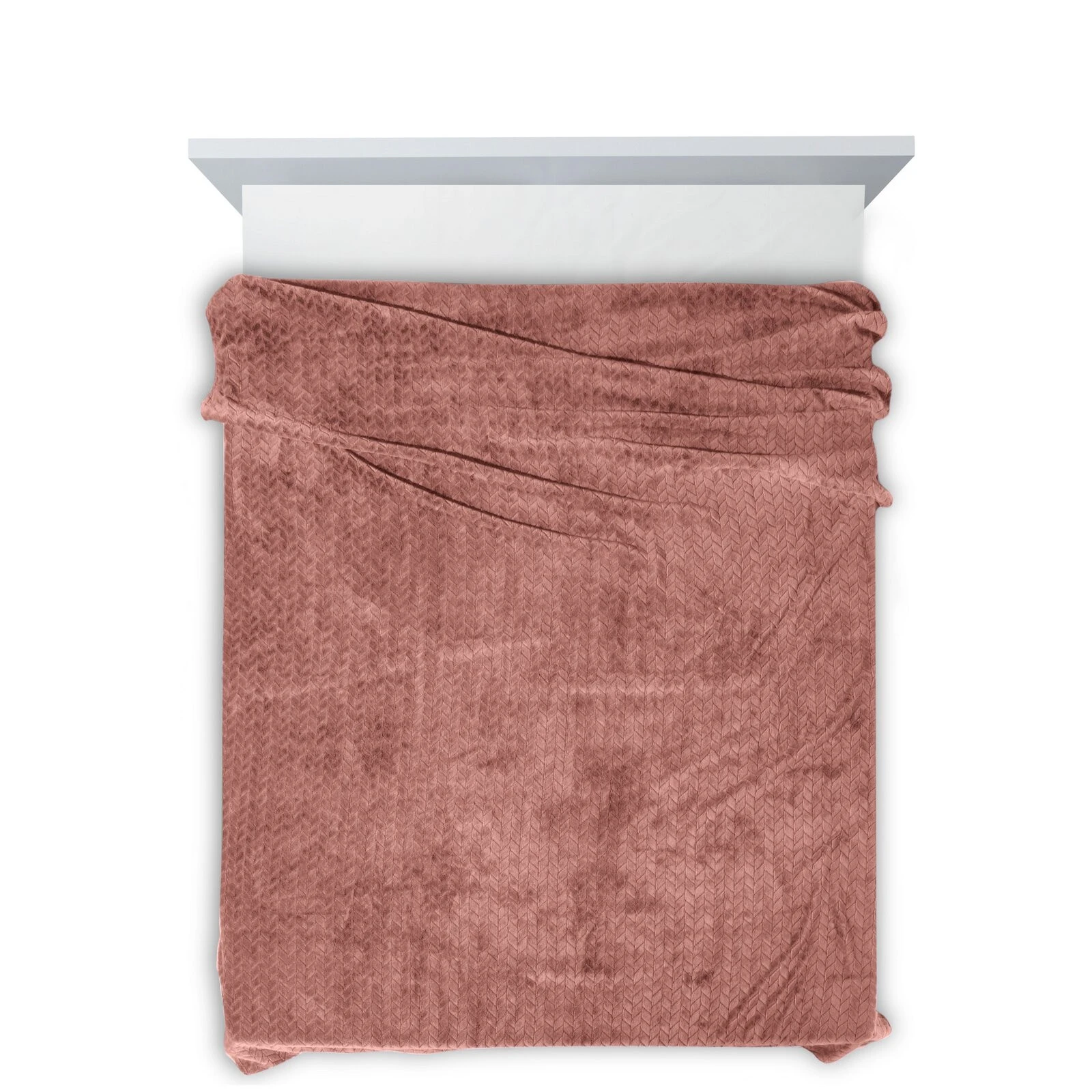 Klasyczny koc z przyjemnego w dotyku włókna w technologii mikroflano. Jednobarwna, puszysta faktura ozdobiona jest minimalistycznym tłoczeniem w formie jodełki. szerokość: 200 cm, długość: 220 cm, kolor: pudrowy róż, Gramatura: 250 GSM, Skład: 100% poliester