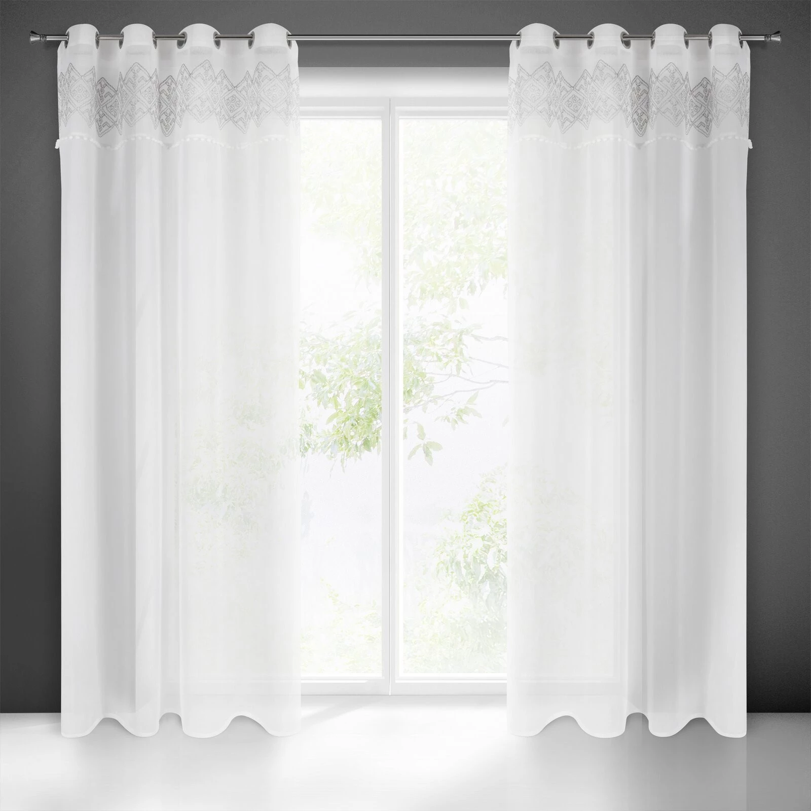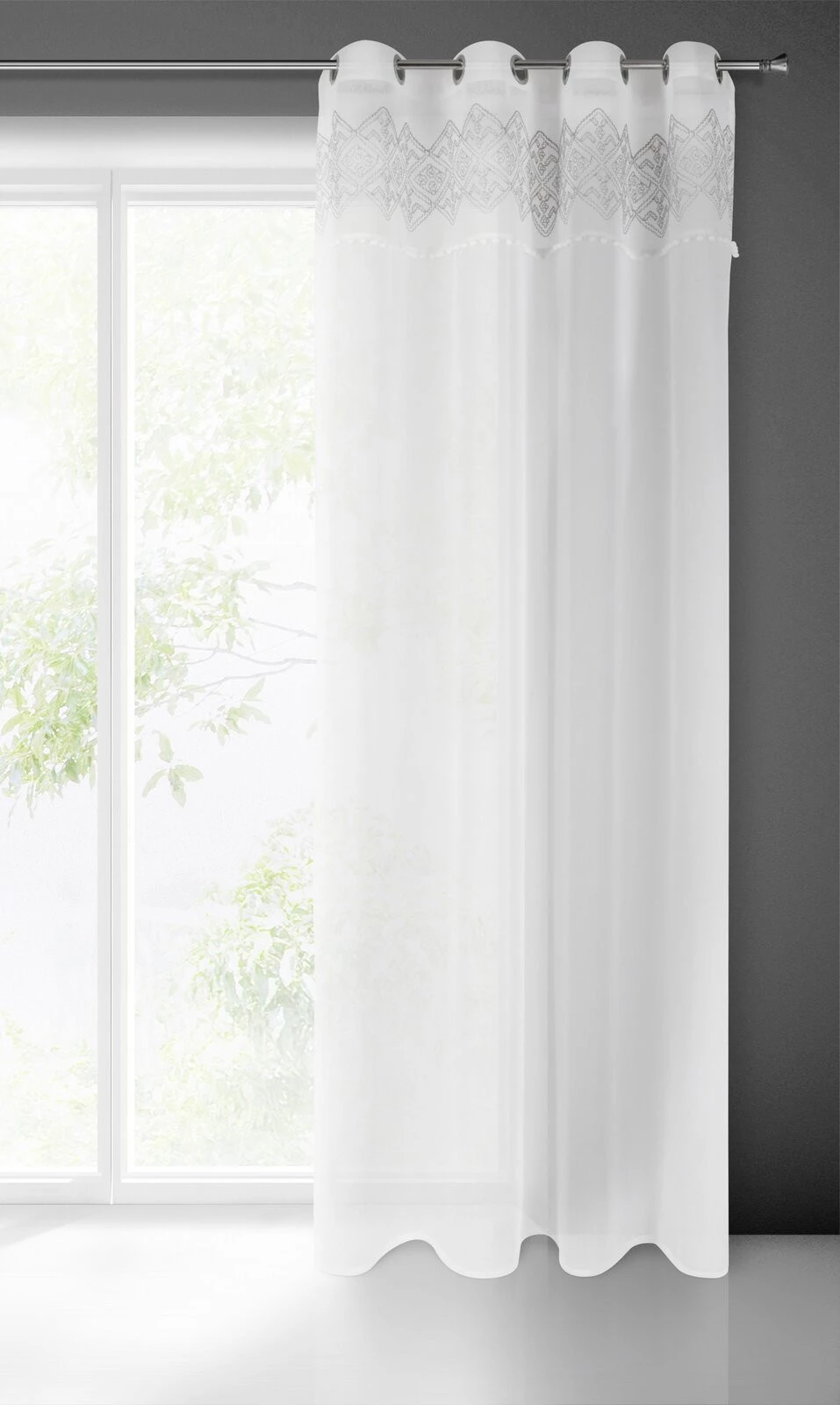 Delikatna dekoracja okienna łącząca tradycyje i nowoczesne wzory. Subtelny haft z kolorze srebra zdobi górę firany geometrycznym motywem. Wykończona pomponami. szerokość: 140 cm, długość: 250 cm, kolor: biały, Gramatura: 66 GSM, Skład: 100% poliester