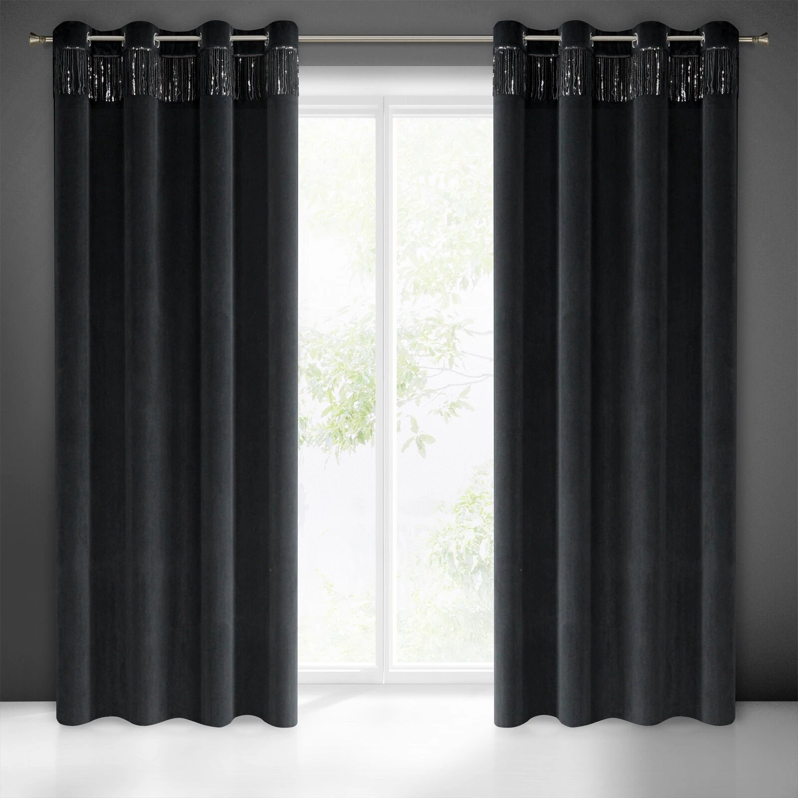Zasłona welwetowa jednokolorowa z ozdobną taśmą z cekinami szerokość: 140 cm, długość: 250 cm, kolor: czarny, Gramatura: 290 GSM, Skład: 100% poliester