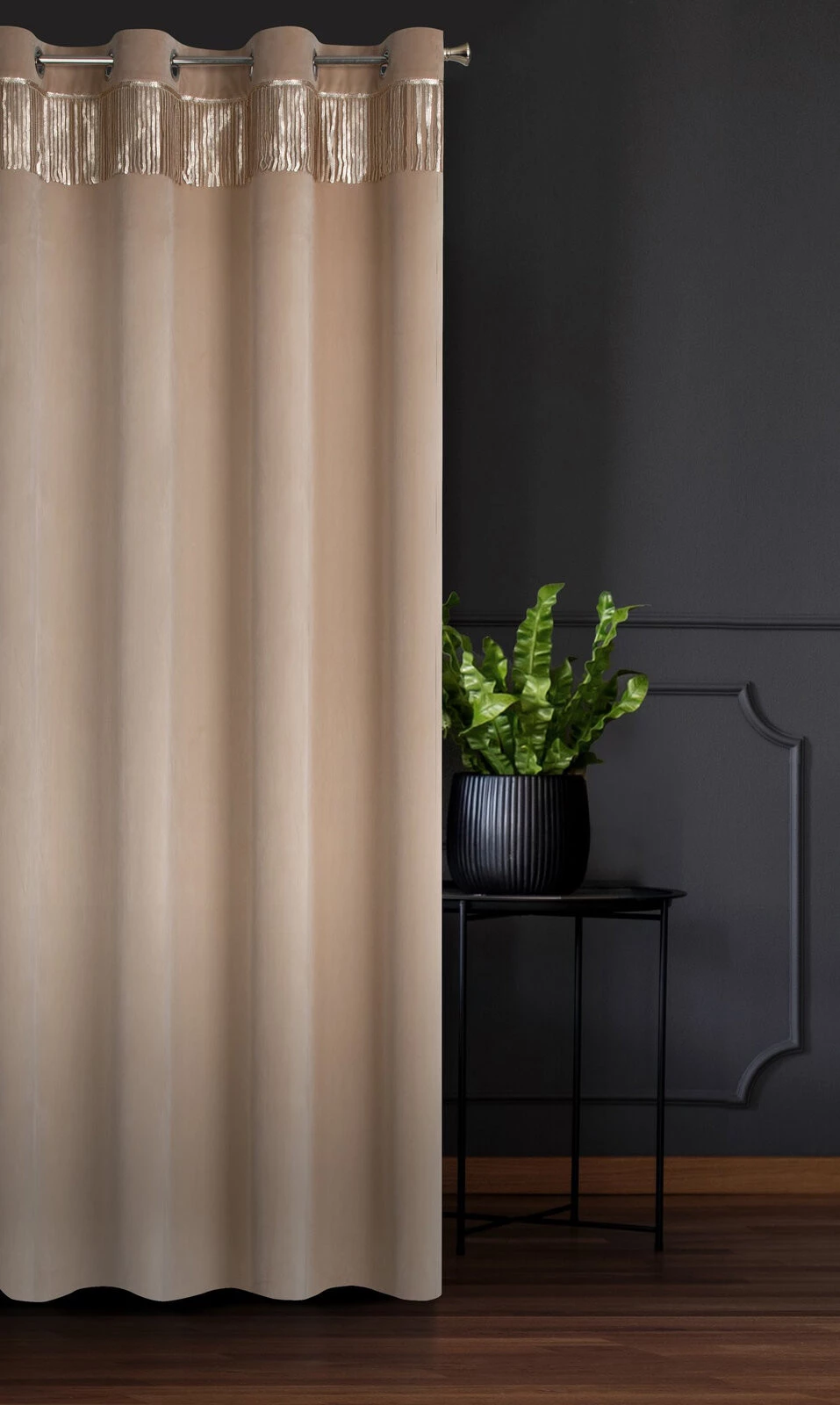 - Zasłona welwetowa jednokolorowa z ozdobną taśmą z cekinami szerokość: 140 cm, długość: 250 cm, kolor: beżowy, Gramatura: 290 GSM, Skład: 100% poliester