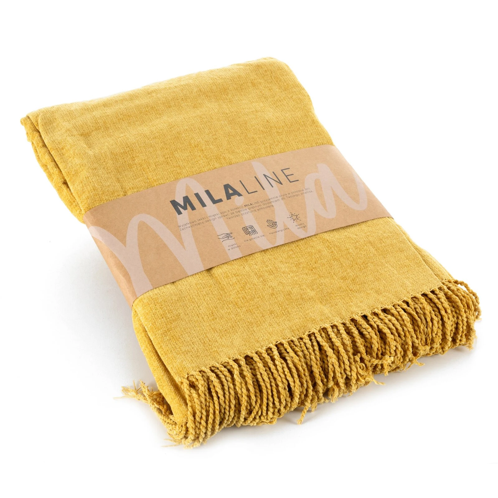 - Gładki koc szenilowy z frędzlami szerokość: 130 cm, długość: 170 cm, kolor: żółty, Gramatura: 220GSM GSM, Skład: 100% poliester