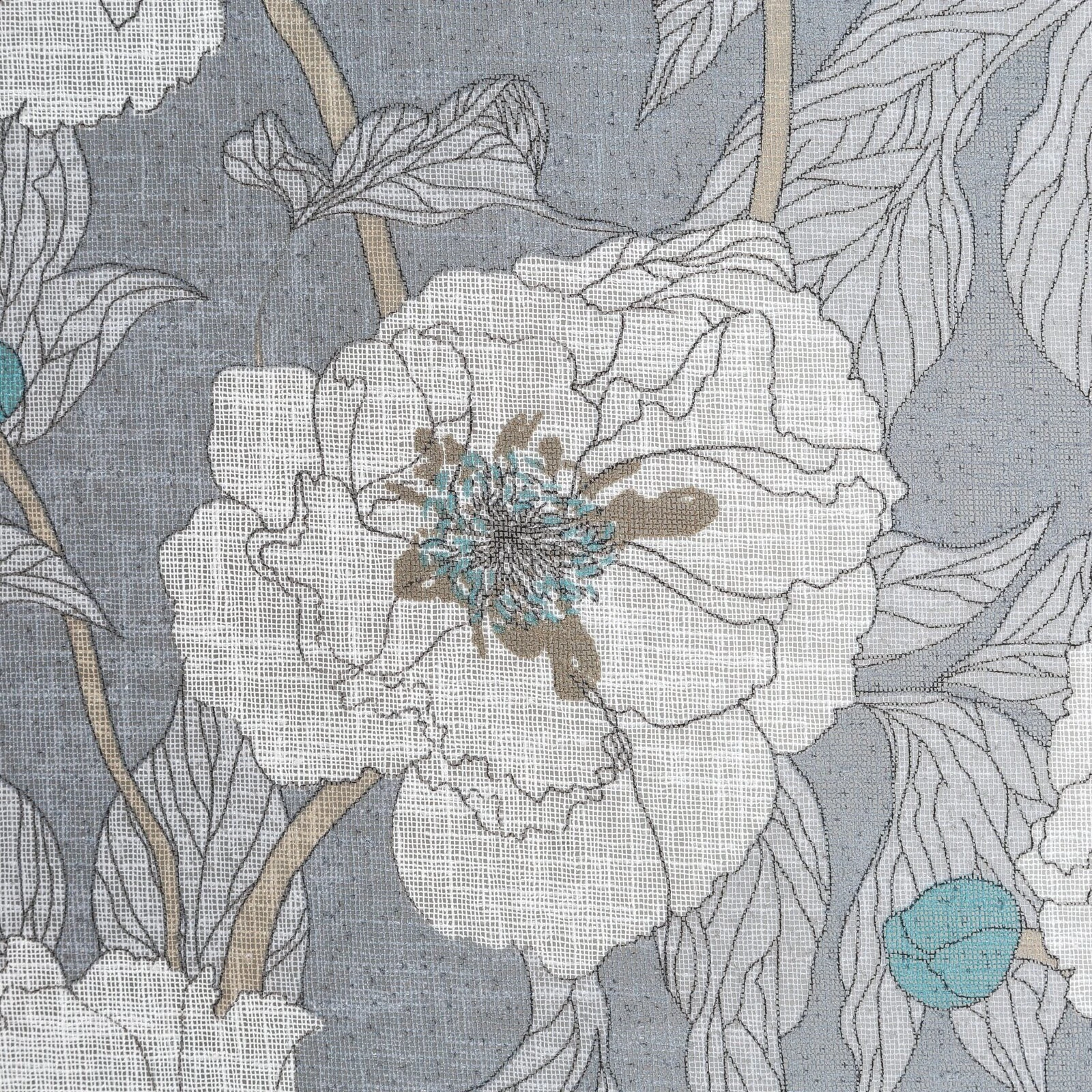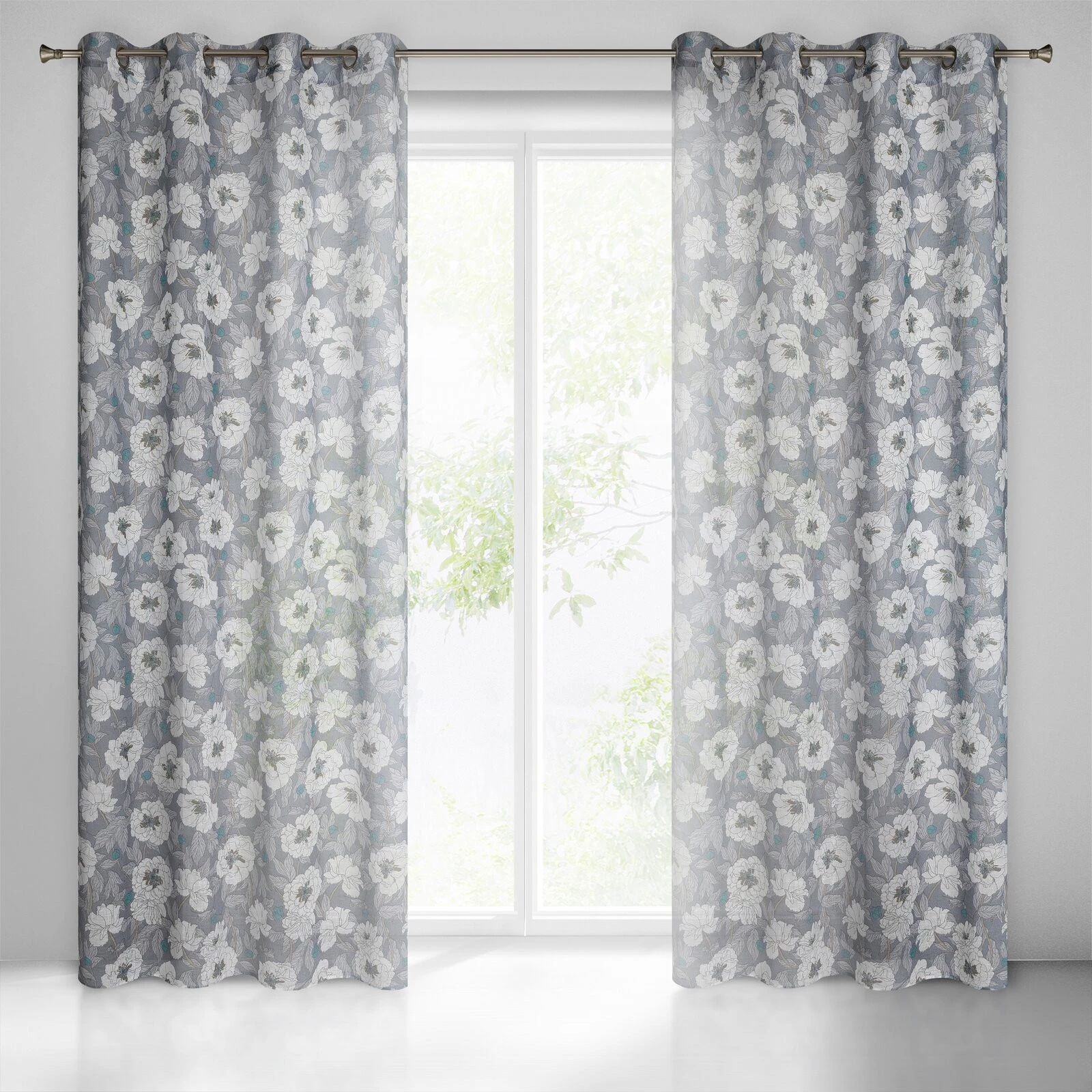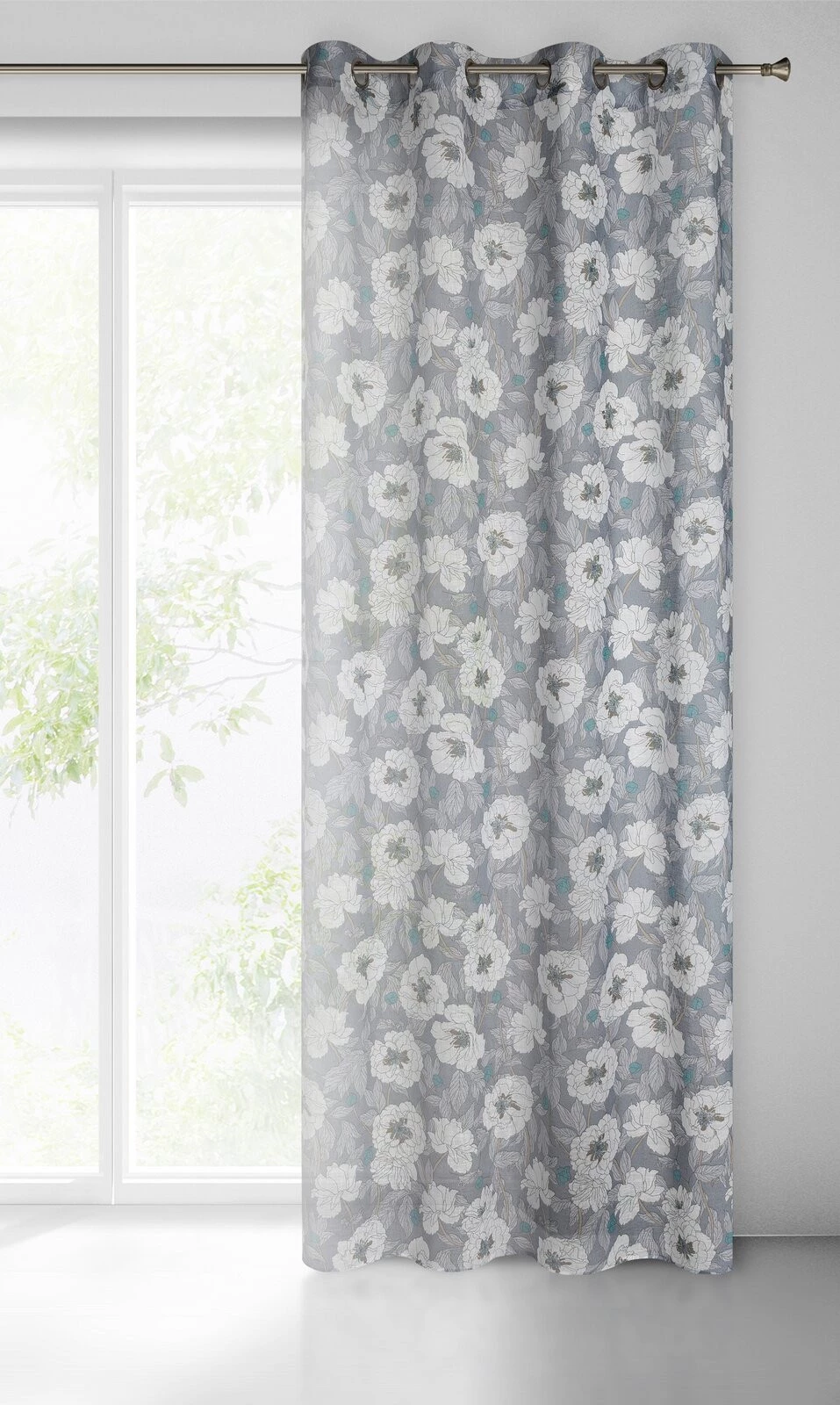 Klasyczna zasłona z tkaniny o strukturze płótna zdobiona pastelowym nadrukiem kwiatów ogrodowych. Średni stopień zaciemnienia. Tkanina łatwa w prasowaniu. szerokość: 140 cm, długość: 250 cm, kolor: popielaty, Gramatura: 130 GSM, Skład: 100% poliester