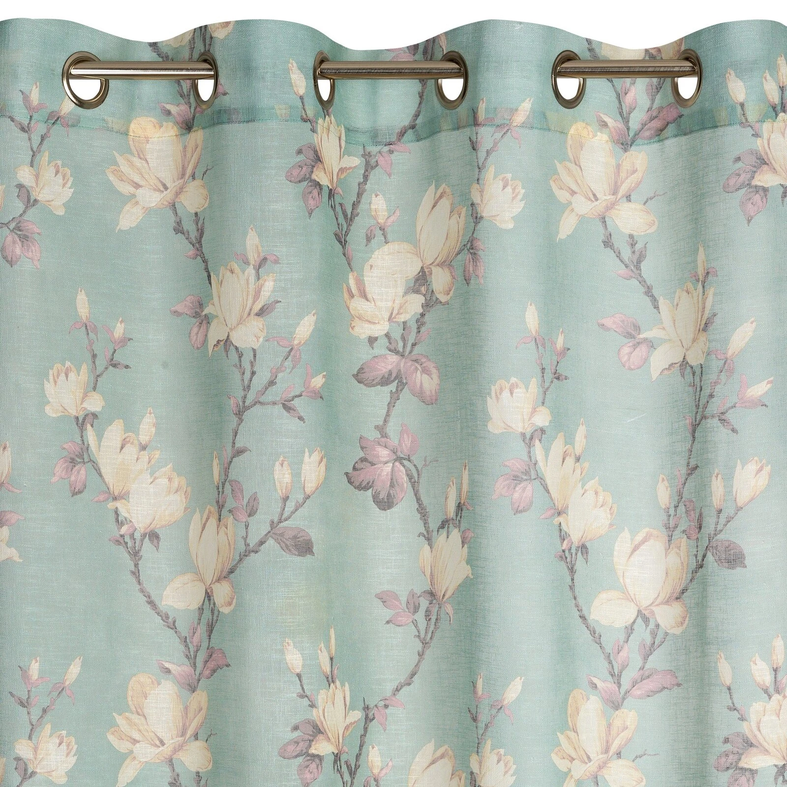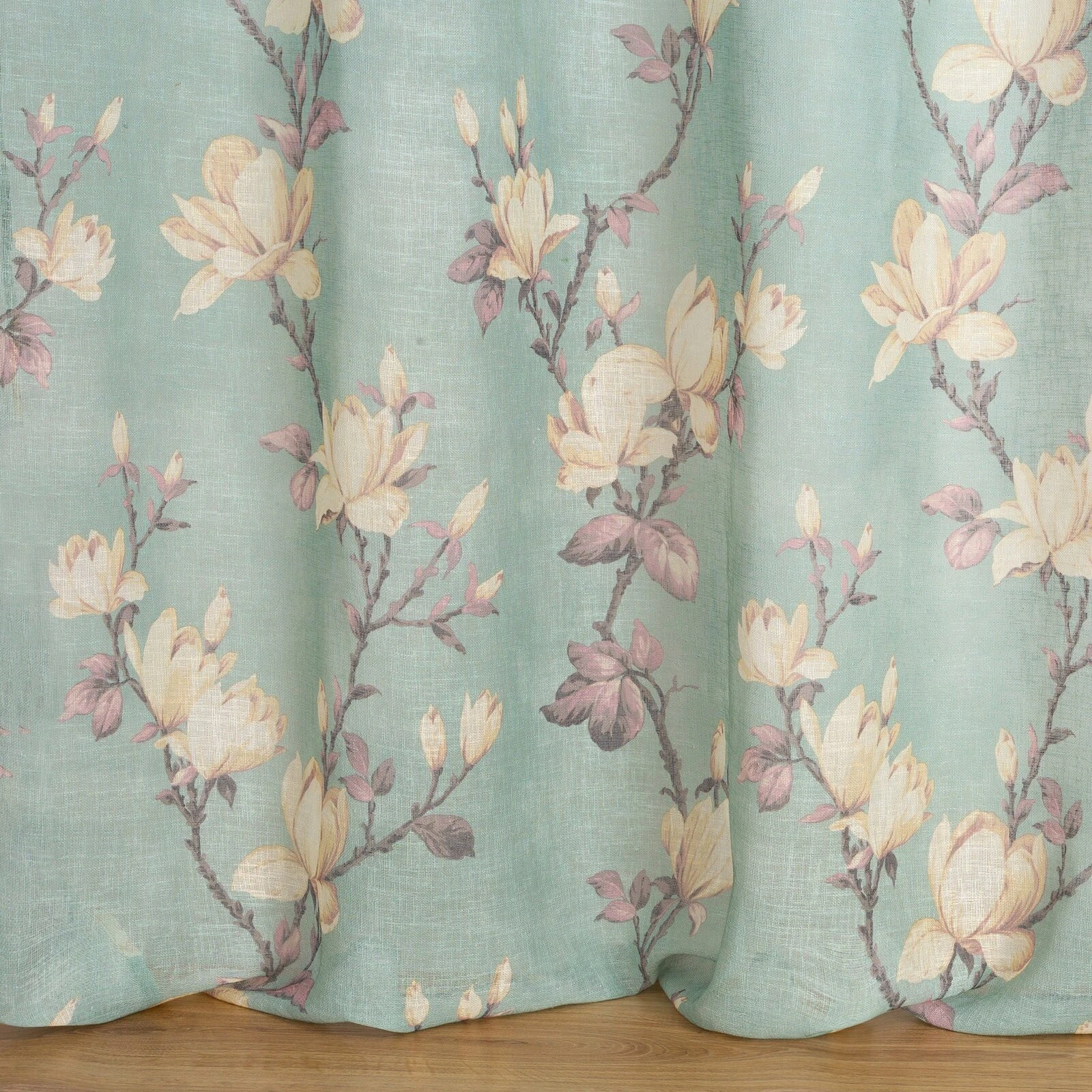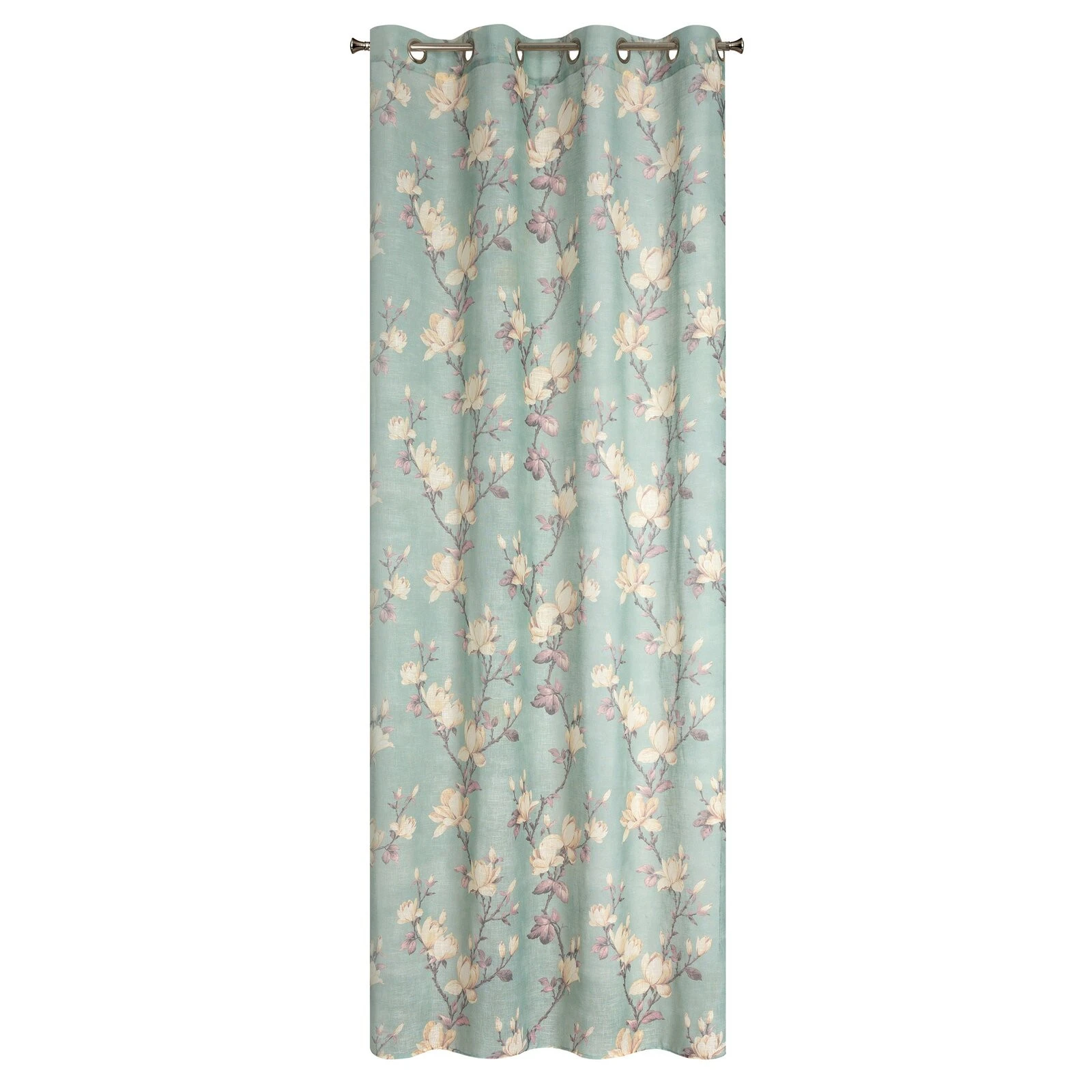 Klasyczna zasłona z tkaniny o strukturze płótna zdobiona pastelowym nadrukiem kwiatów ogrodowych. Średni stopień zaciemnienia. Tkanina łatwa w prasowaniu. szerokość: 140 cm, długość: 250 cm, kolor: miętowy, Gramatura: 130 GSM, Skład: 100% poliester