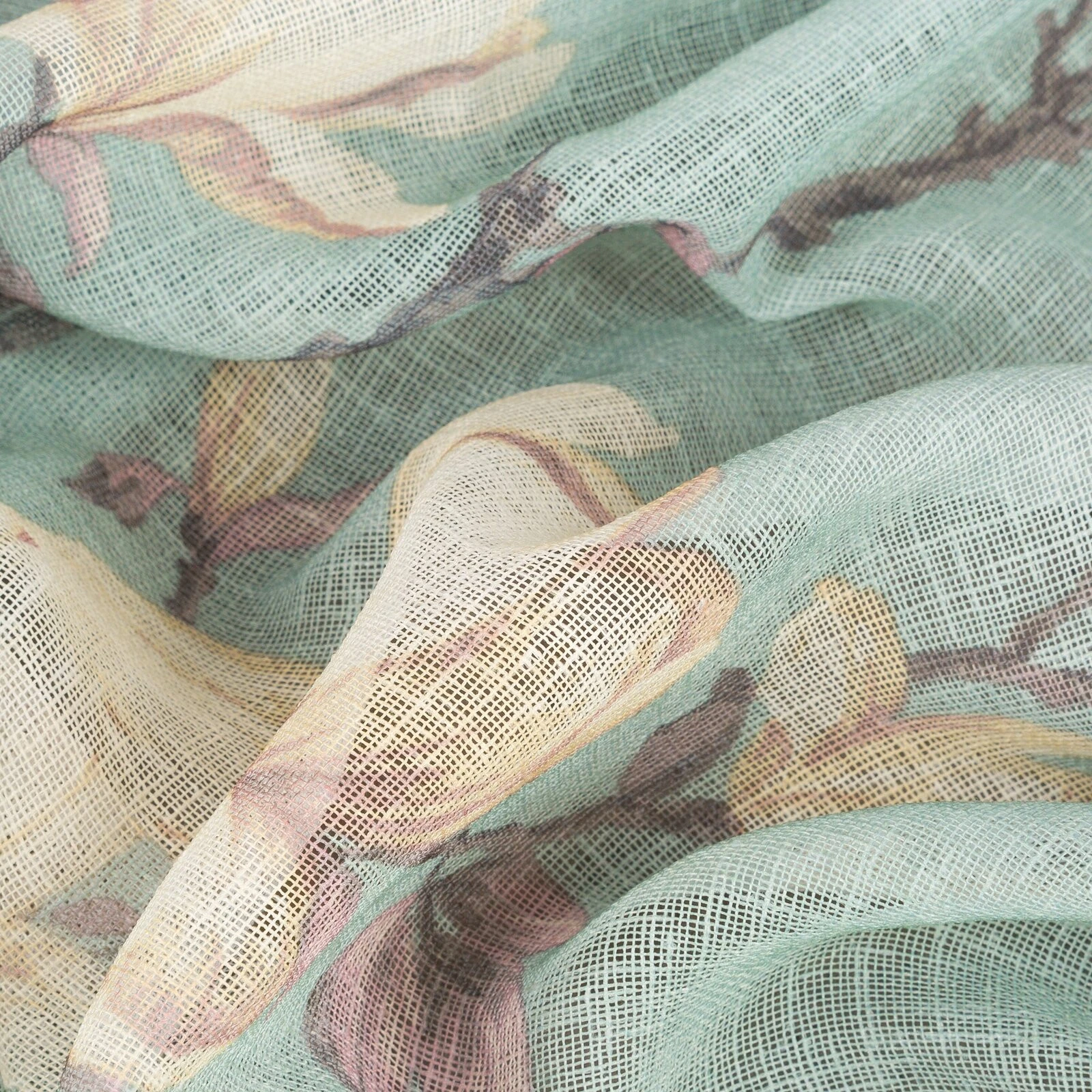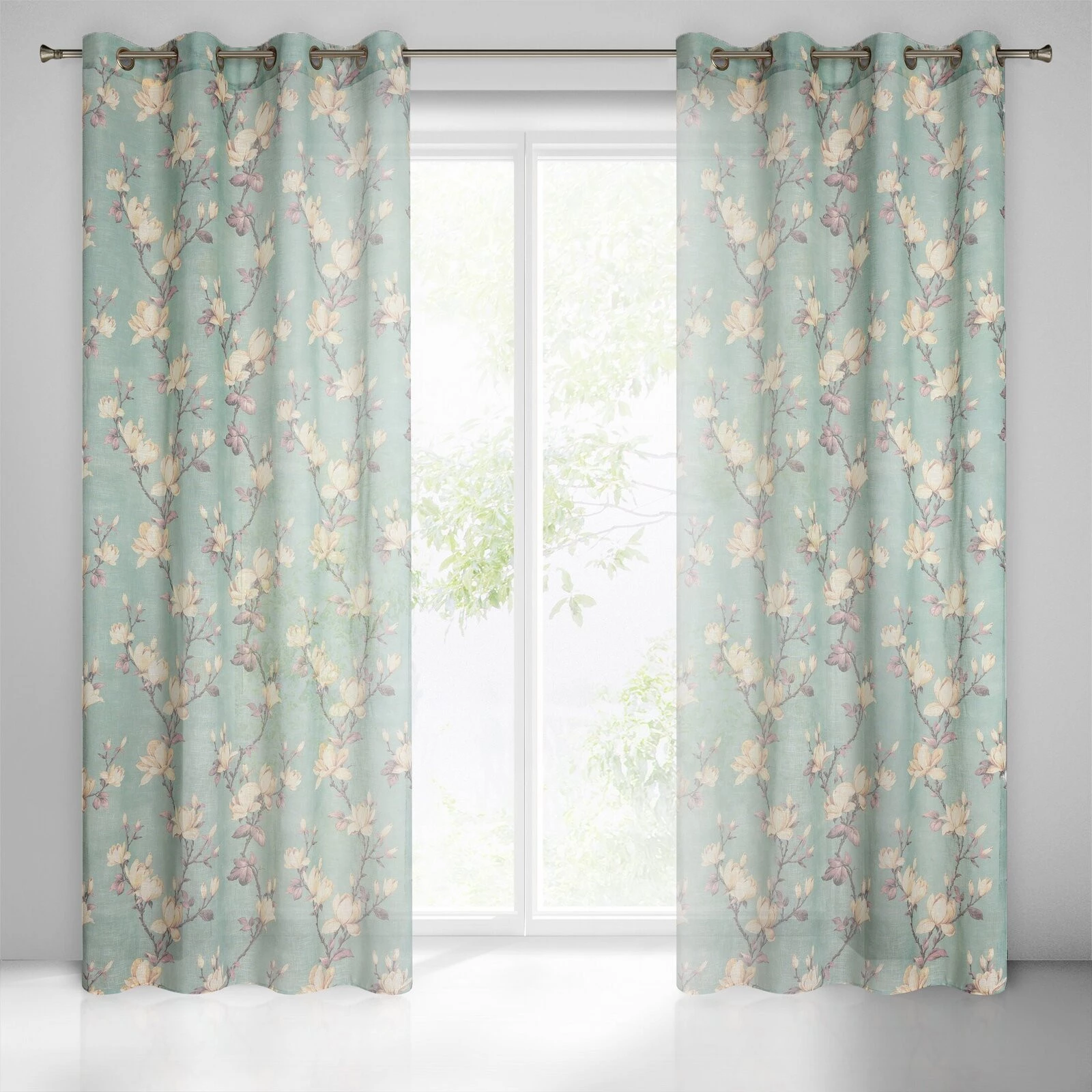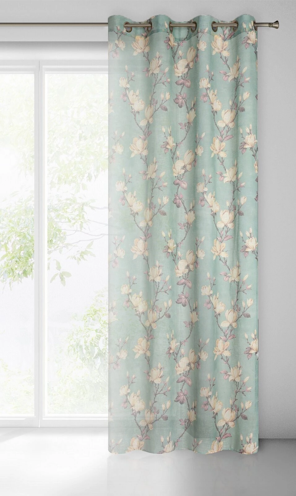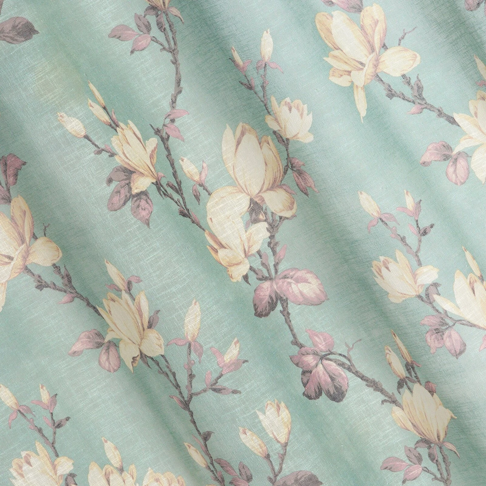 Klasyczna zasłona z tkaniny o strukturze płótna zdobiona pastelowym nadrukiem kwiatów ogrodowych. Średni stopień zaciemnienia. Tkanina łatwa w prasowaniu. szerokość: 140 cm, długość: 250 cm, kolor: miętowy, Gramatura: 130 GSM, Skład: 100% poliester