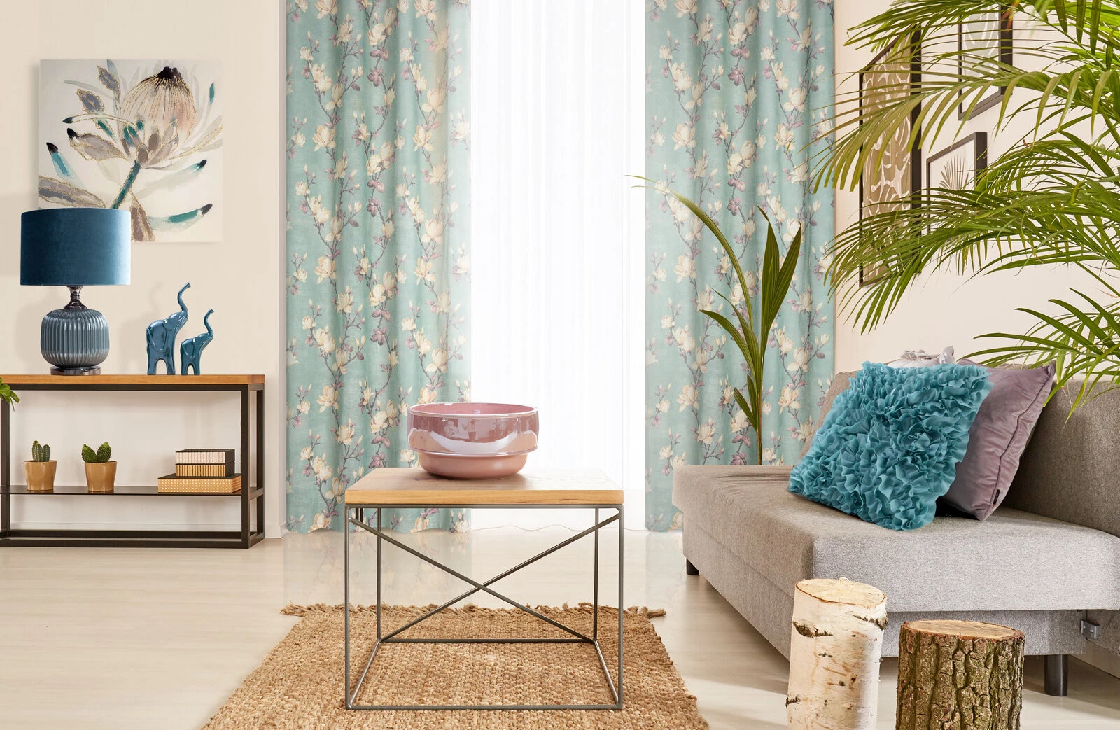 - Klasyczna zasłona z tkaniny o strukturze płótna zdobiona pastelowym nadrukiem kwiatów ogrodowych. Średni stopień zaciemnienia. Tkanina łatwa w prasowaniu. szerokość: 140 cm, długość: 250 cm, kolor: miętowy, Gramatura: 130 GSM, Skład: 100% poliester