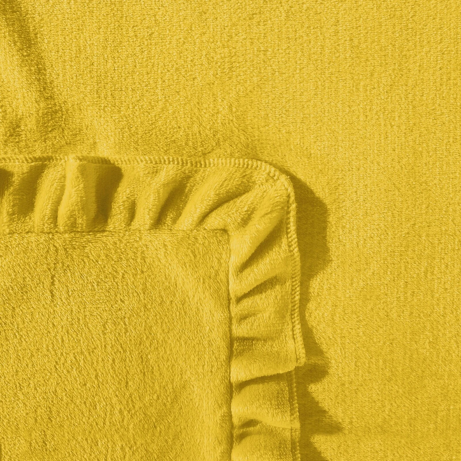 Gładki, jednokolorowy koc z szeroką, dekoracyjną falbanką. Miękki i przyjemny w dotyku pled z mikroflano jest łatwy w praniu. Doskonały w sielankowych stylach. szerokość: 150 cm, długość: 200 cm, kolor: musztardowy, Gramatura: 250 GSM GSM, Skład: 100% poliester
