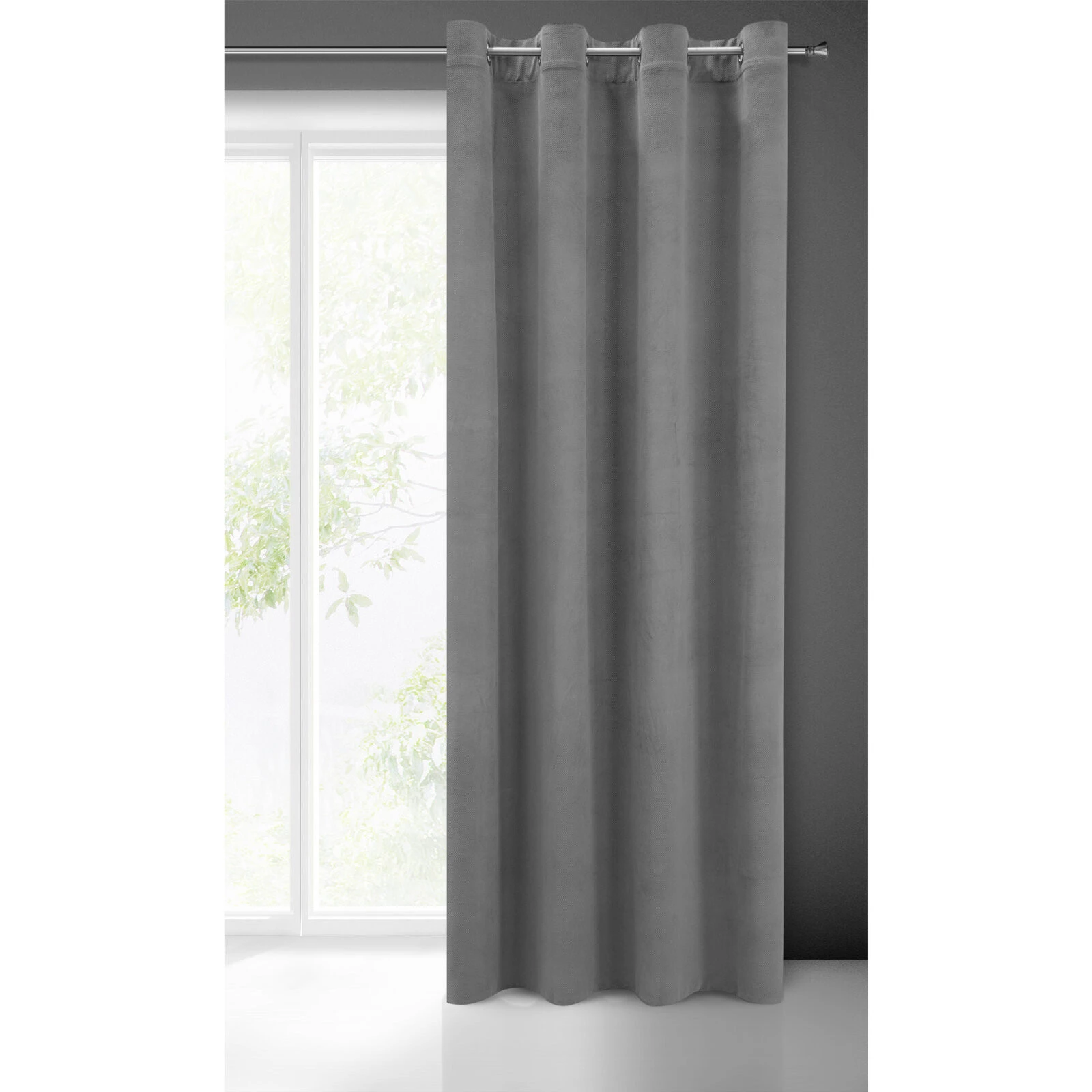 - Zasłona welwetowa strukturalna szerokość: 140 cm, długość: 250 cm, kolor: stalowy, Gramatura: 200 GSM, Skład: 100% poliester
