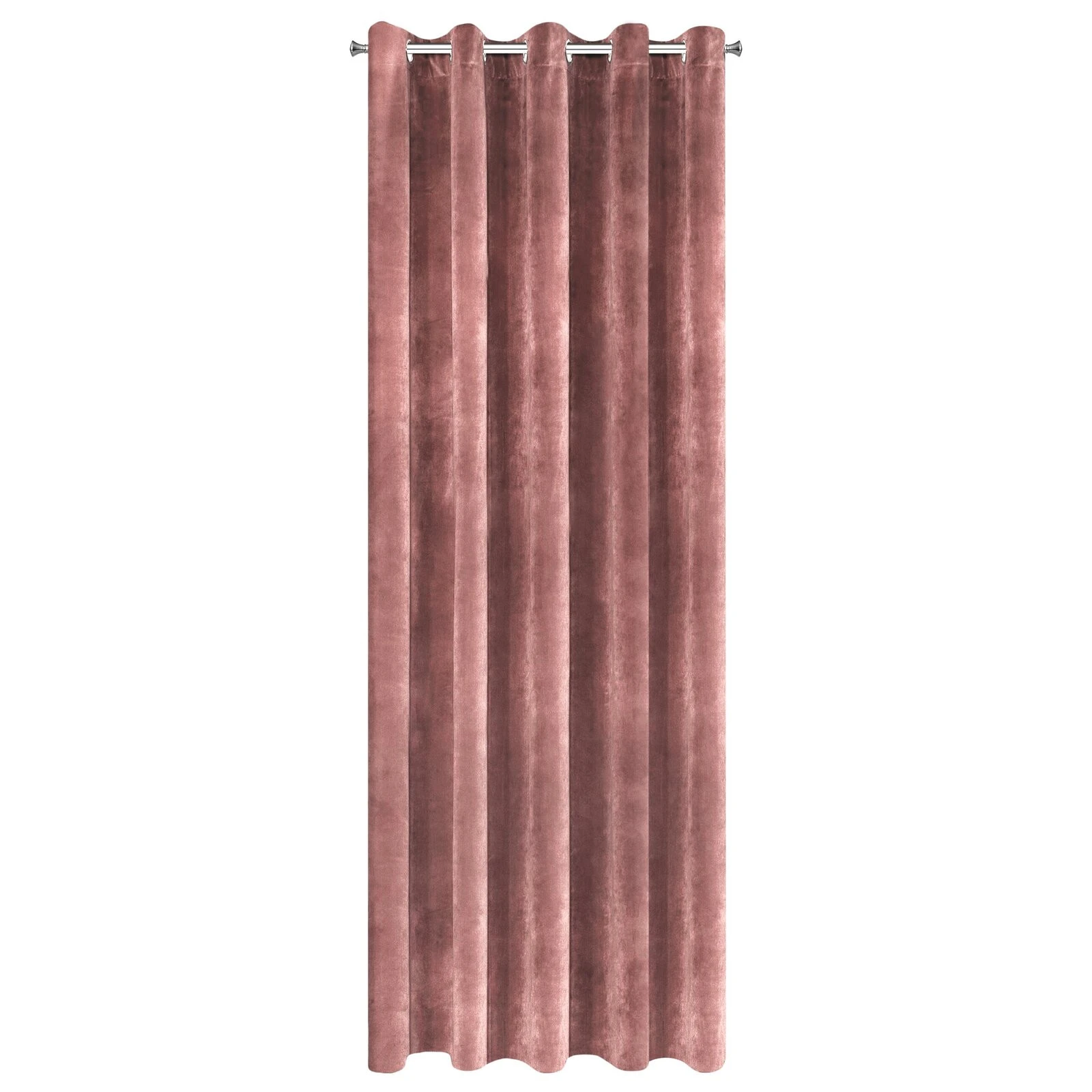 Gładka, jednokolorowa zasłona z miękkiego welwetu o charakterystycznym dla aksamitu połysku. Aż 10 szerokich przelotek umożliwia proste upięcie dekoracji okna. szerokość: 140 cm, długość: 250 cm, kolor: różowy, Gramatura: 290 GSM, Skład: 100% poliester