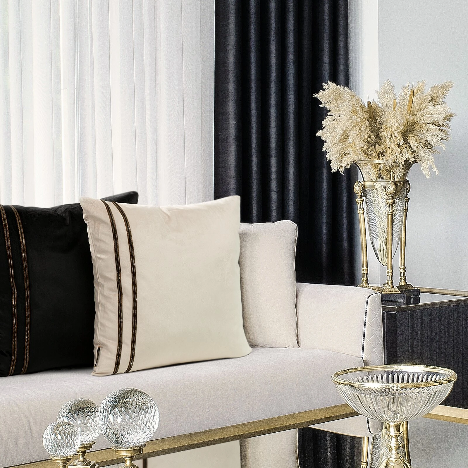 - Welwetowa poszewka przeszyta dakoracyjną pasmanterią szerokość: 45 cm, długość: 45 cm, kolor: kremowy, Gramatura: 250 GSM, Skład: 100% poliester