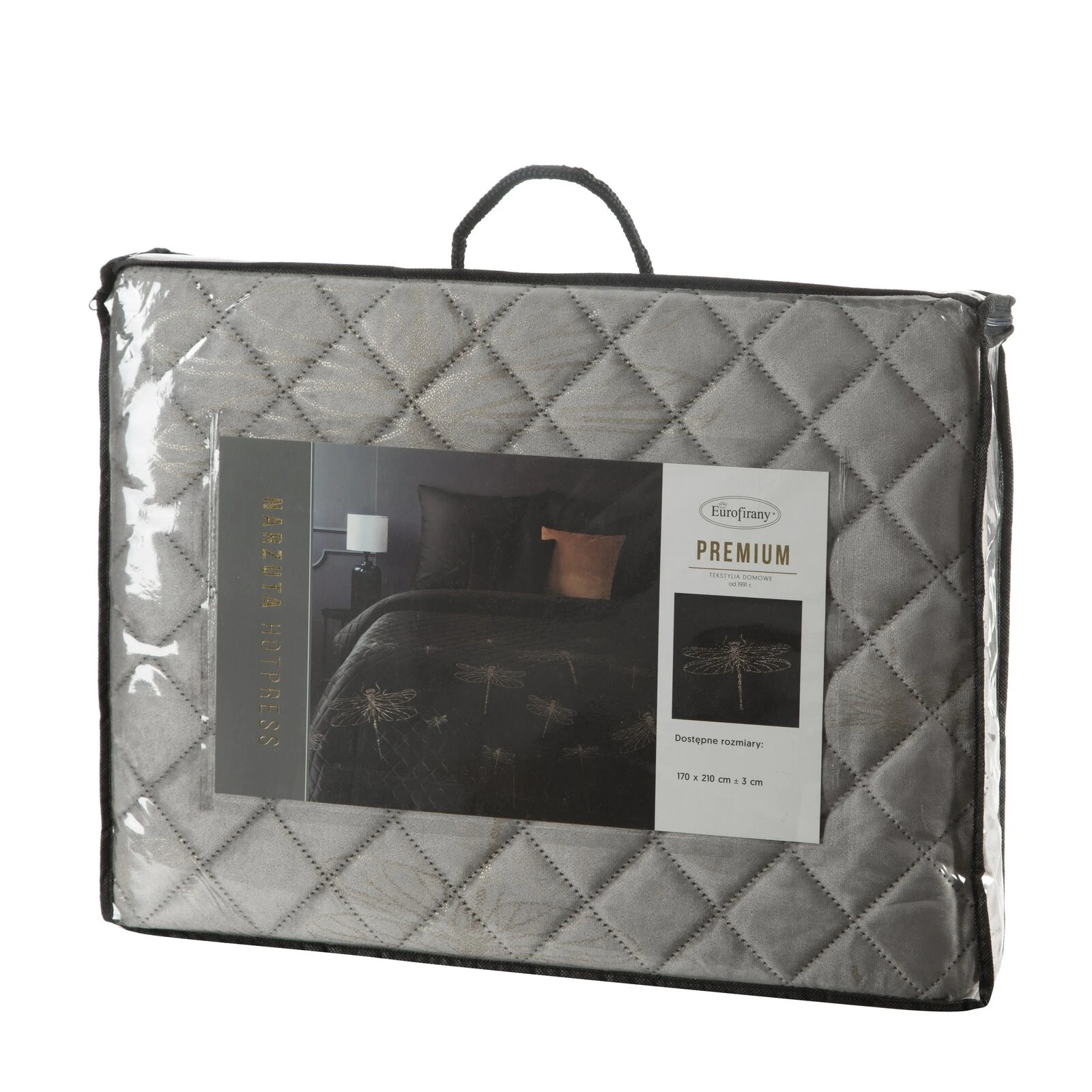 - Narzuta welwetowa, wykonana techniką "hot press"z foliowym nadrukiem szerokość: 170 cm, długość: 210 cm, kolor: srebrny, Gramatura: 210+120+70 GSM, Skład: 100% poliester
