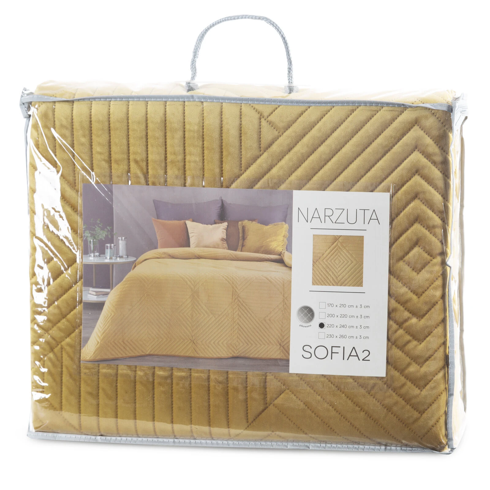 - Ekskluzywna narzuta na łóżko z miękkiego i przyjemnego w dotyku welwetu pikowanego w dużą, gęstą jodełką. Do pikowania wykorzystano metodę bezszwową hotpress. szerokość: 220 cm, długość: 240 cm, kolor: miodowy, Gramatura: 250+120+65 GSM, Skład: 100% polie