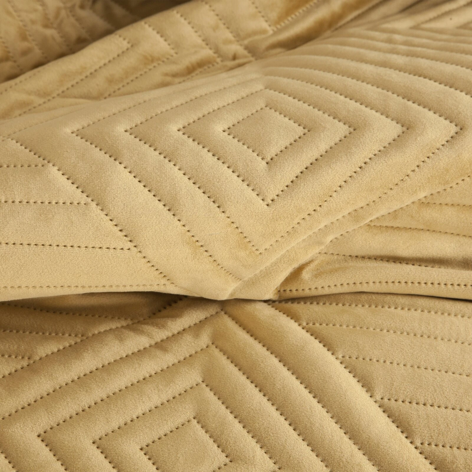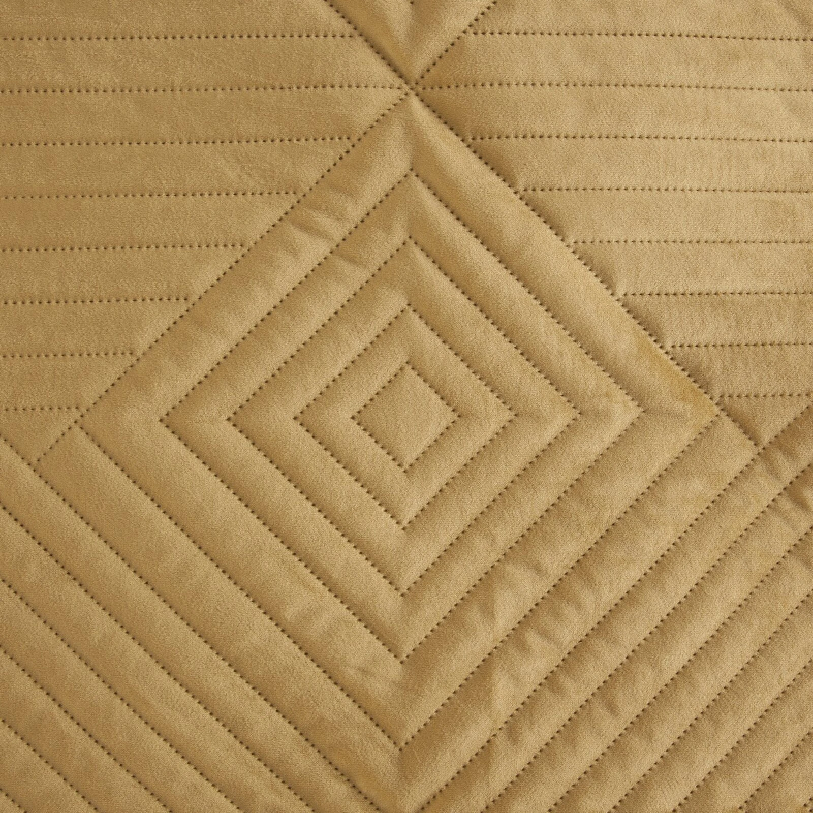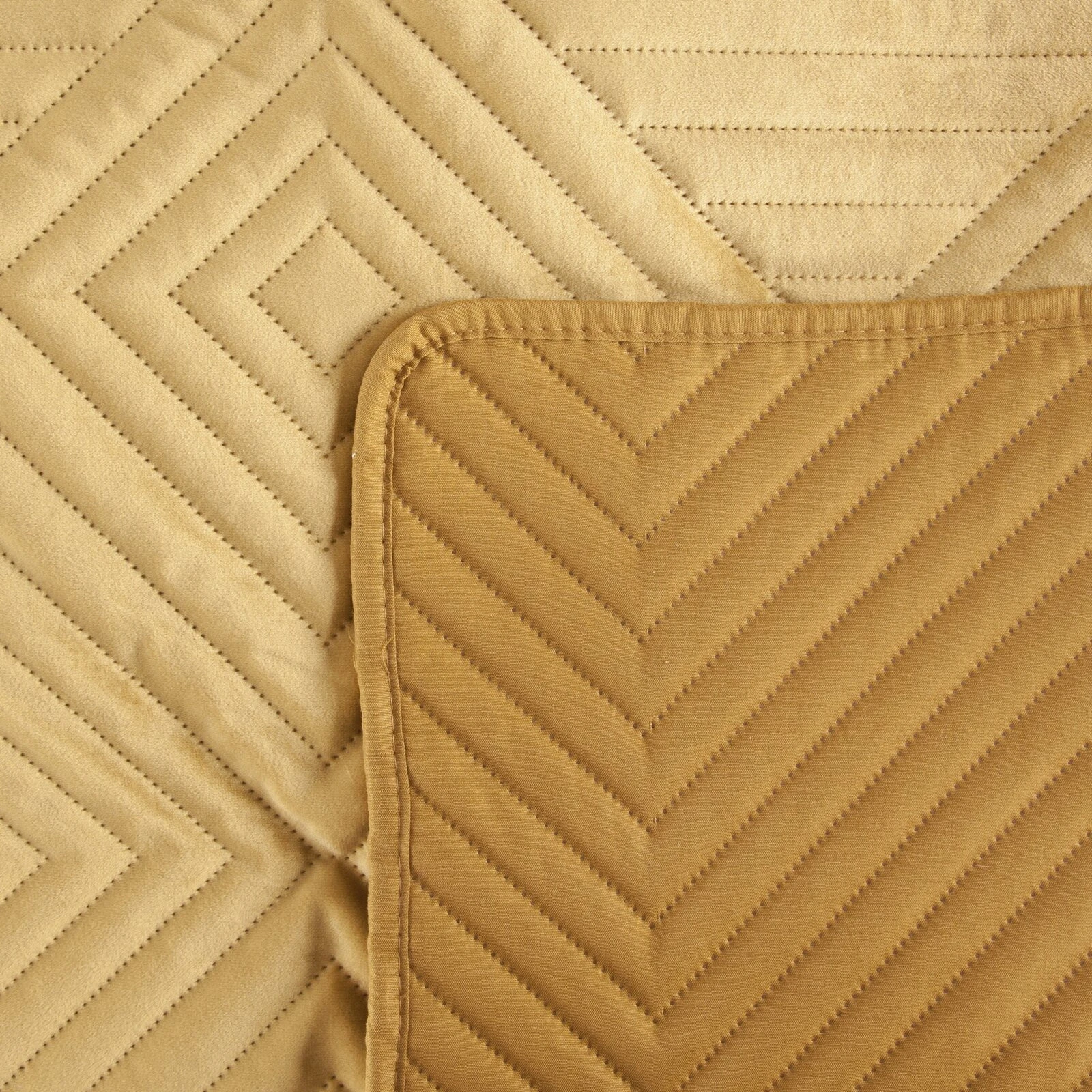 Ekskluzywna narzuta na łóżko z miękkiego i przyjemnego w dotyku welwetu pikowanego w dużą, gęstą jodełką. Do pikowania wykorzystano metodę bezszwową hotpress. szerokość: 220 cm, długość: 240 cm, kolor: miodowy, Gramatura: 250+120+65 GSM, Skład: 100% poliester