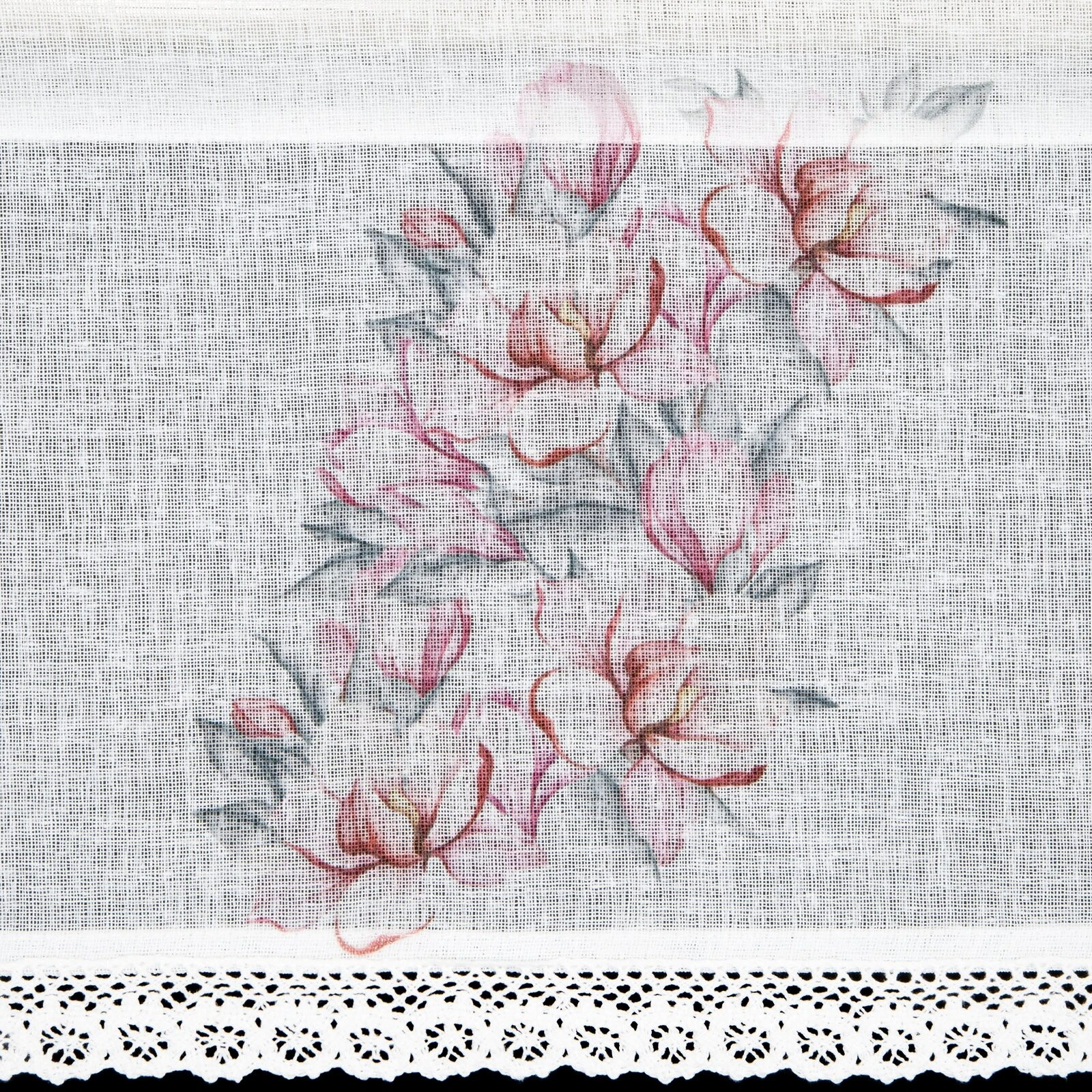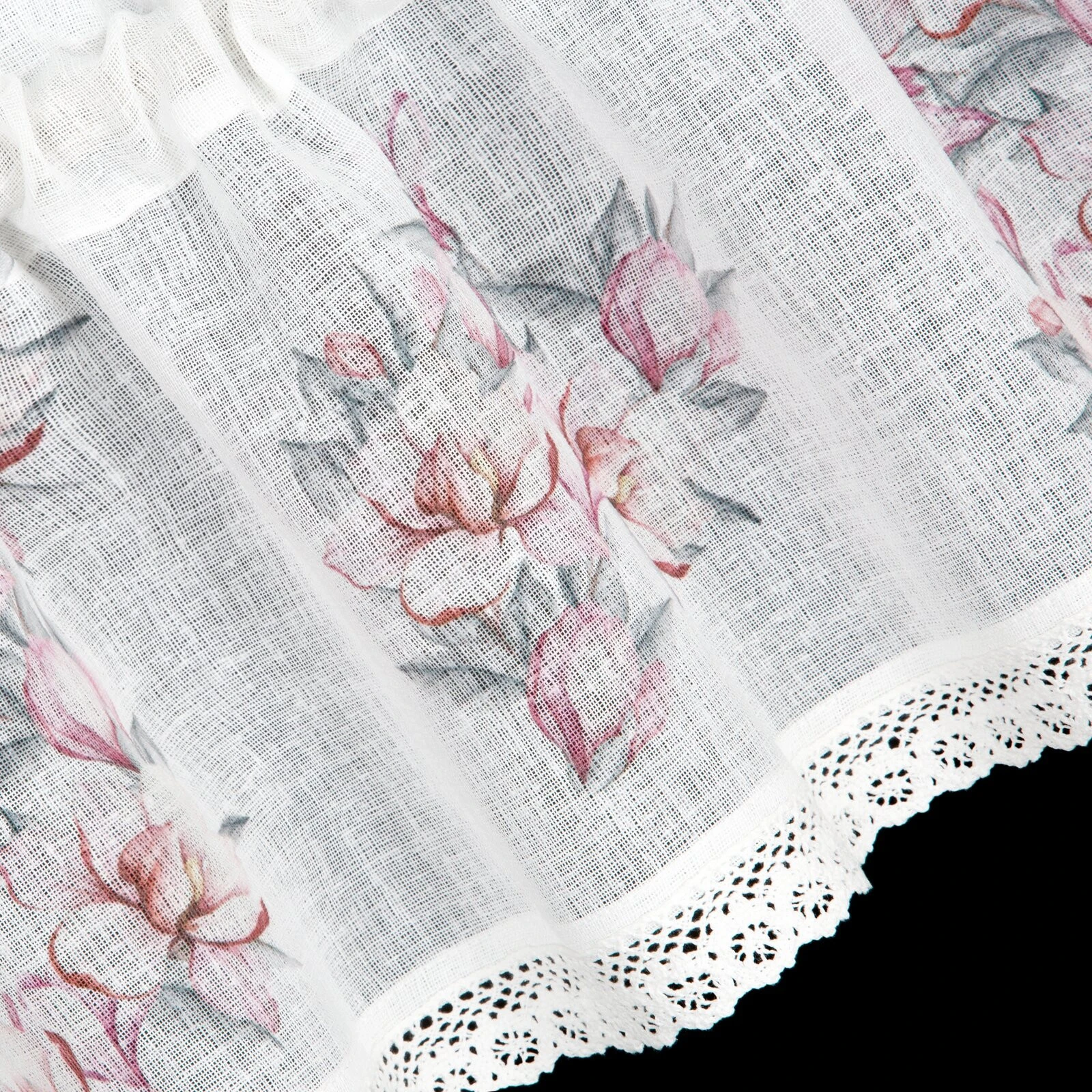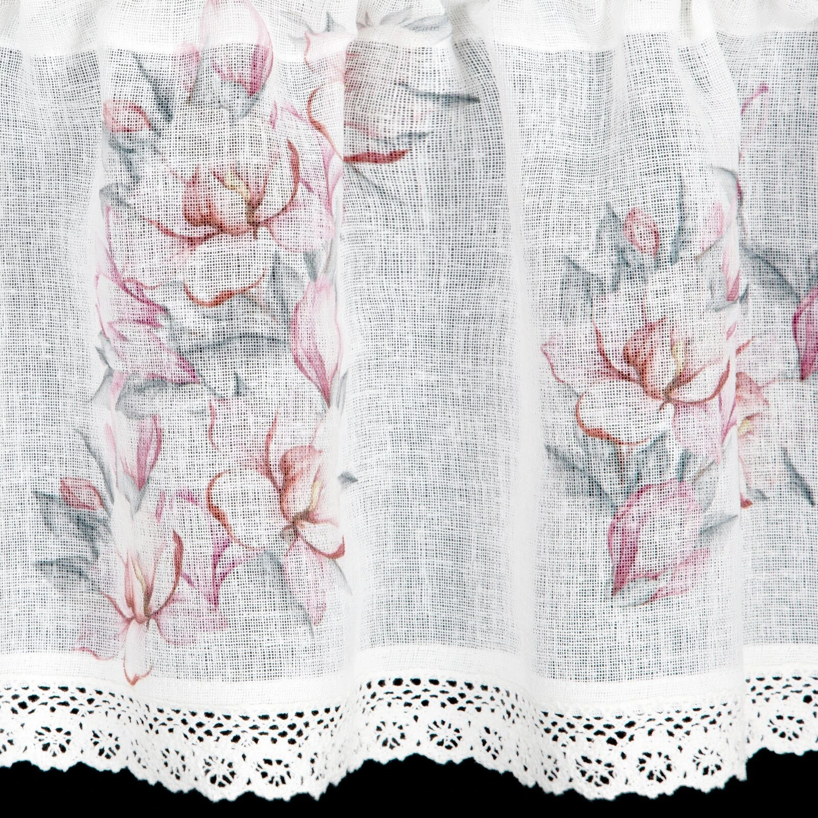 - Zazdrostka z nadrukiem zdobiona koronką szerokość: 150 cm, długość: 30 cm, kolor: biały, Gramatura: 110 GSM, Skład: 100% poliester
