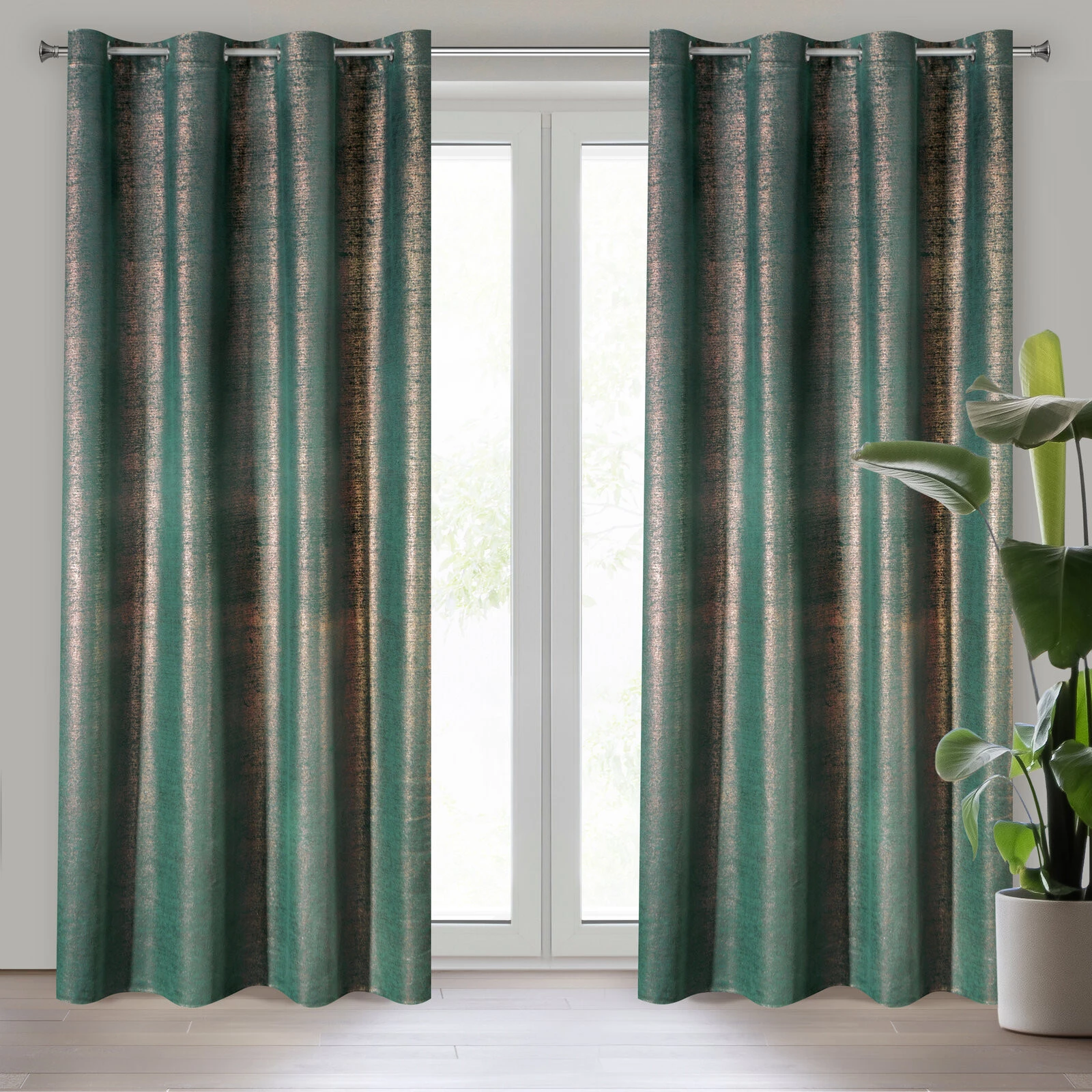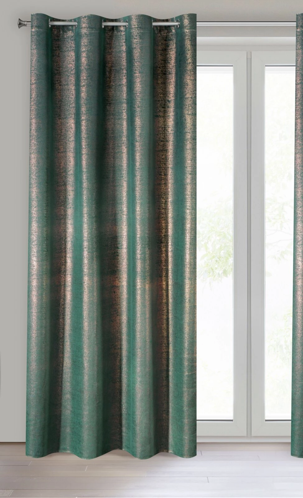 Zasłona welwetowa z miedzianym nadrukiem szerokość: 140 cm, długość: 250 cm, kolor: ciemnoturkusowy, Gramatura: 200 GSM, Skład: 100% poliester