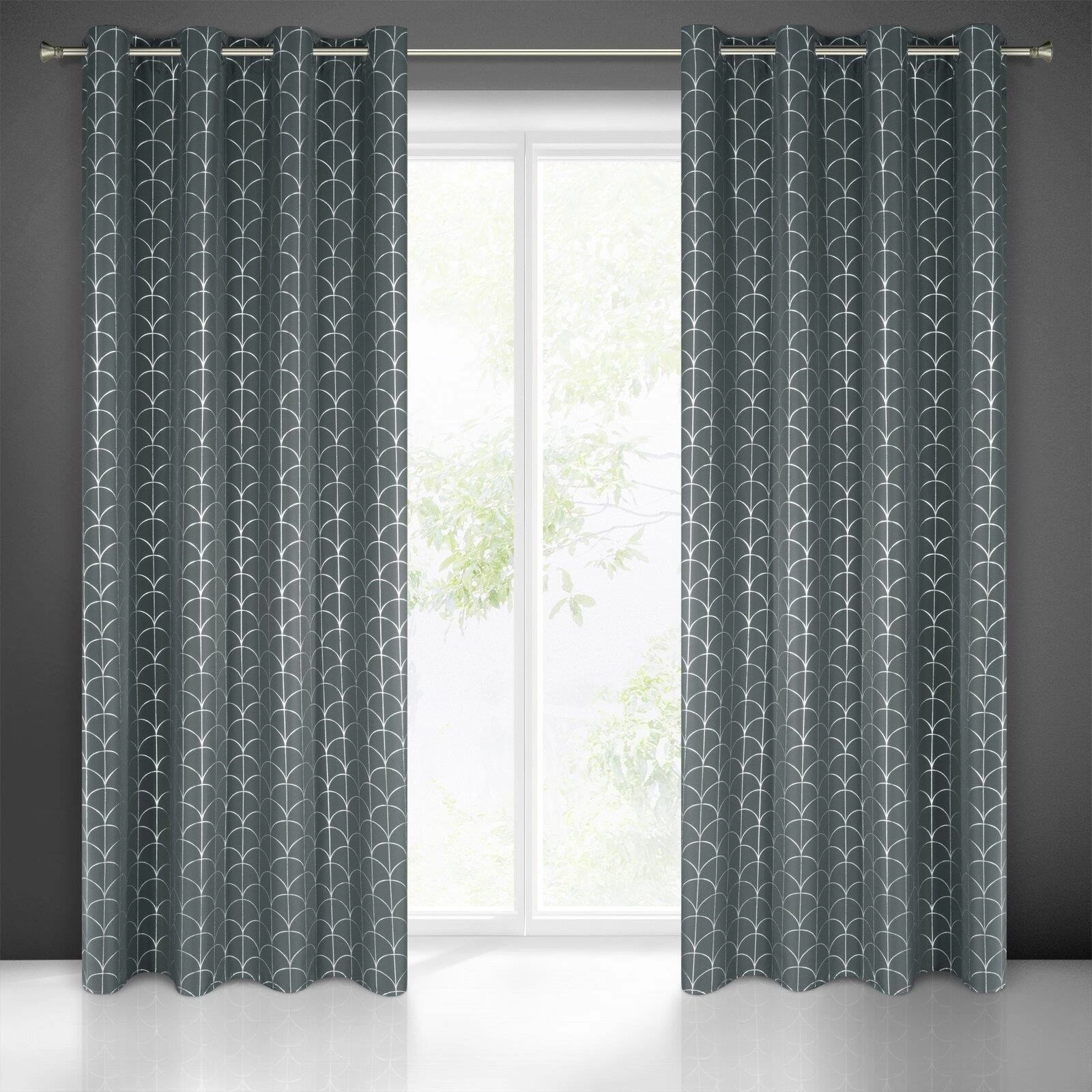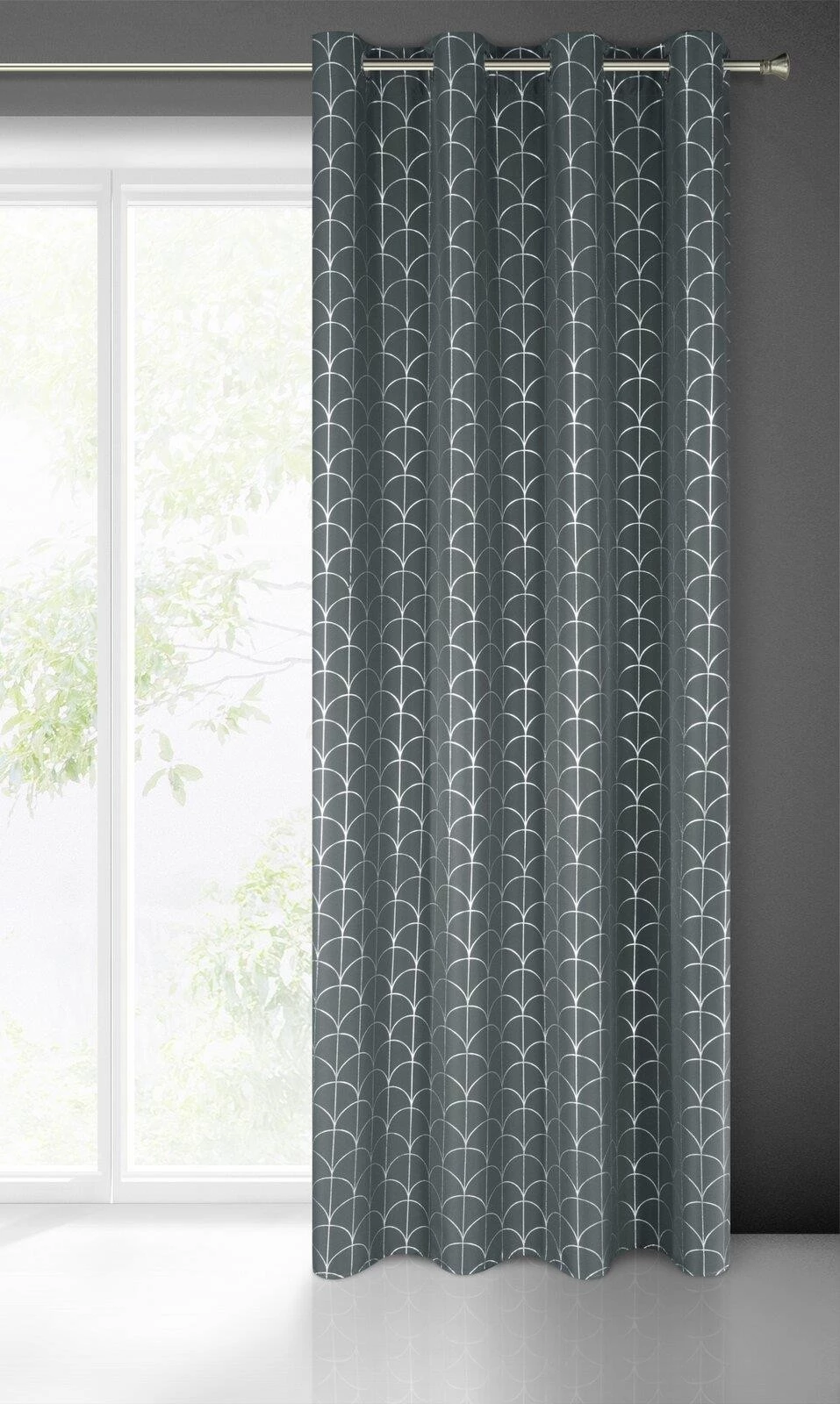 Minimalistyczna zasłona w kolorze niebieskim zdobiona srebrzystym nadrukiem w formie wzoru rybiej łuski. Półzaciemniająca tkanina miękko się układa w fale. szerokość: 140 cm, długość: 250 cm, kolor: grafitowy, Gramatura: 140 GSM, Skład: 100% poliester