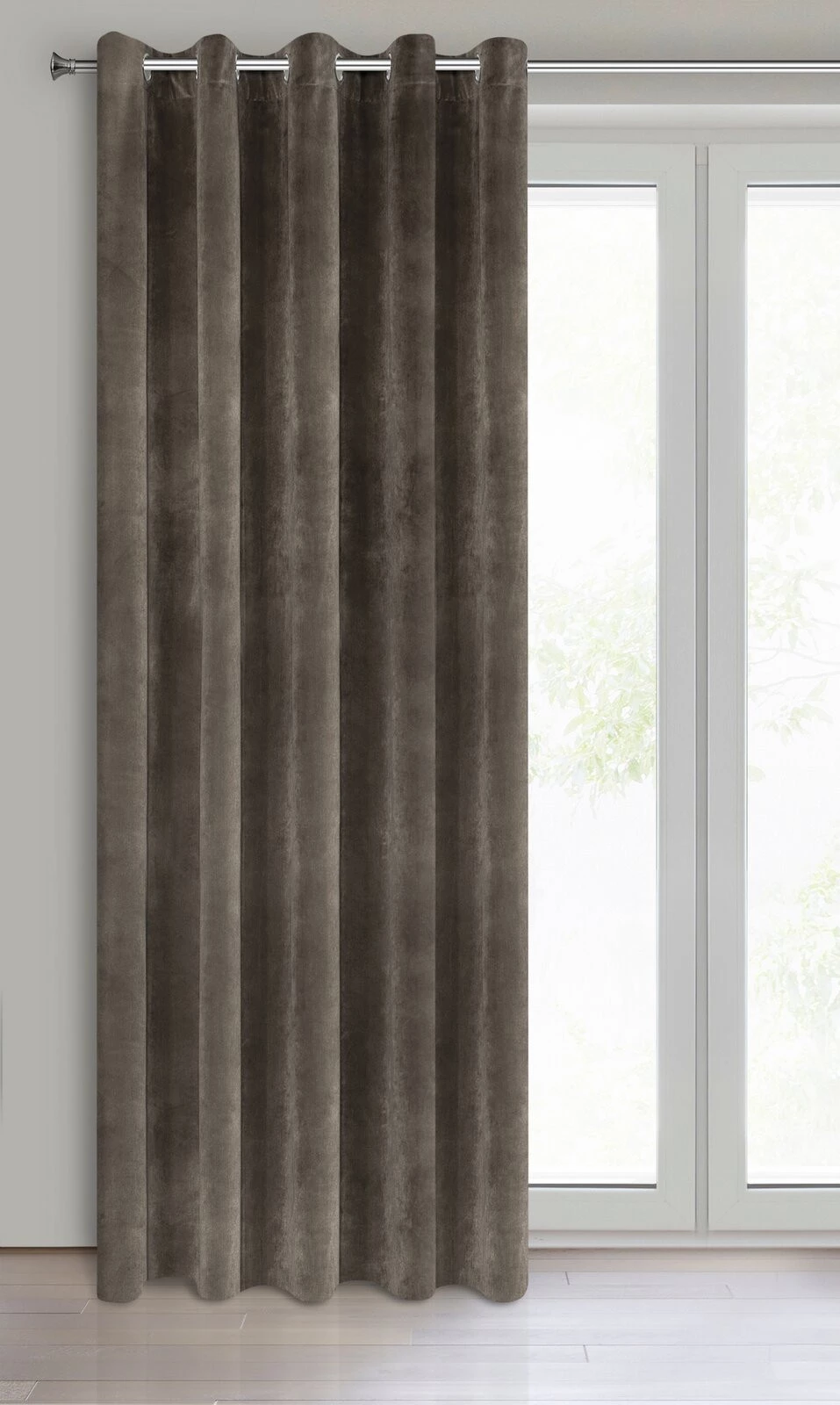Gładka, jednokolorowa zasłona z miękkiego welwetu o charakterystycznym dla aksamitu połysku. Aż 10 szerokich przelotek umożliwia proste upięcie dekoracji okna. szerokość: 140 cm, długość: 250 cm, kolor: grafitowy, Gramatura: 290 GSM, Skład: 100% poliester