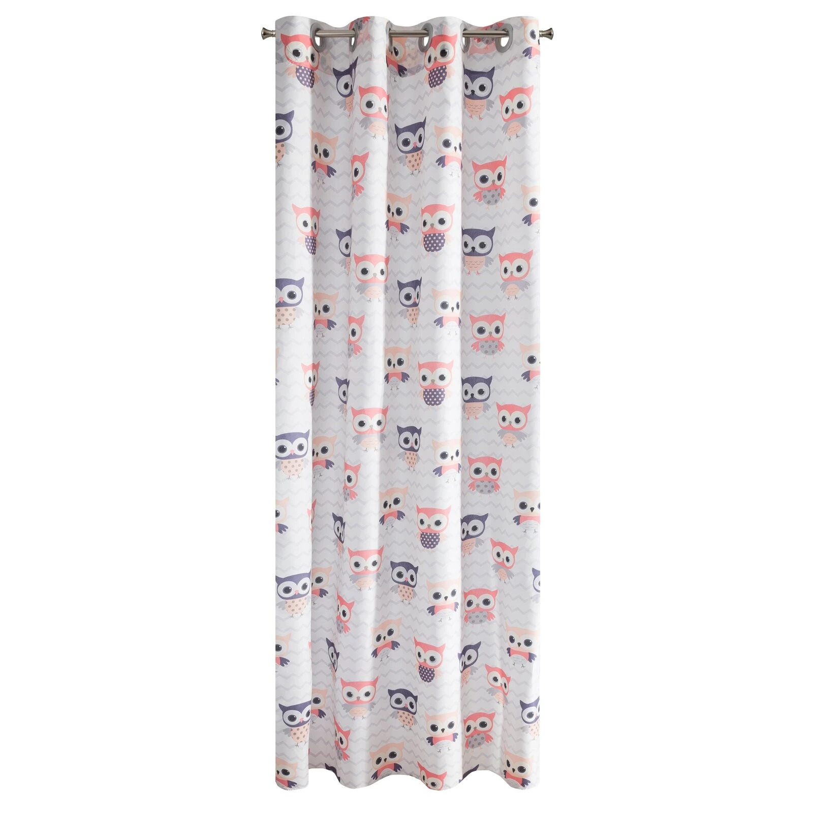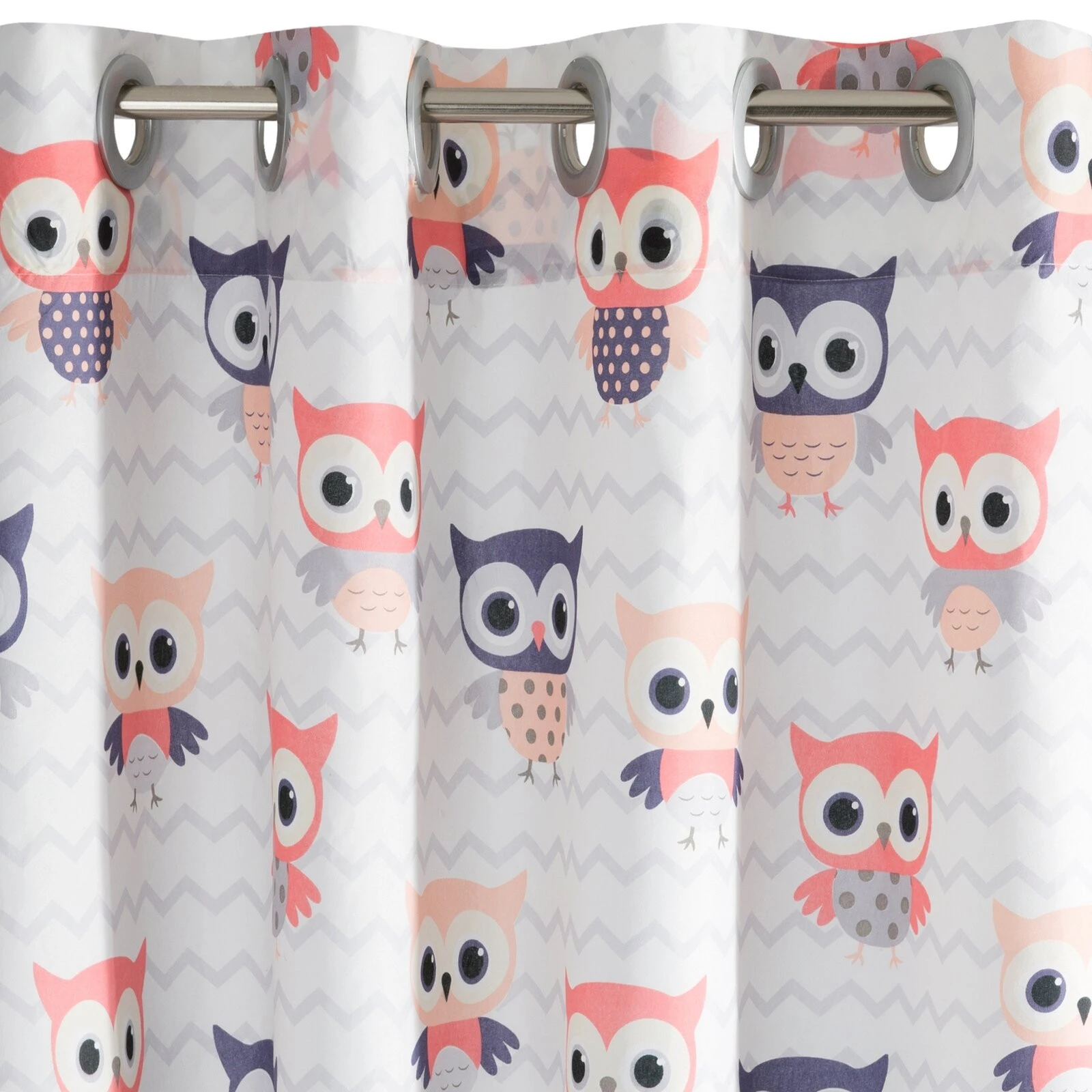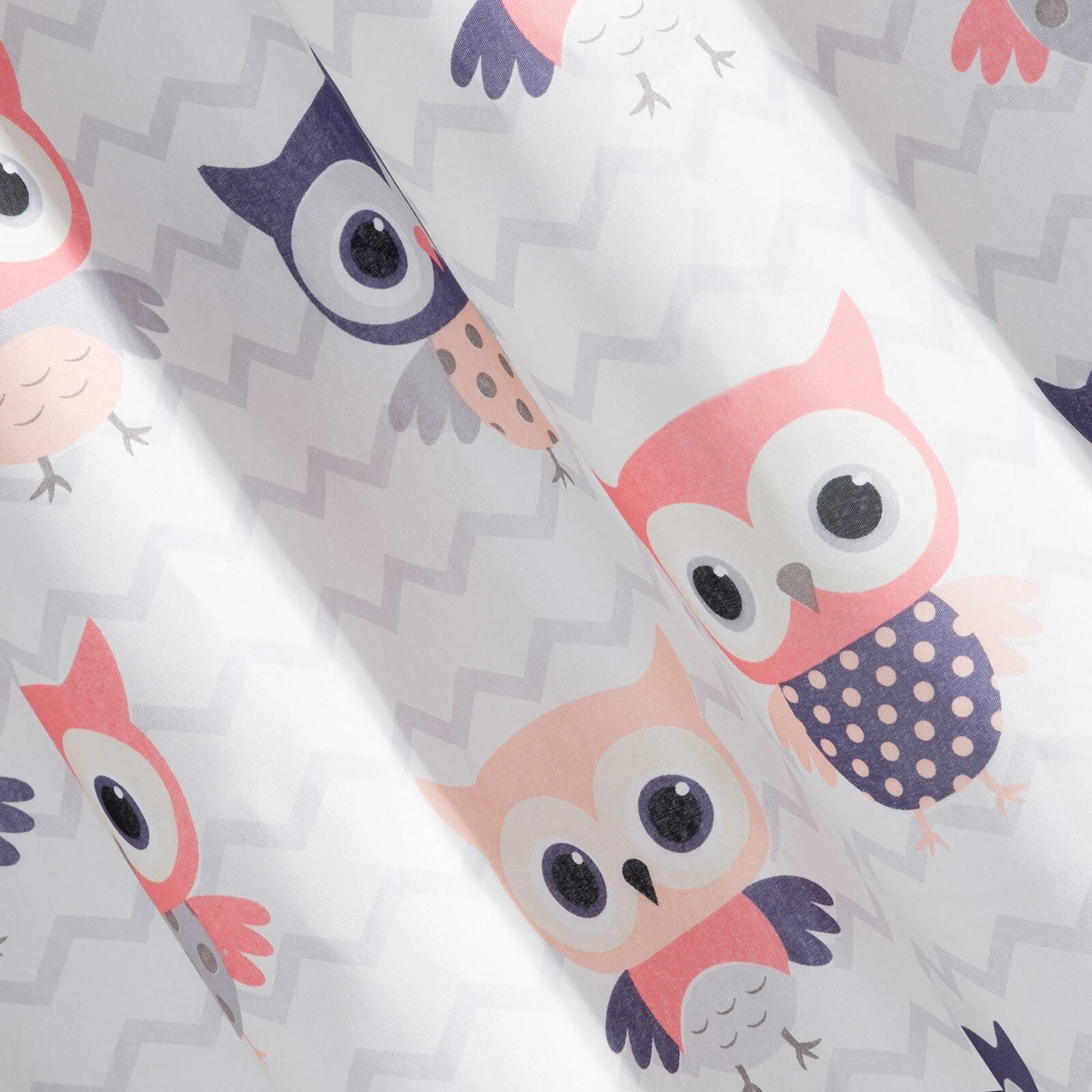 - Nowoczesna zasłona do pokoju dziecięcego o średnim stopniu zaciemnienia ozdobiona nadrukiem sów na zygzakowym tle. Lekka i zwiewna, łatwa do prasowania i prania szerokość: 140 cm, długość: 250 cm, kolor: biały, Gramatura: 75 GSM, Skład: 100% poliester