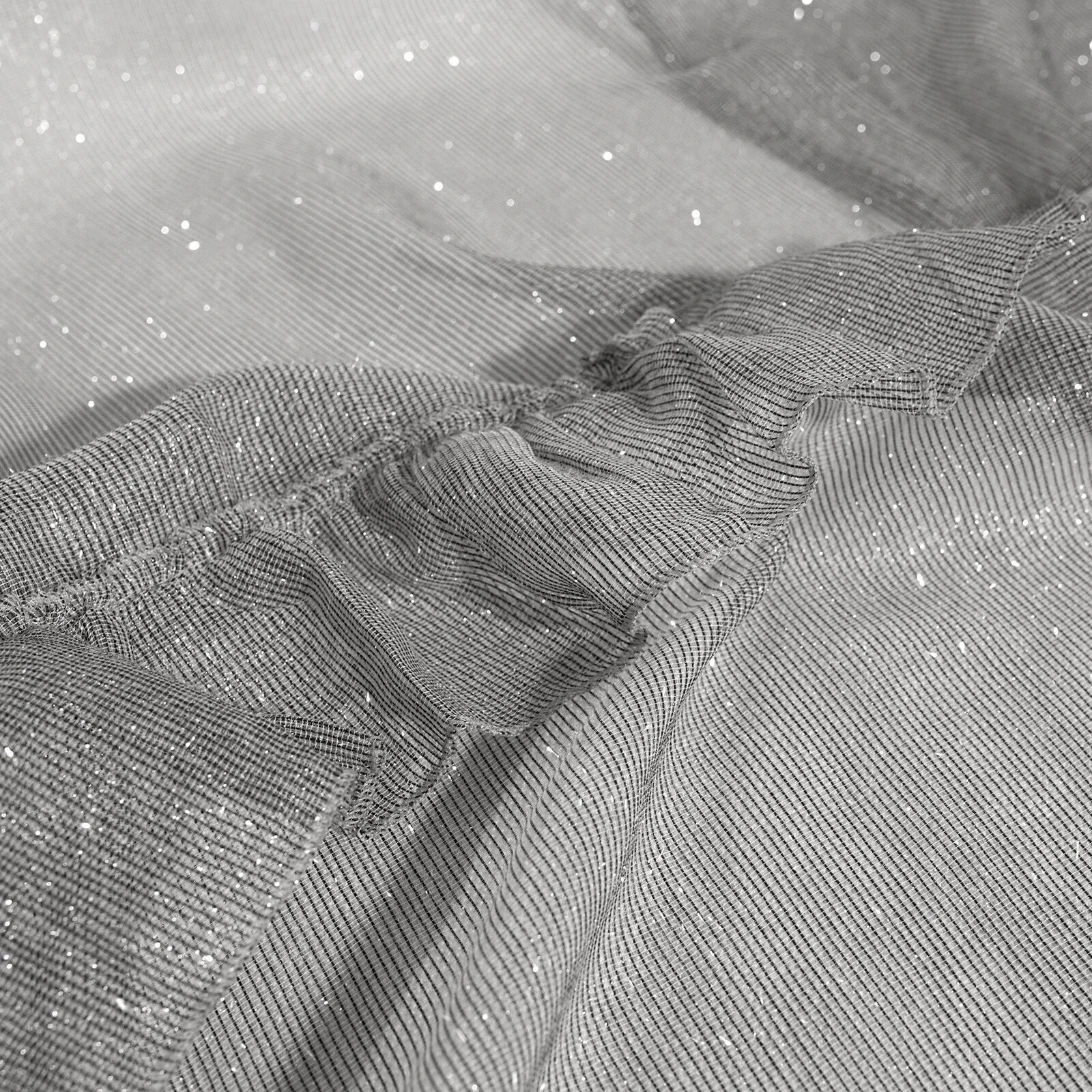 - Firana jednokolorowa z moherową błyszcząca nicią zdobiona falbanami szerokość: 140 cm, długość: 250 cm, kolor: szary, Gramatura: 50 GSM, Skład: 100% poliester