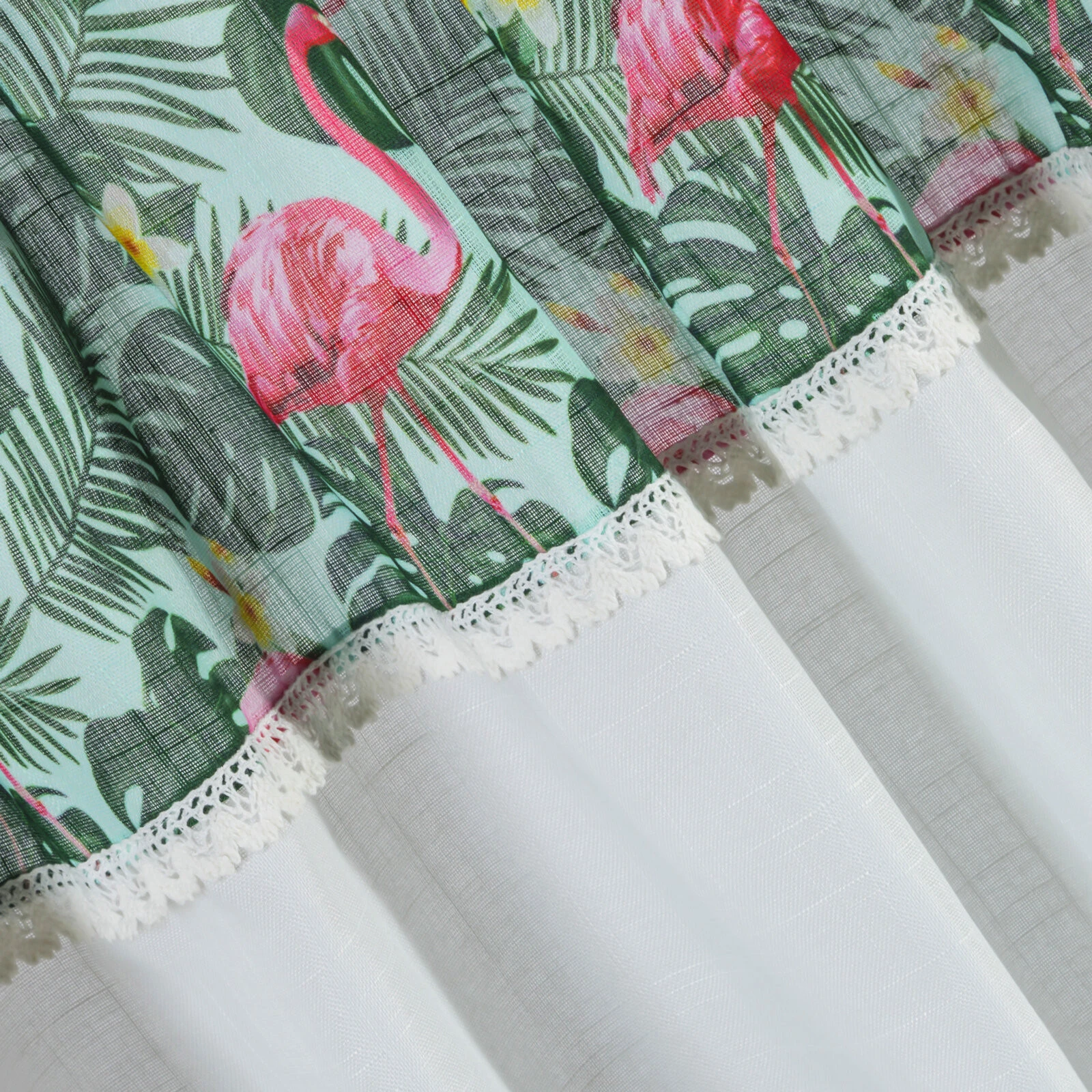 Zwiewna zasłona z półprzejrzystej takniny zdobiona w górnej części szeroką wstawką z welwetu drukowanego we wzór liści i flamingów oraz koronkową lamówką. szerokość: 140 cm, długość: 250 cm, kolor: biały, Gramatura: 110 GSM, Skład: 100% poliester