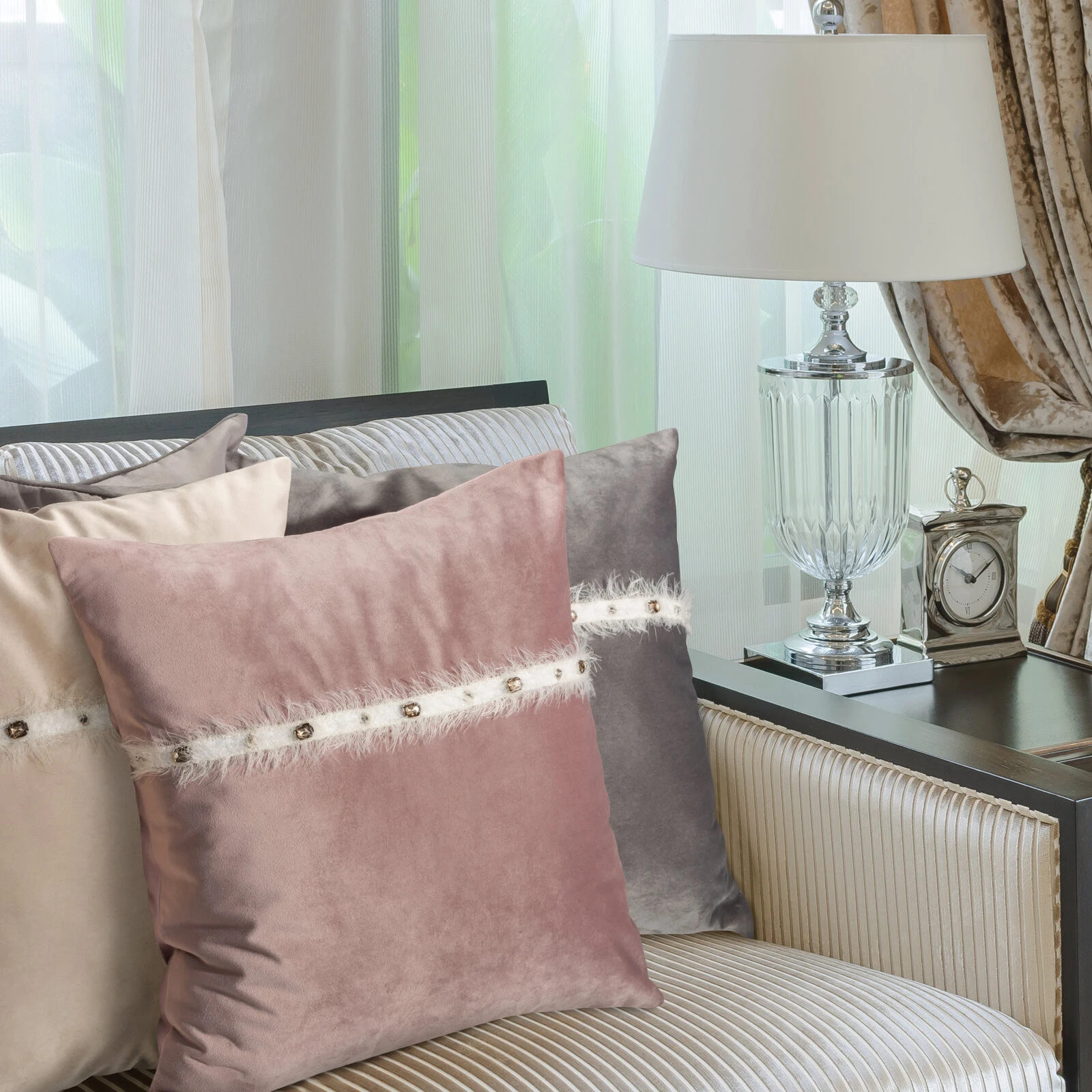 - Aksamitna poszewka na poduszkę zdobiona taśmą z delikatnymi włoskami i kryształkami. Zapinana na zamek błyskawiczny. szerokość: 45 cm, długość: 45 cm, kolor: jasnobrązowy, Gramatura: 300 GSM, Skład: 100% poliester