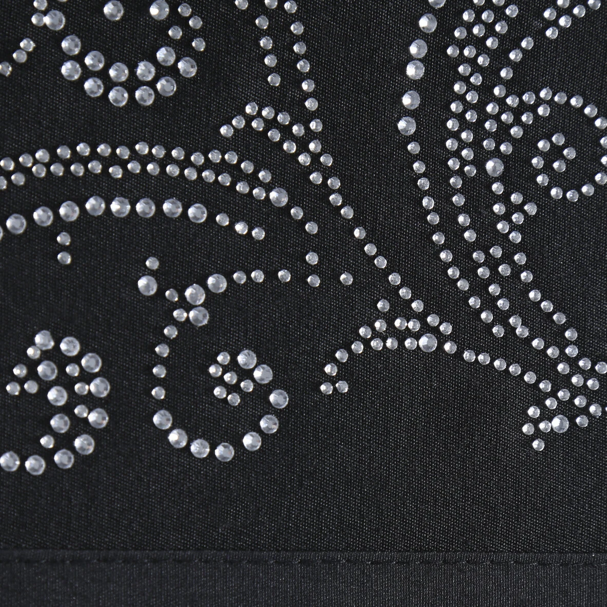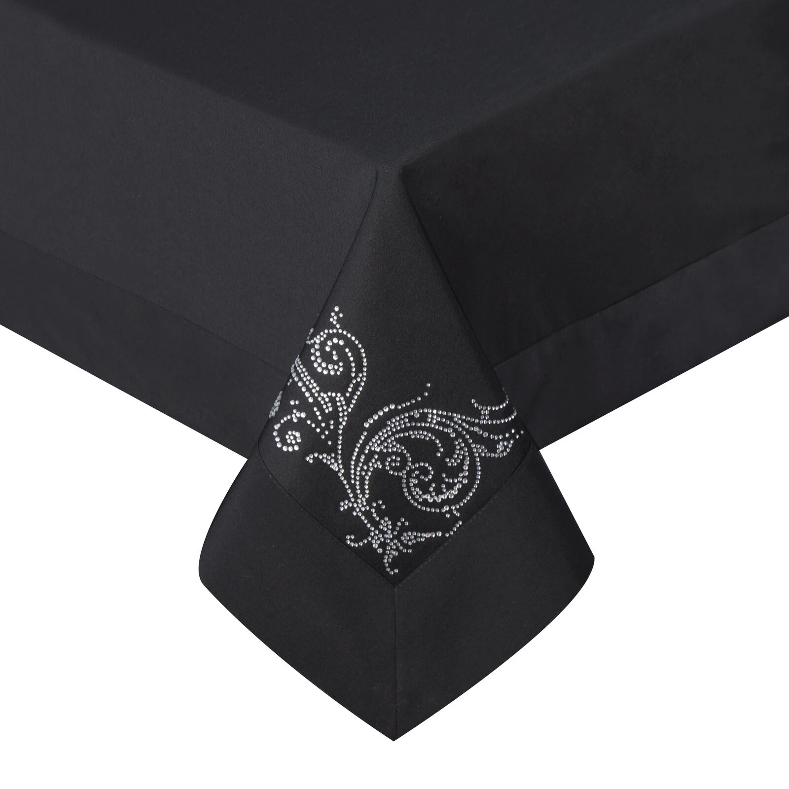Wysokiej jakości obrus stołowy z tkaniny łączącej bawełnę i poliester. Ekskluzywna dekoracja z listwą, zdobiona na na rogach lśniącą aplikacją z kryształów. szerokość: 160 cm, długość: 300 cm, kolor: czarny, Gramatura: 160 GSM, Skład: 50% bawełna, 50% poliester